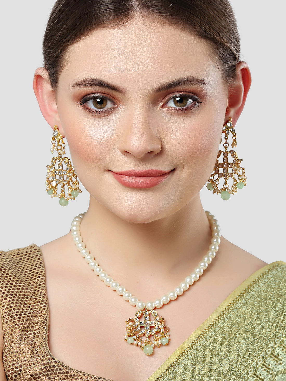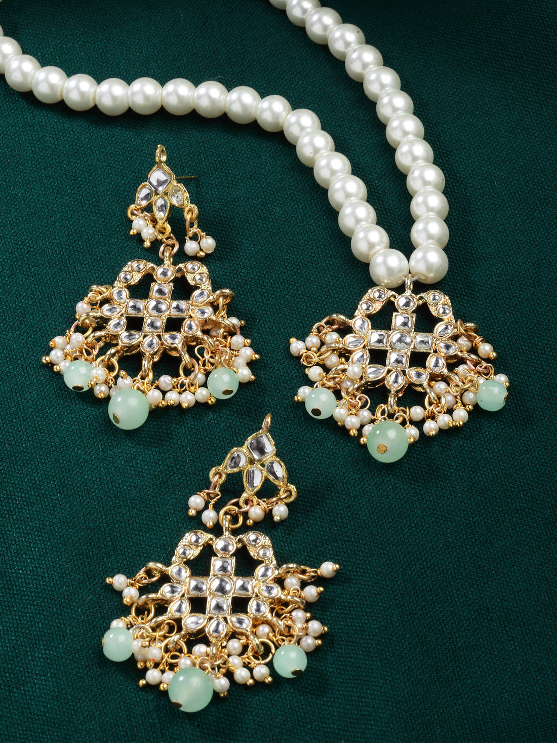 Karatcart Gold Plated Light Green Beads and Pearl Studded Kundan Necklace Set for Women. It...