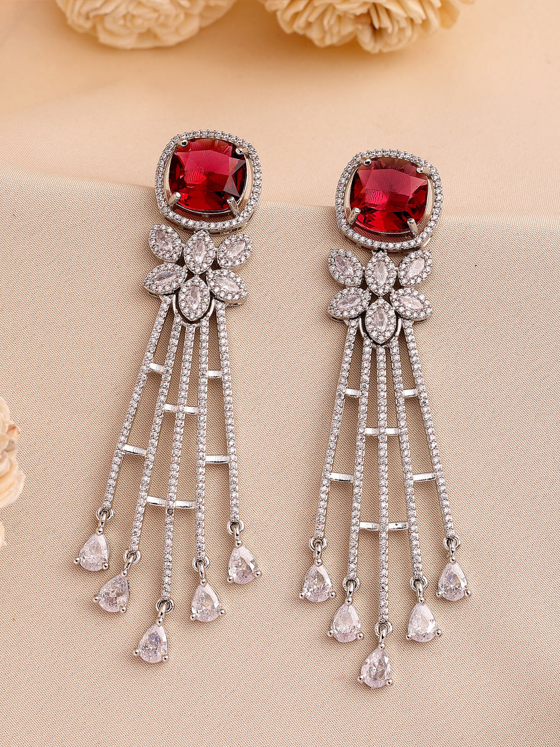 KARATCART Elegant Silver-Plated Red American Diamond Long Drop Earrings for Women