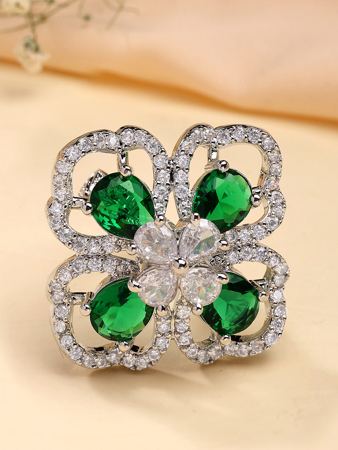 KARATCART Silver Plated green american diamond cocktail ring for women