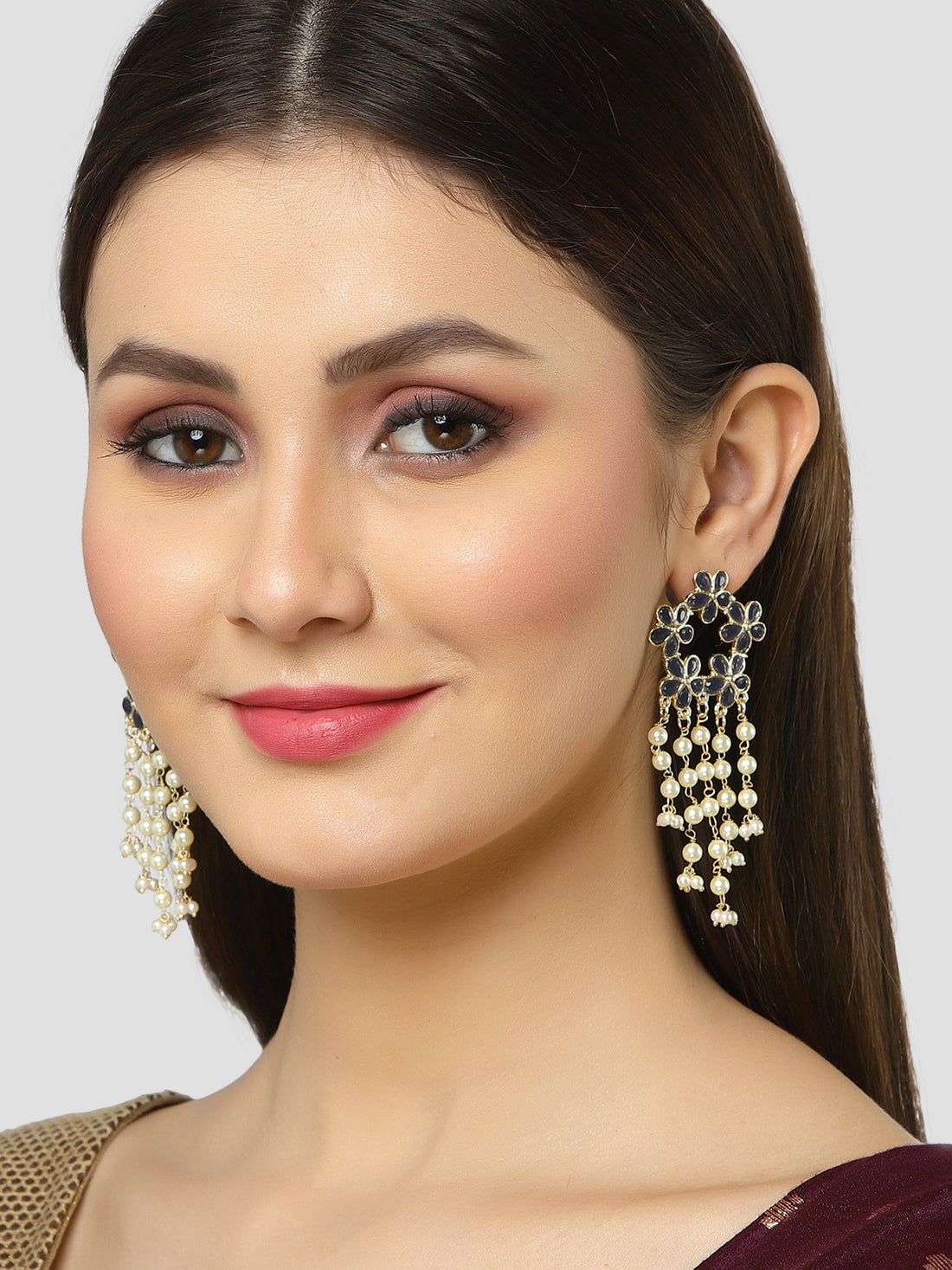 Karatcart Gold Plated Floral Design Blue Kundan Pearl Tassel Earrings for Women