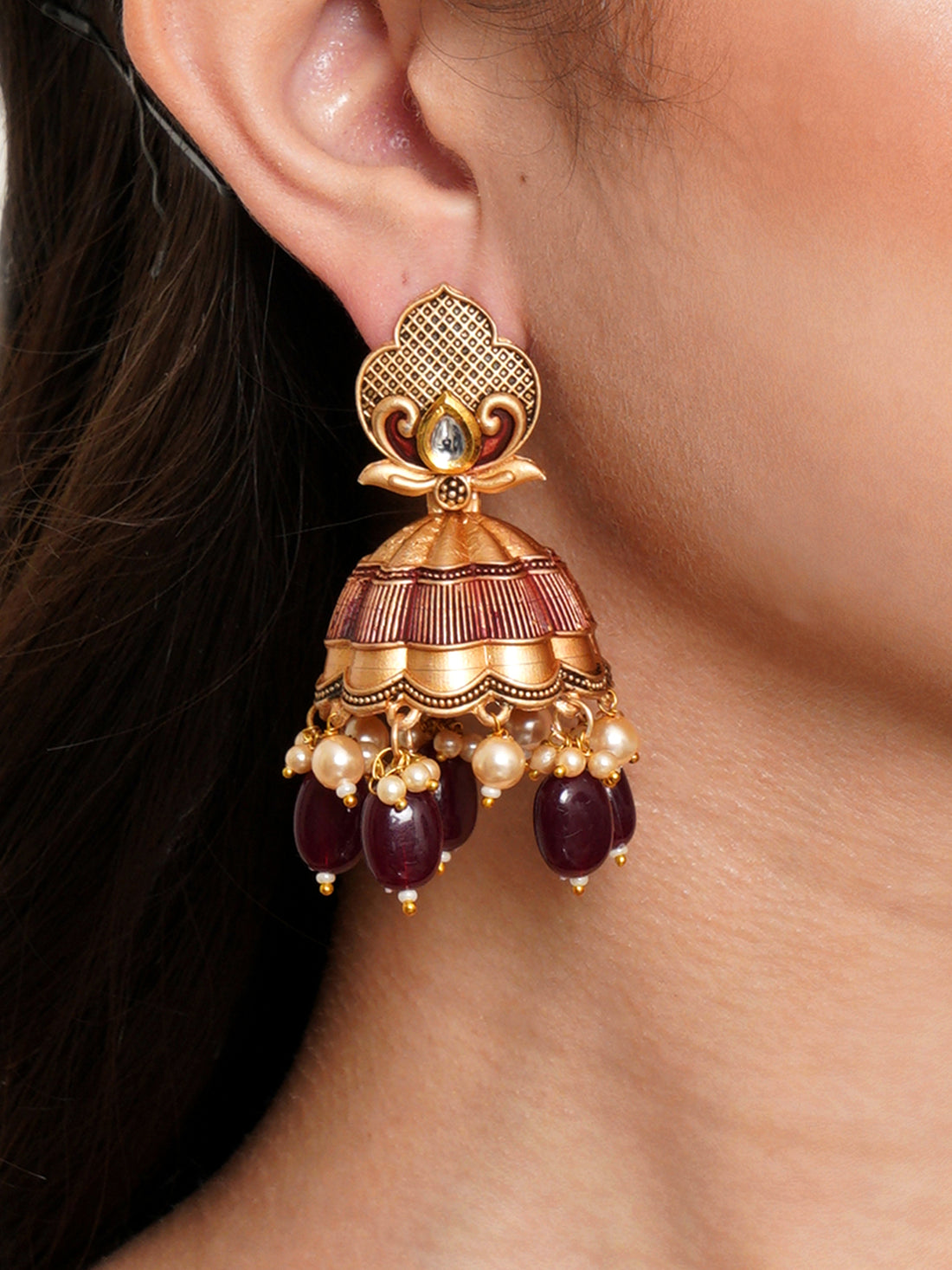 Karatcart Gold Plated Maroon Tumble and Golden Pearl Studded Jhumki Earrings for Women