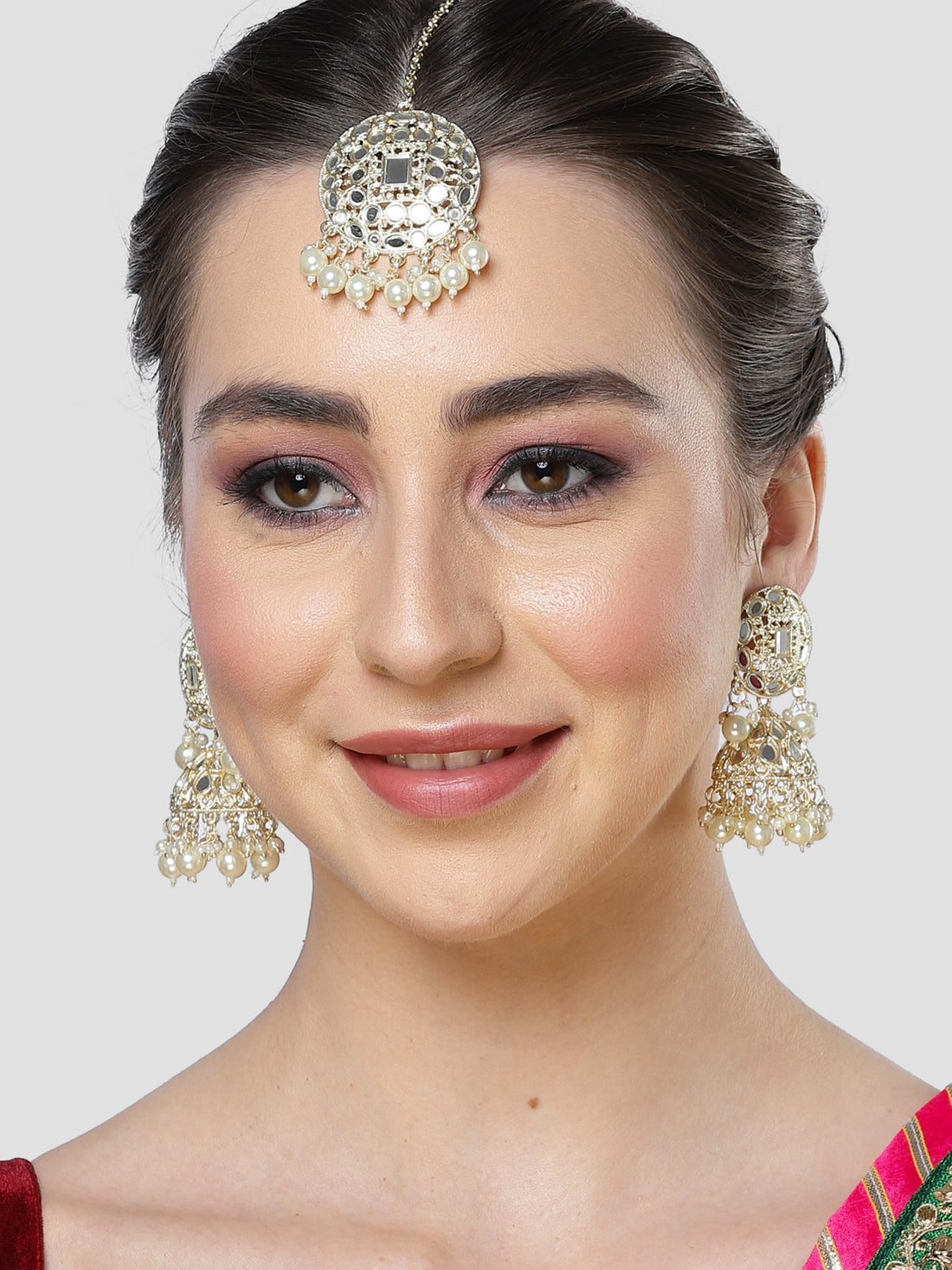 Karatcart Gold Plated Mirror and Pearl Studded Round Jhumki Earring and Maangtikka Set