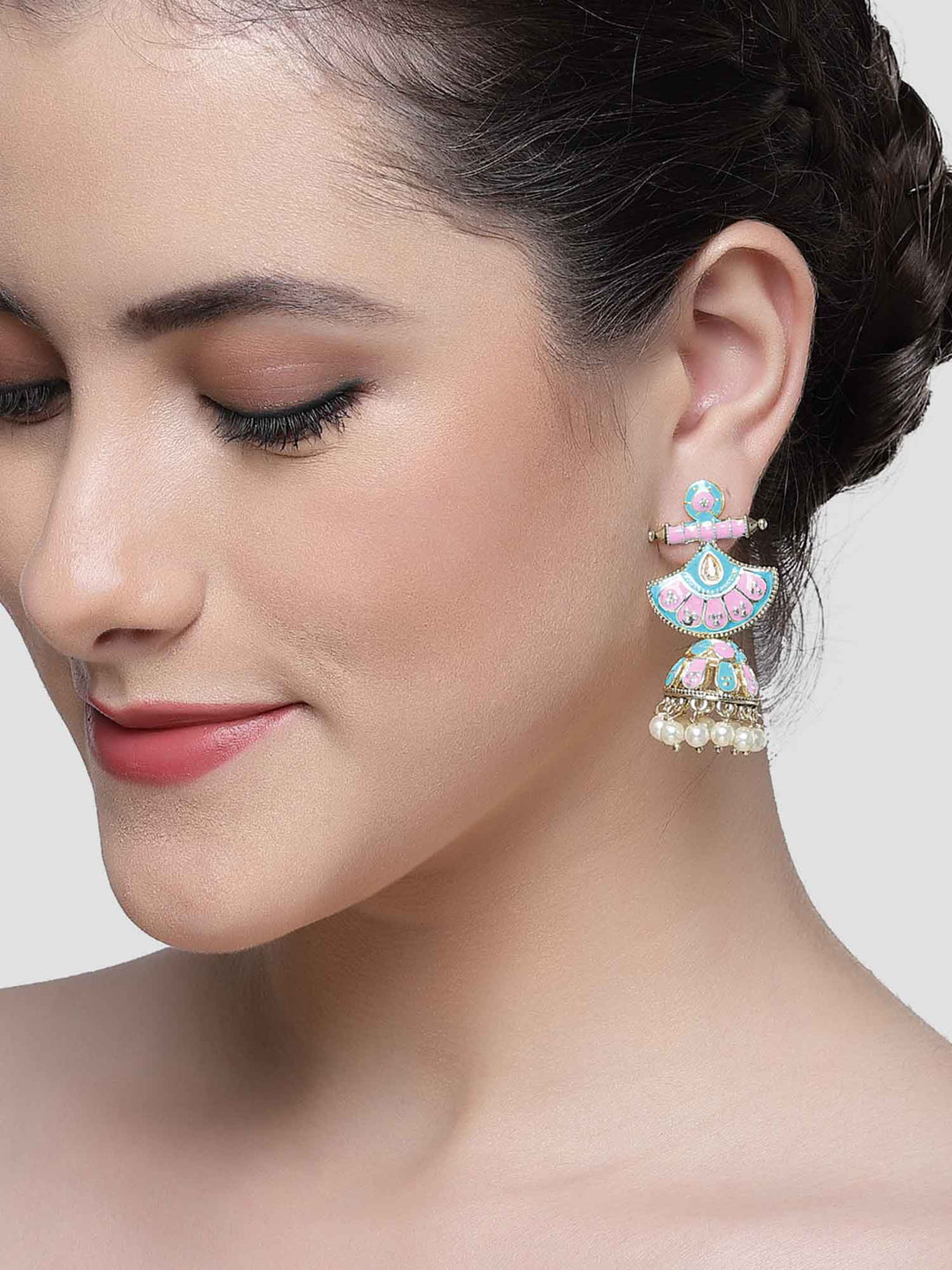 Karatcart Gold Plated Pink and Light Blue Meena Jhumki Earrings for Women