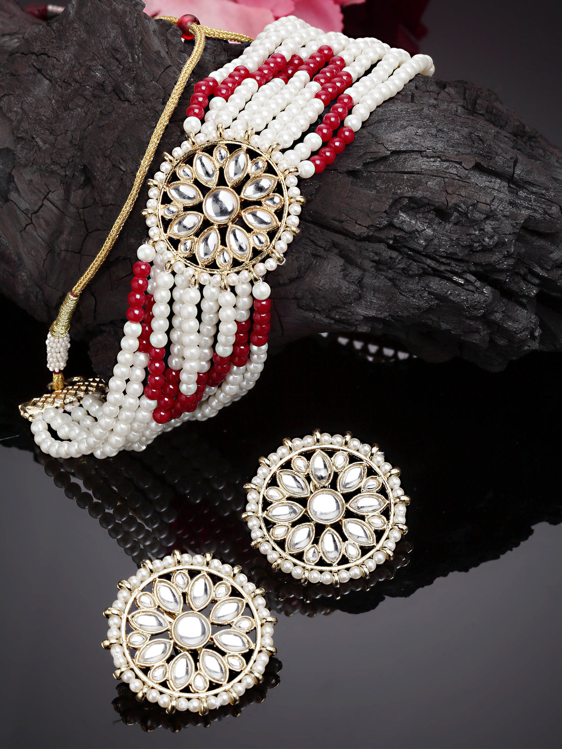 Karatcart Gold Plated White Pearl and Red Beads Kundan Choker Necklace Set for Women