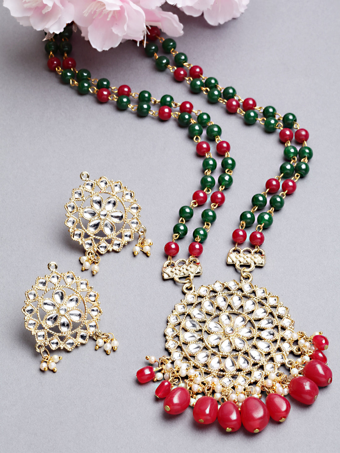 Karatcart Gold Plated Red and Green Beads Kundan Rani Haar Necklace Set for Women