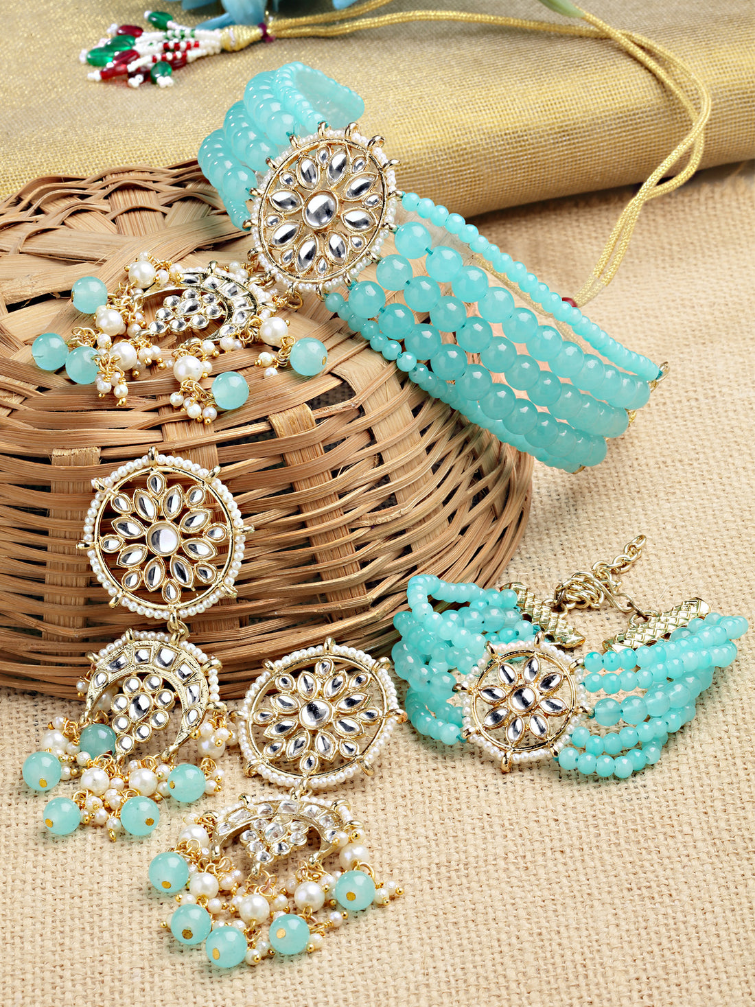 Karatcart Gold Plated Light Blue Beads Kundan Choker Necklace Set with Bracelet for Women