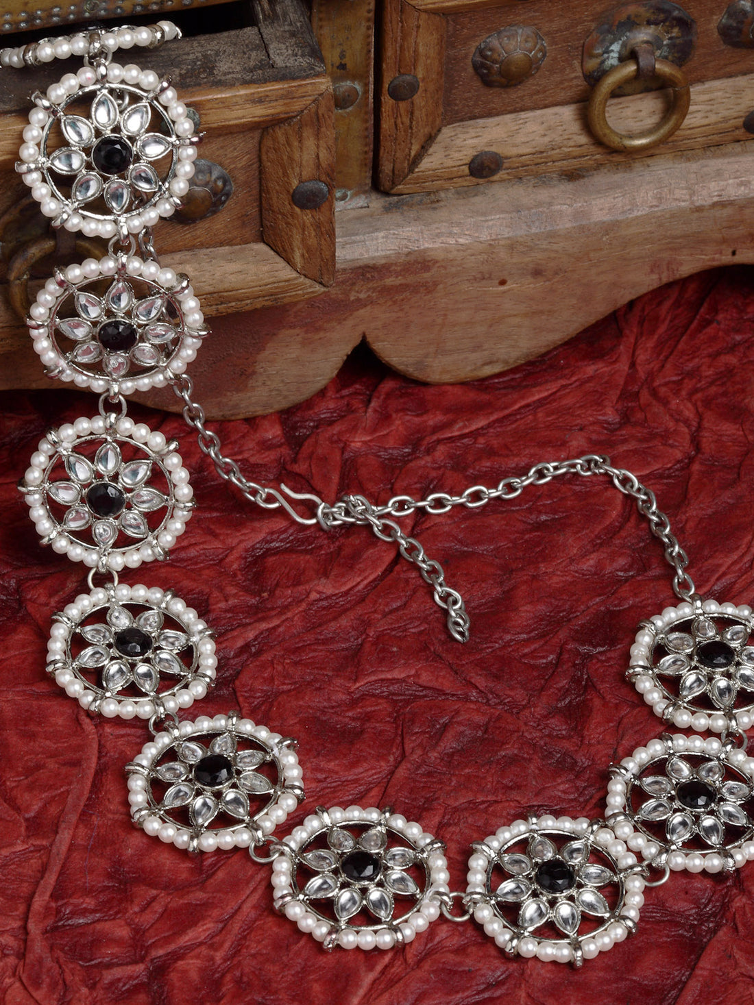 Women Silver-Toned & White Embellished Oxidised Silver White Kundan Hairband