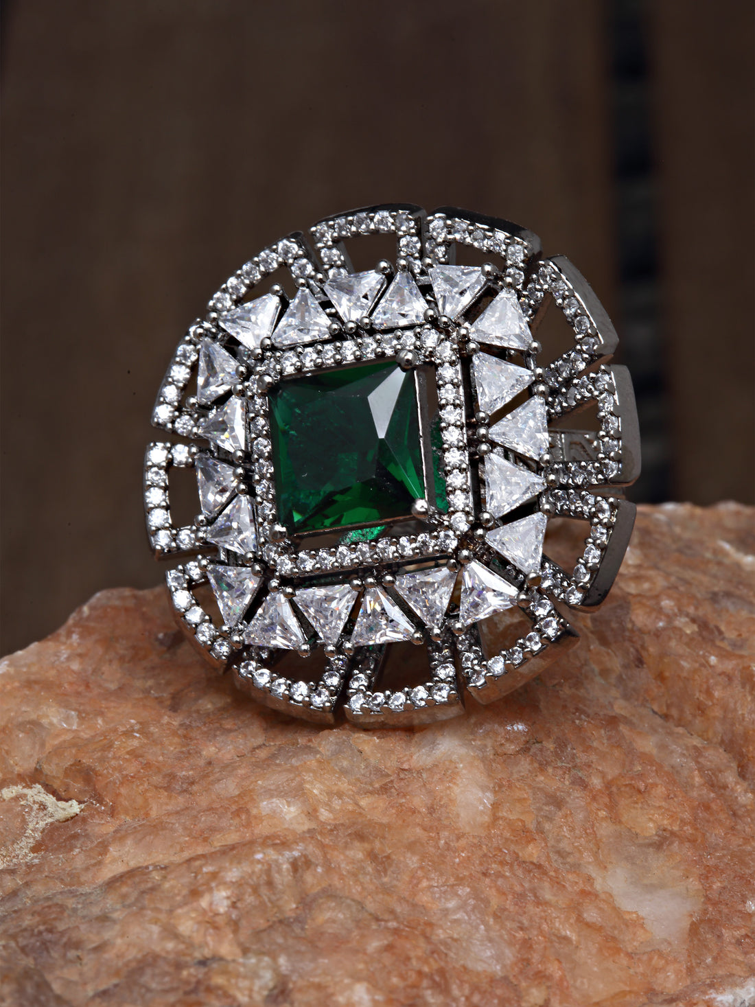 Karatcart Silver Tone Green American Diamond Floral Shape Women's Ring
