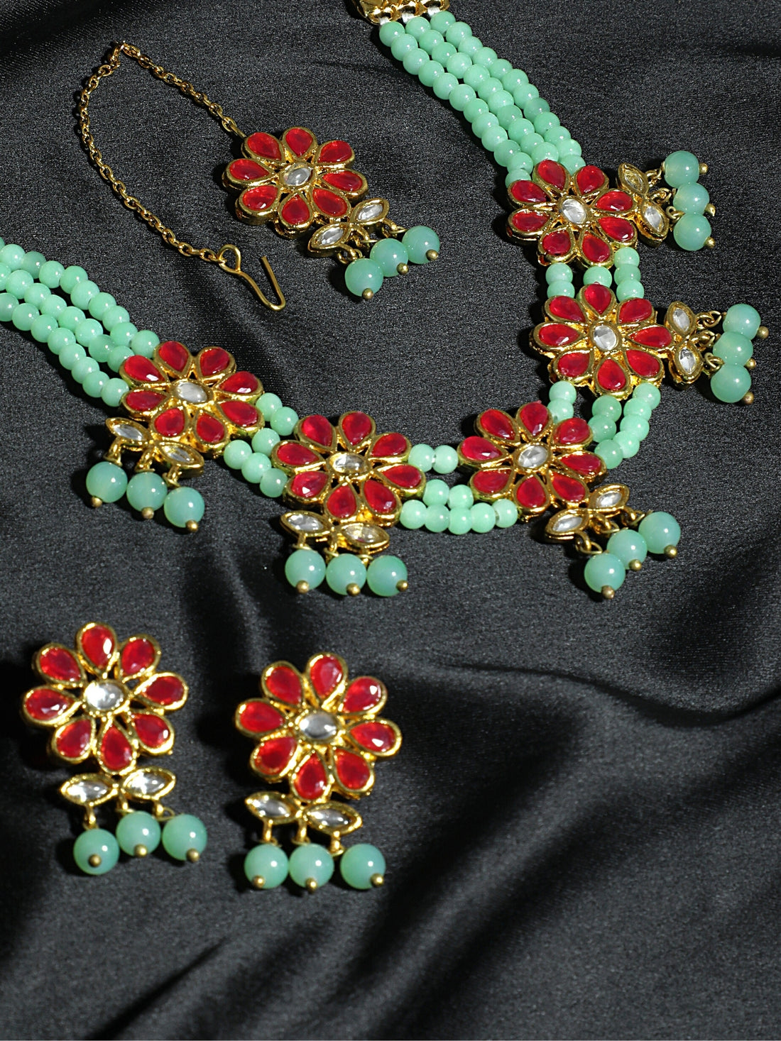 Kundan Red and Mint Green Beaded Choker Necklace Set