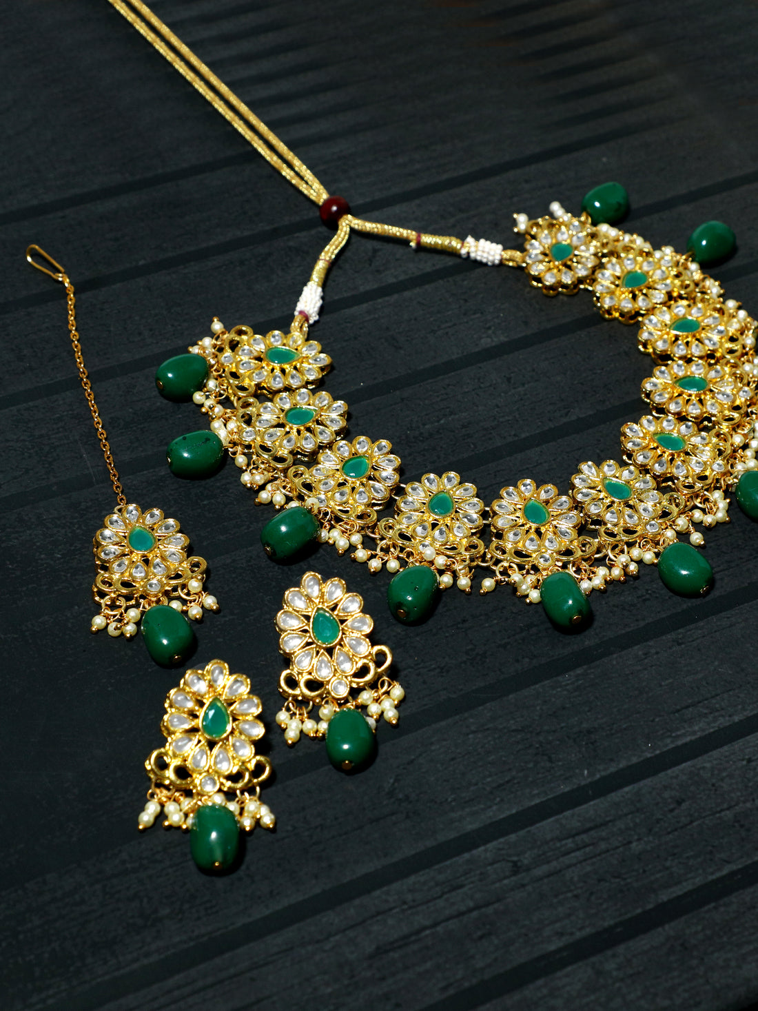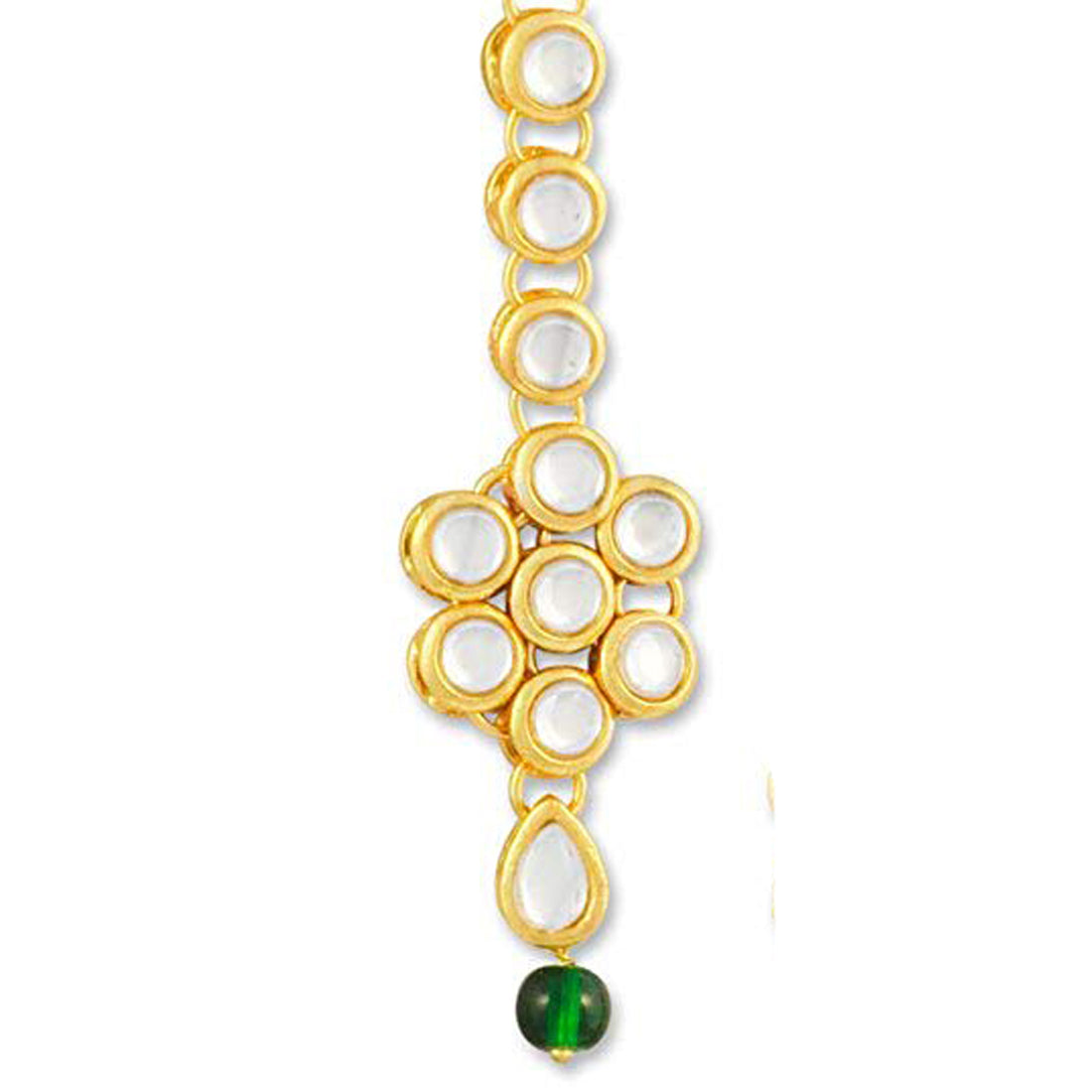 Traditional Gold Plated Green Beads Kundan Maangtikka for Women