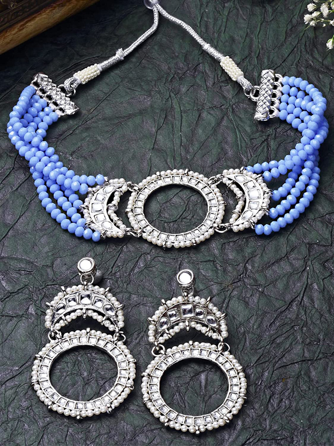 Karatcart Oxidised Silver Light Blue Crystal Choker Necklace Set. It is made with high-quality Kundan...