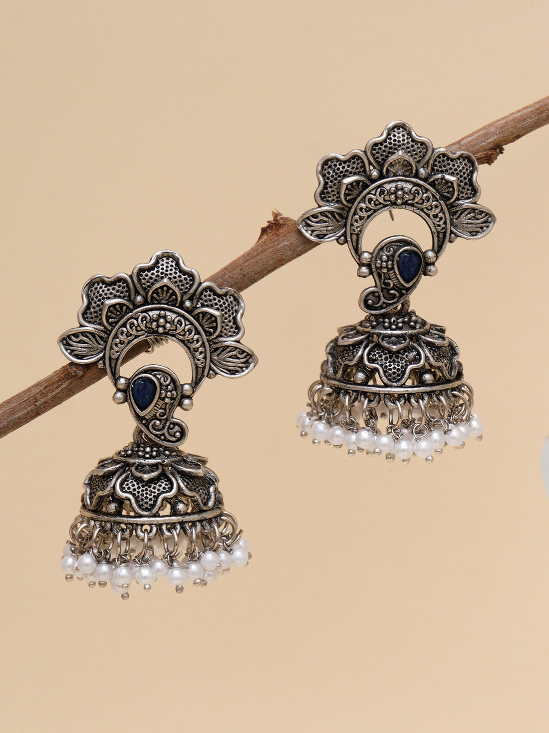 Karatcart Oxidised Silver Green Stone Floral Jhumki Studded with White Pearl for Women