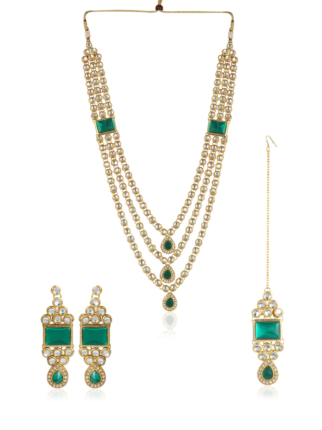 Gold-Plated Green & White Kundan Stone-Studded & Beaded Bridal Jewellery Set