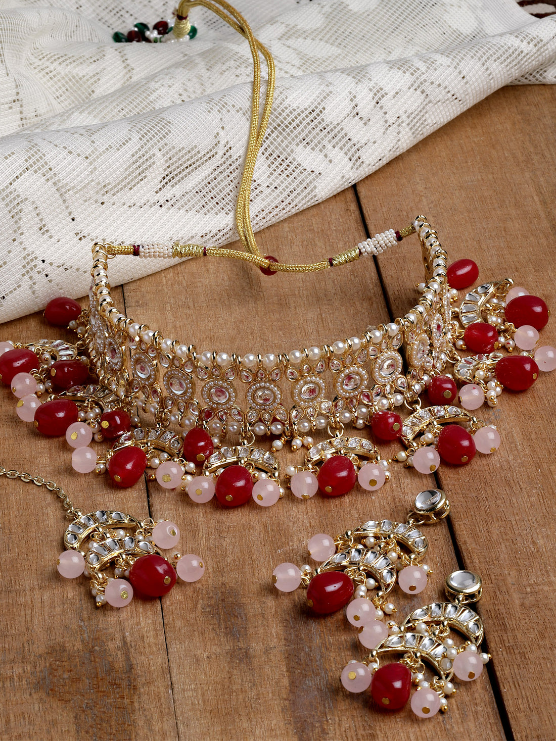 Karatcart Gold Plated Red Tumble and Pink Beads Choker Necklace Set