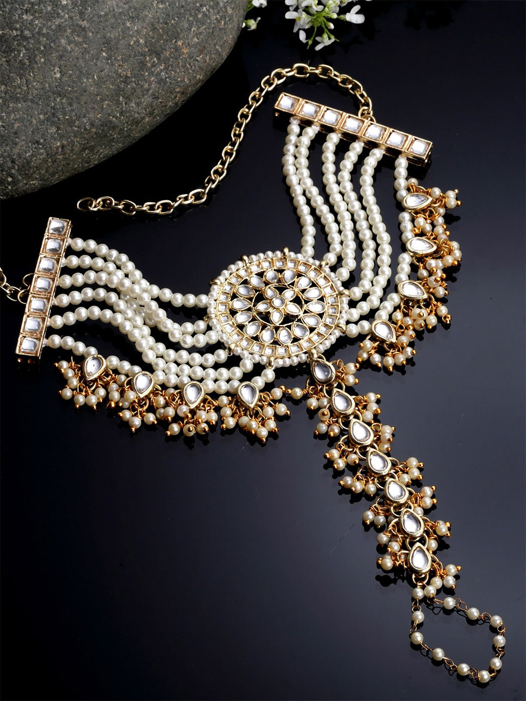 Stylish Gold-Plated Kundan Pearl Chain Hathphool for Woman. It's Five Layer Micro Gold Plated and...