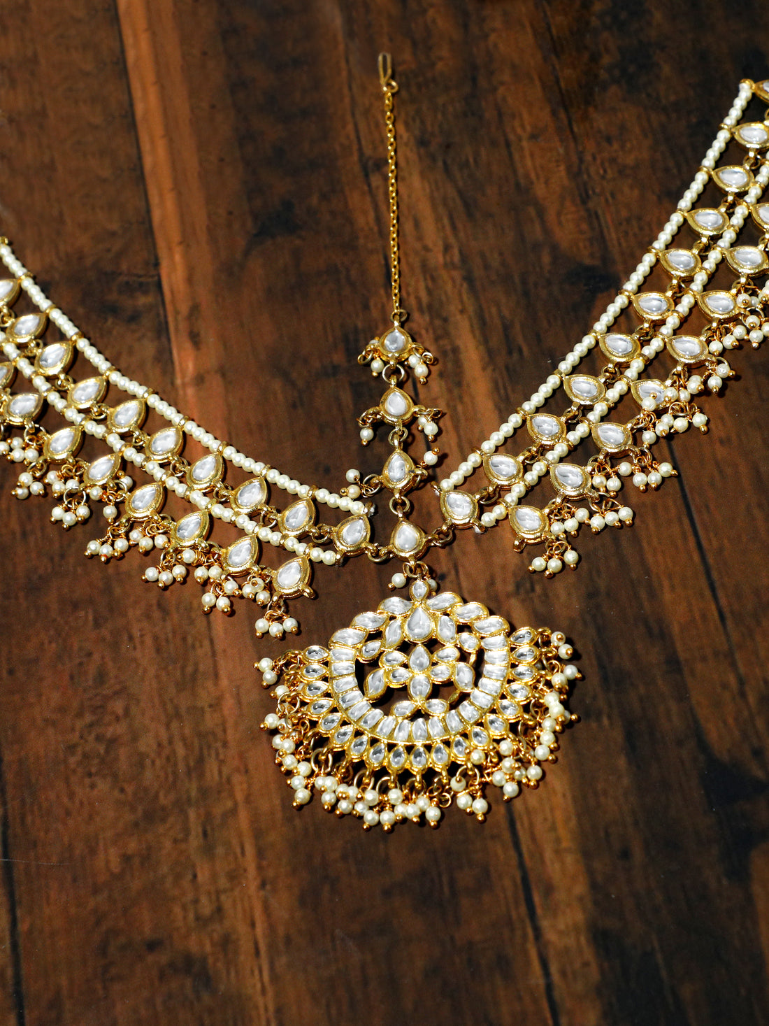 Gold-Tone Multilayered Kundan Mathapatti with Pearl Beads