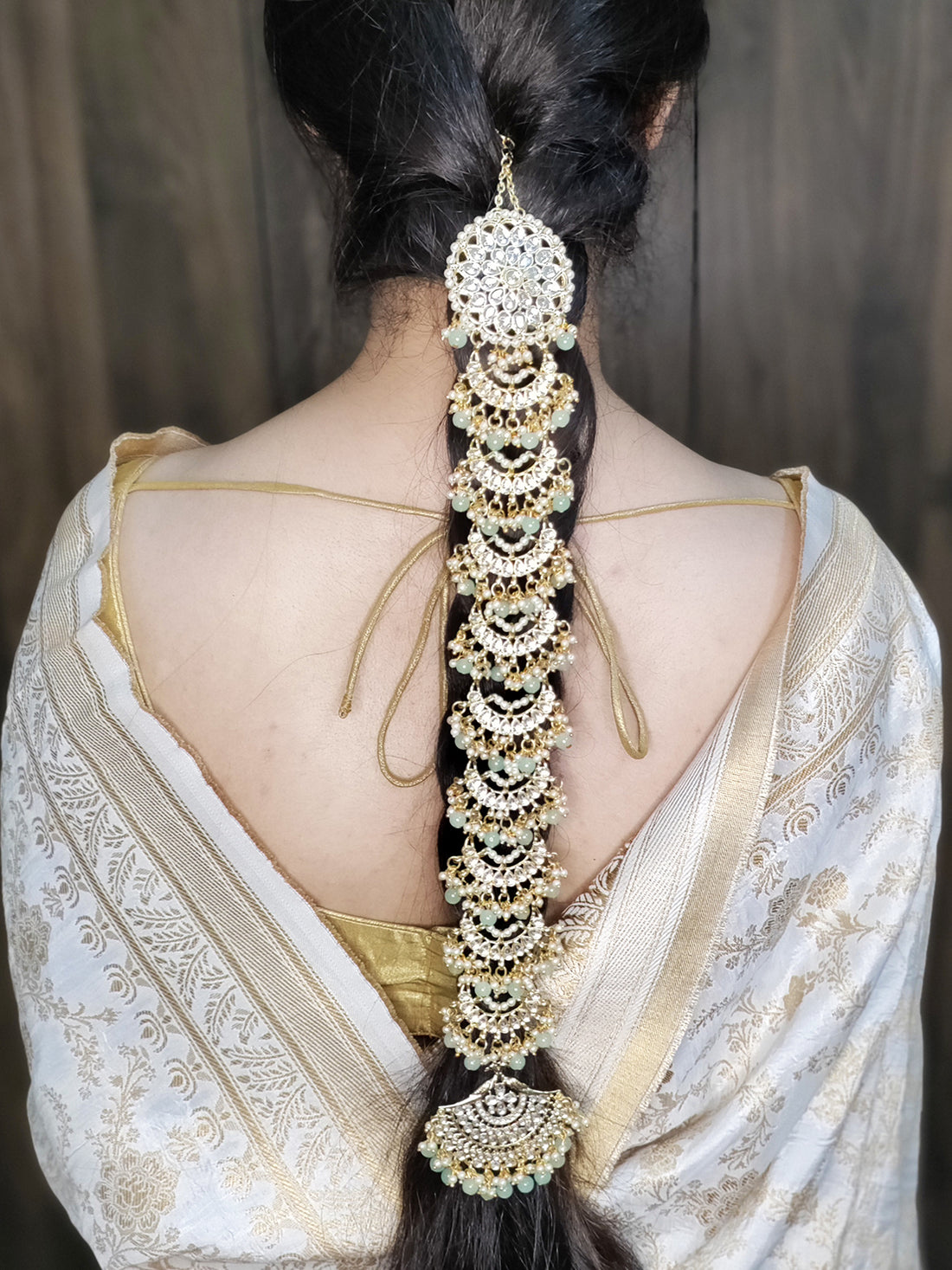 Karatcart Light Green Beads Gold Plated Handcrafted Kundan Bridal Wedding Hair Braid Choti