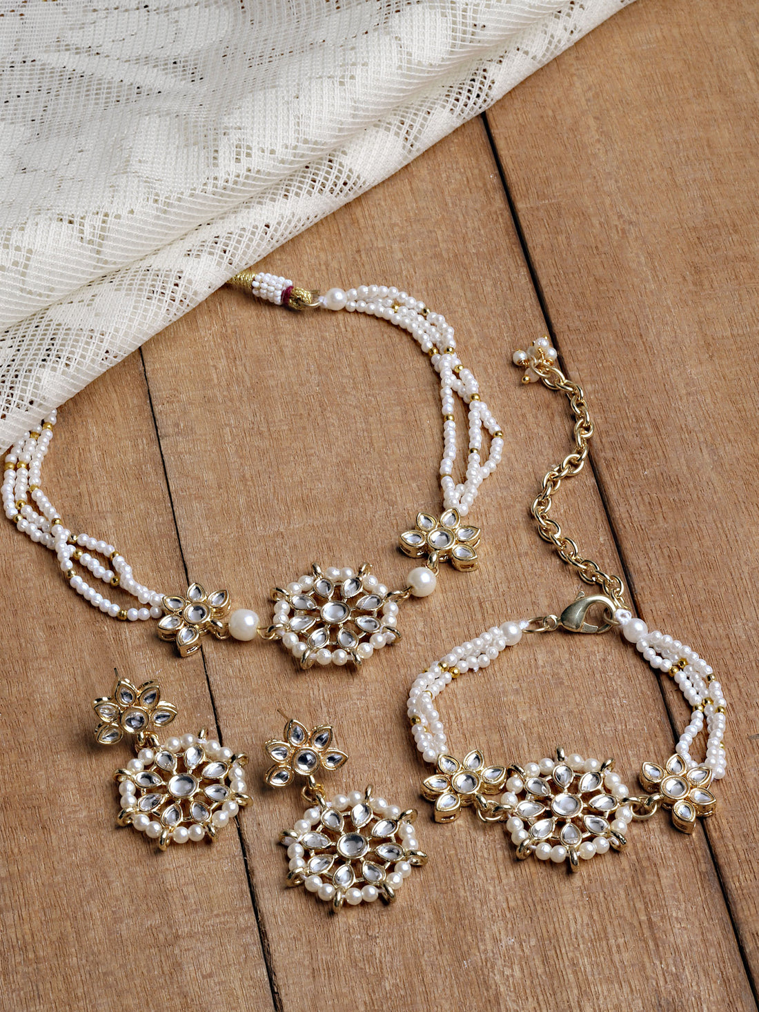 Karatcart Gold Plated Floral Pearl Beaded Choker Necklace with Earrings and Bracelet