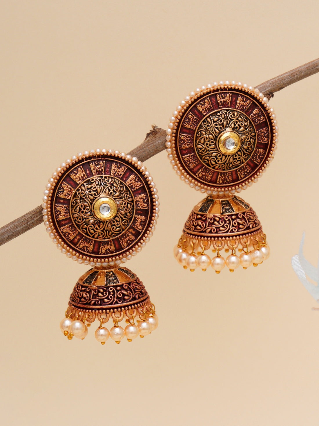 Karatcart Gold Plated Antique Floral Design Maroon Jhumki Earrings for Women