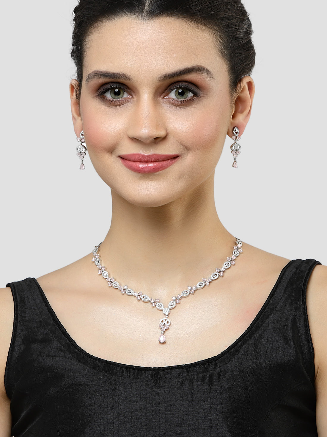 Karatcart Silver Plated Pink Cubic Zirconia Studded Necklace Set