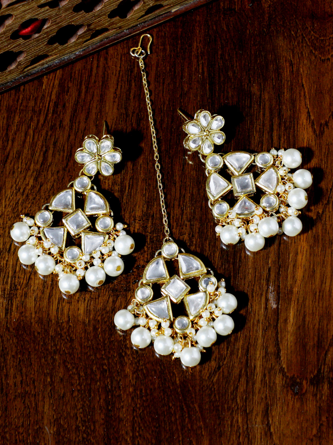 Pearl Beads Kundan Dangler Earrings with Maangtikka