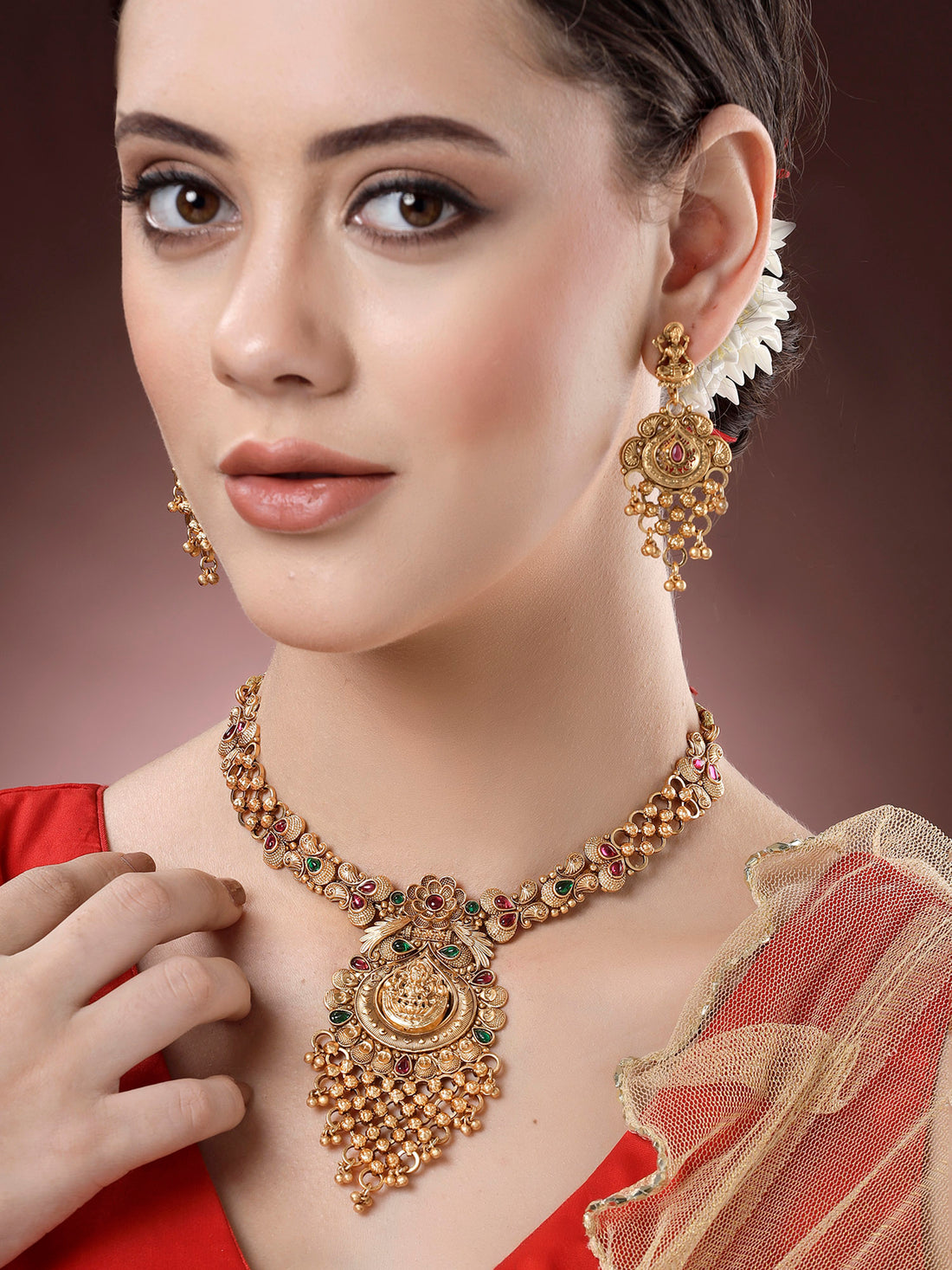 Karatcart Red and Green Stone Gold Plated Laxmi Mata Temple Jewellery Set for Women. Our...