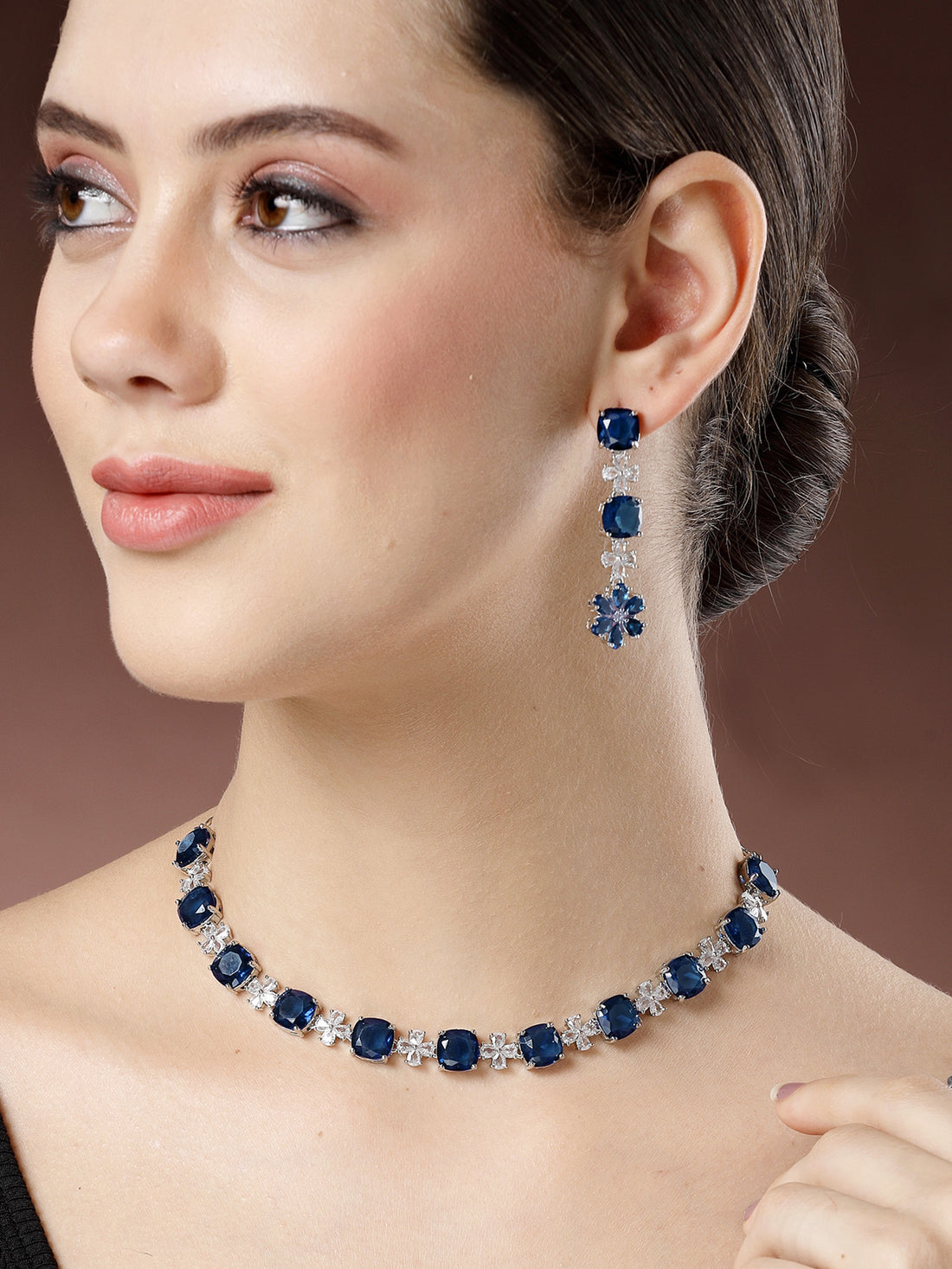 Karatcart Silver Plated Blue Floral Cubic Zirconia Studded Necklace Set for Women