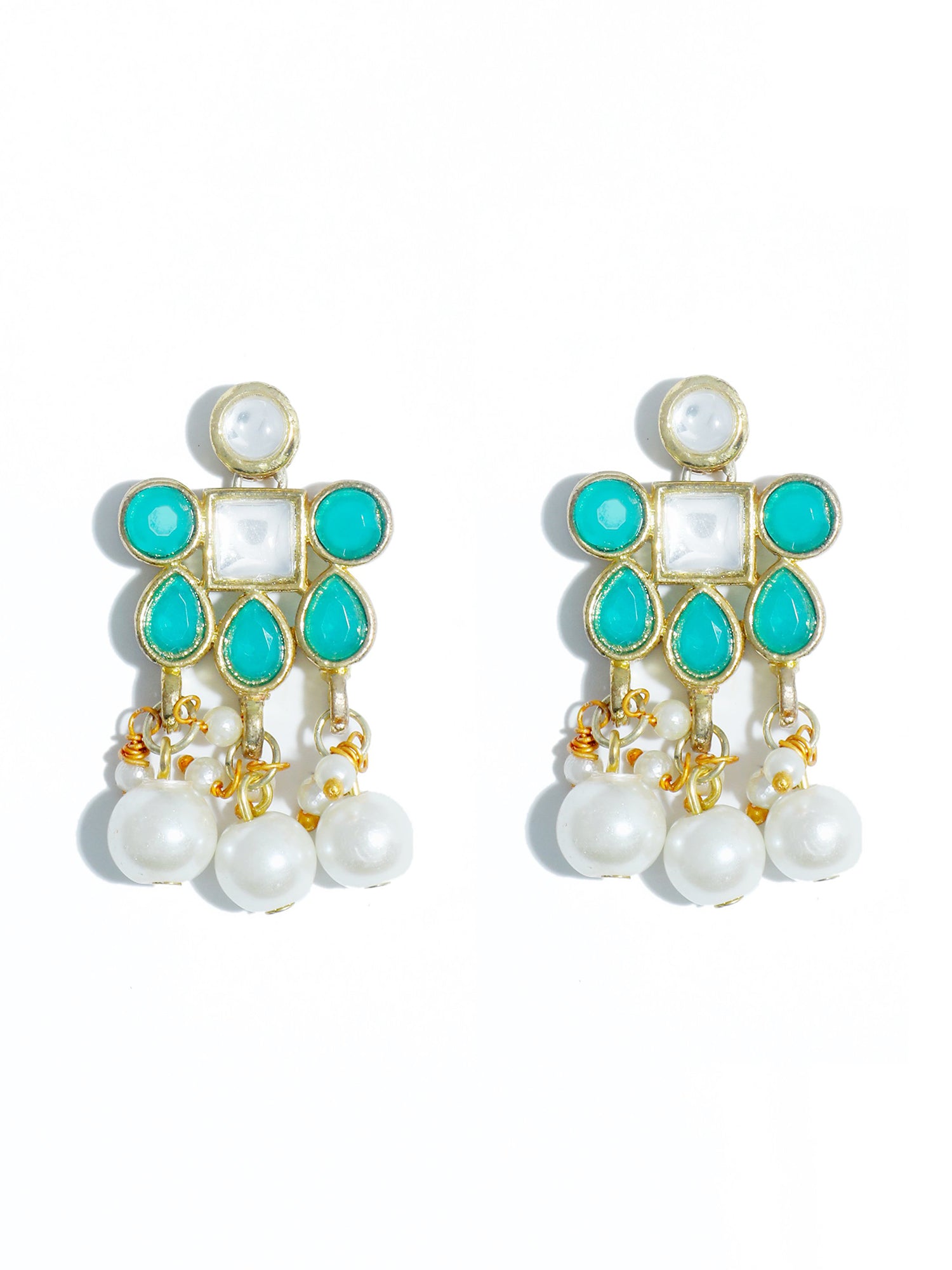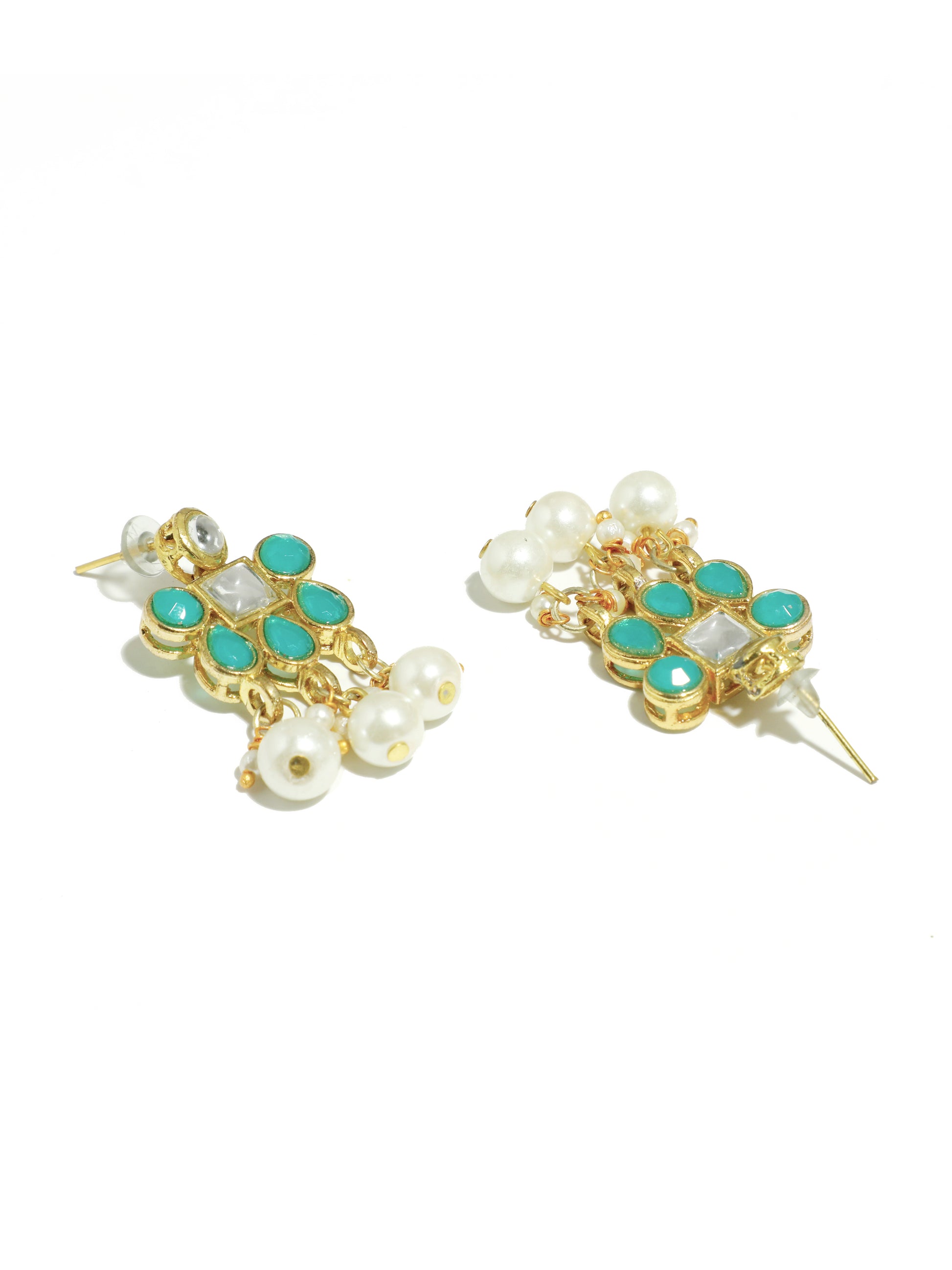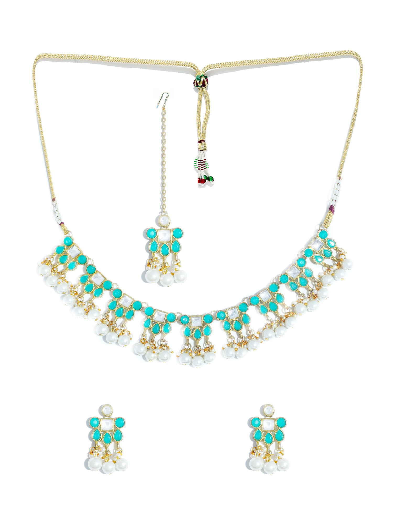 Enhance your elegance with this exquisite set features a stunning choker necklace adorned with intricate Kundan stones, radiating a captivating light blue hue that adds a touch of sophistication to any outfit. The set is expertly gold-plated, offering a luxurious shine and durability that ensures it remains a timeless addition to your jewelry collection.