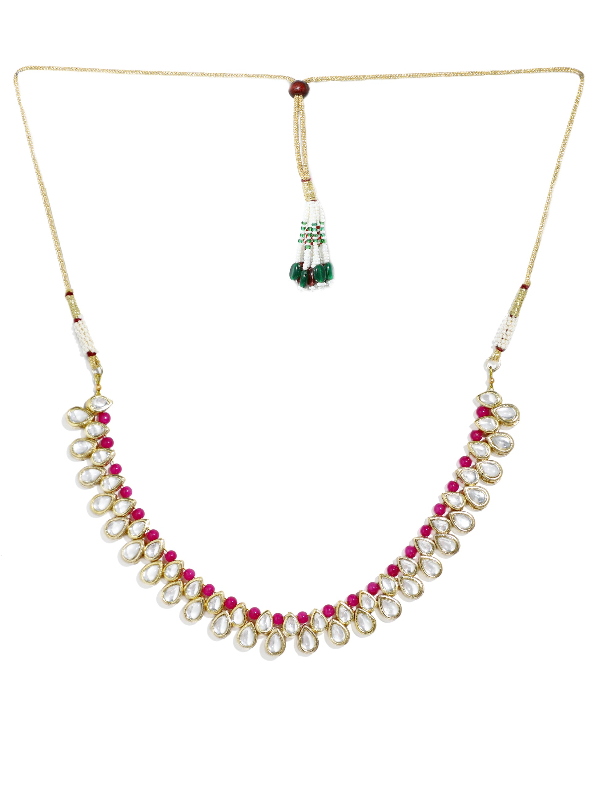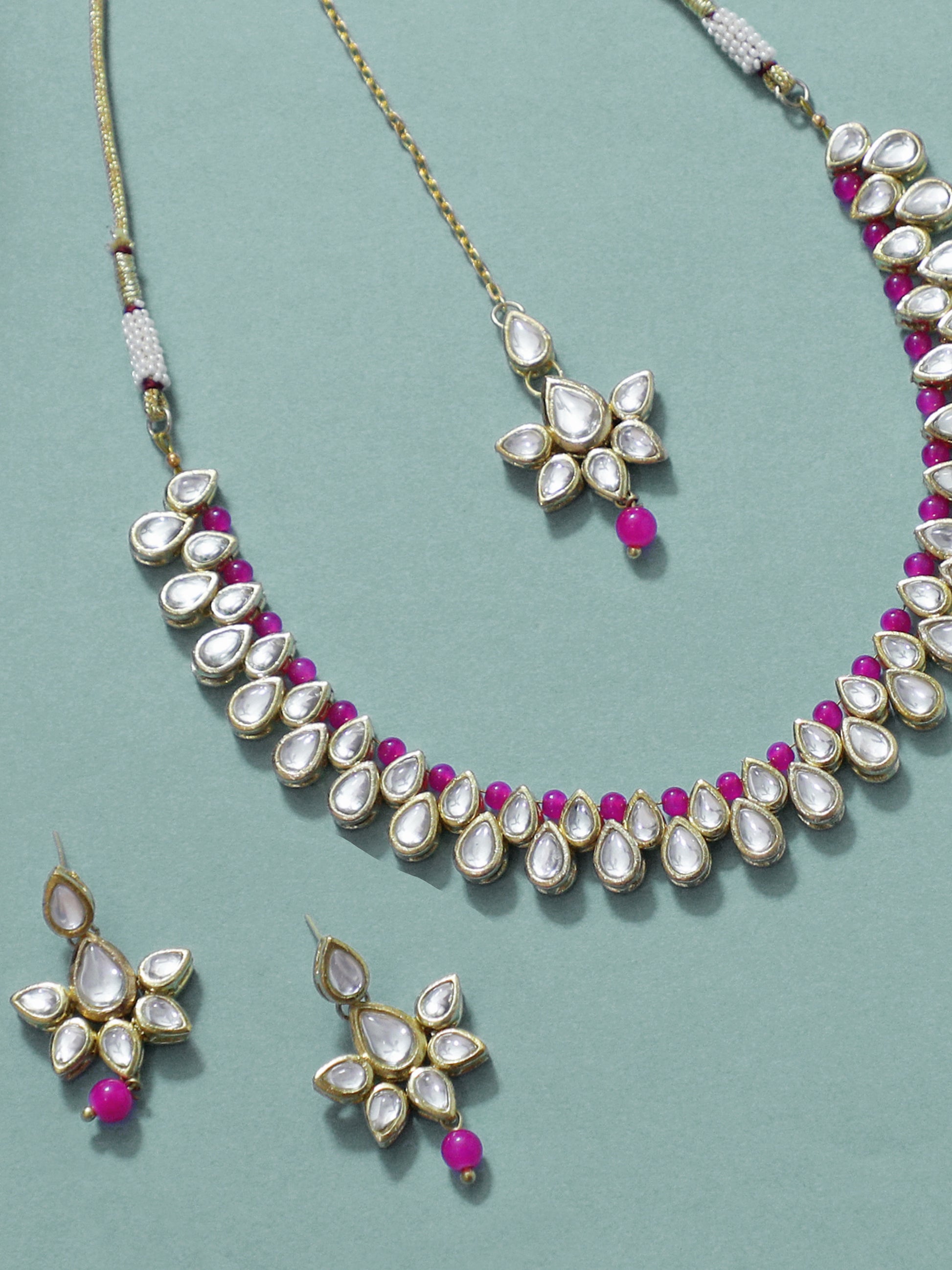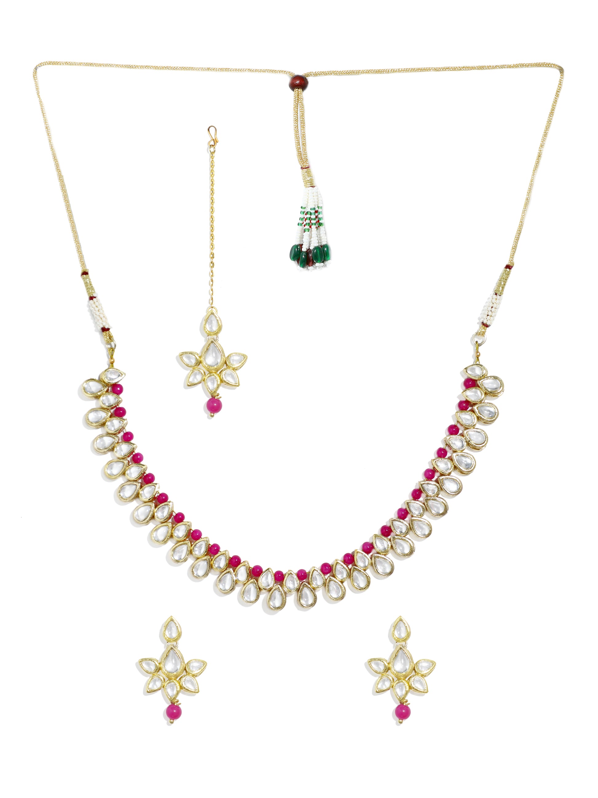 - Pink Beads Studded Kundan Choker Necklace with Earrings and Maangtikka. It's Five Layer Micro Gold Plated and Embellished with Elegant Kundan for High Durability. Intricate high polish creates glamorous reflections and adds a luxurious look. Perfect for Weddings, Festivals, Traditional Occasions. Best when paired with any Indian outfit.