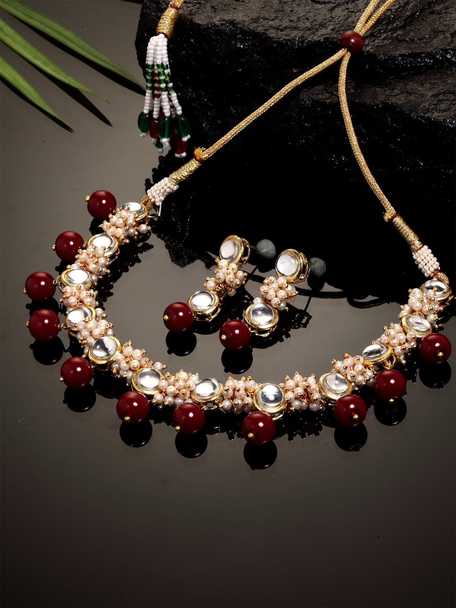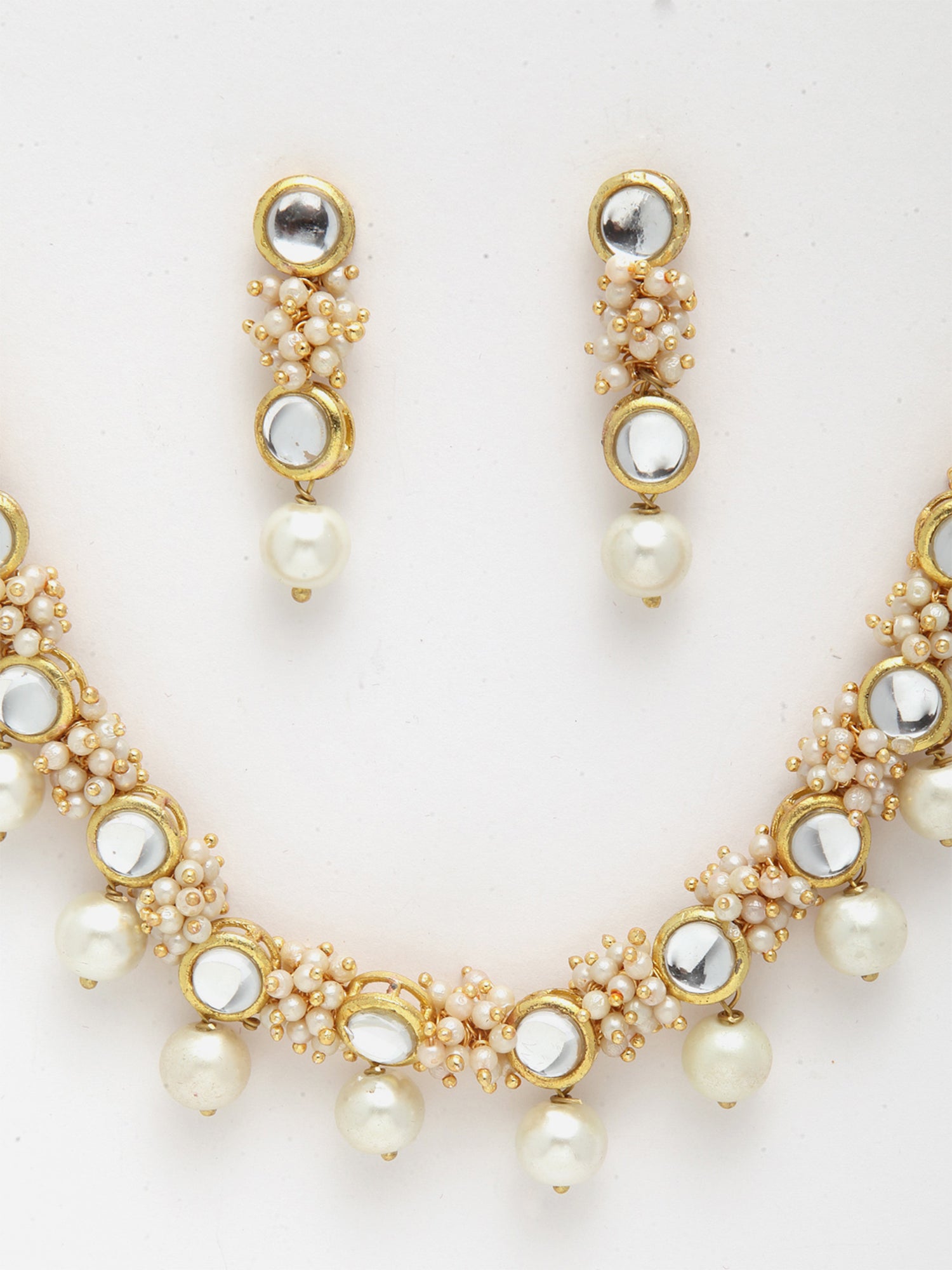 - Gold-Plated Pearl Ball and Kundan Studded Handcrafted Choker Necklace Set. It's Five Layer Micro Gold Plated and Embellished with Elegant Kundan for High Durability. Intricate high polish creates glamorous reflections and adds a luxurious look. Perfect for Weddings, Festivals, Traditional Occasions. Best when paired with any Indian outfit.