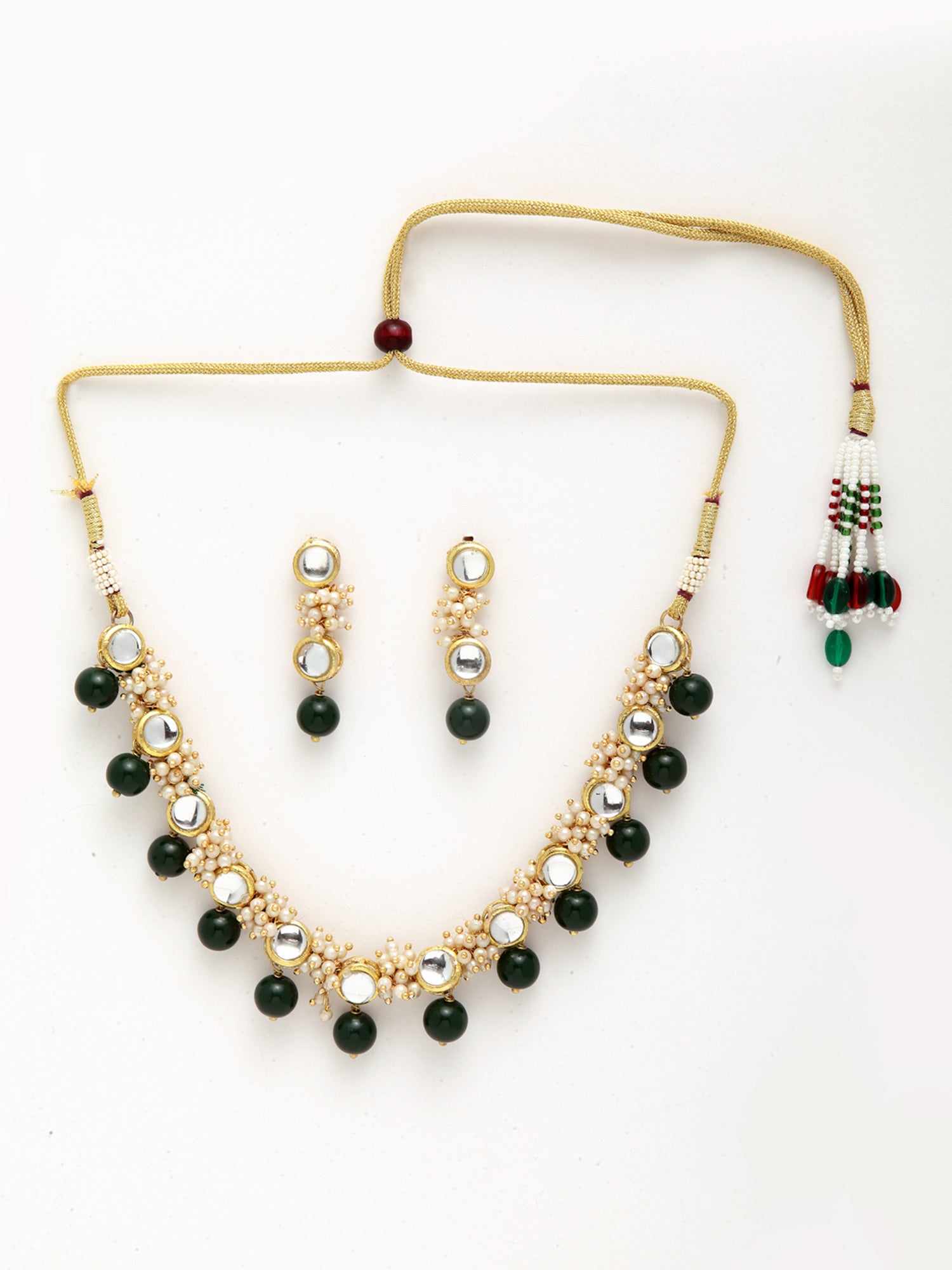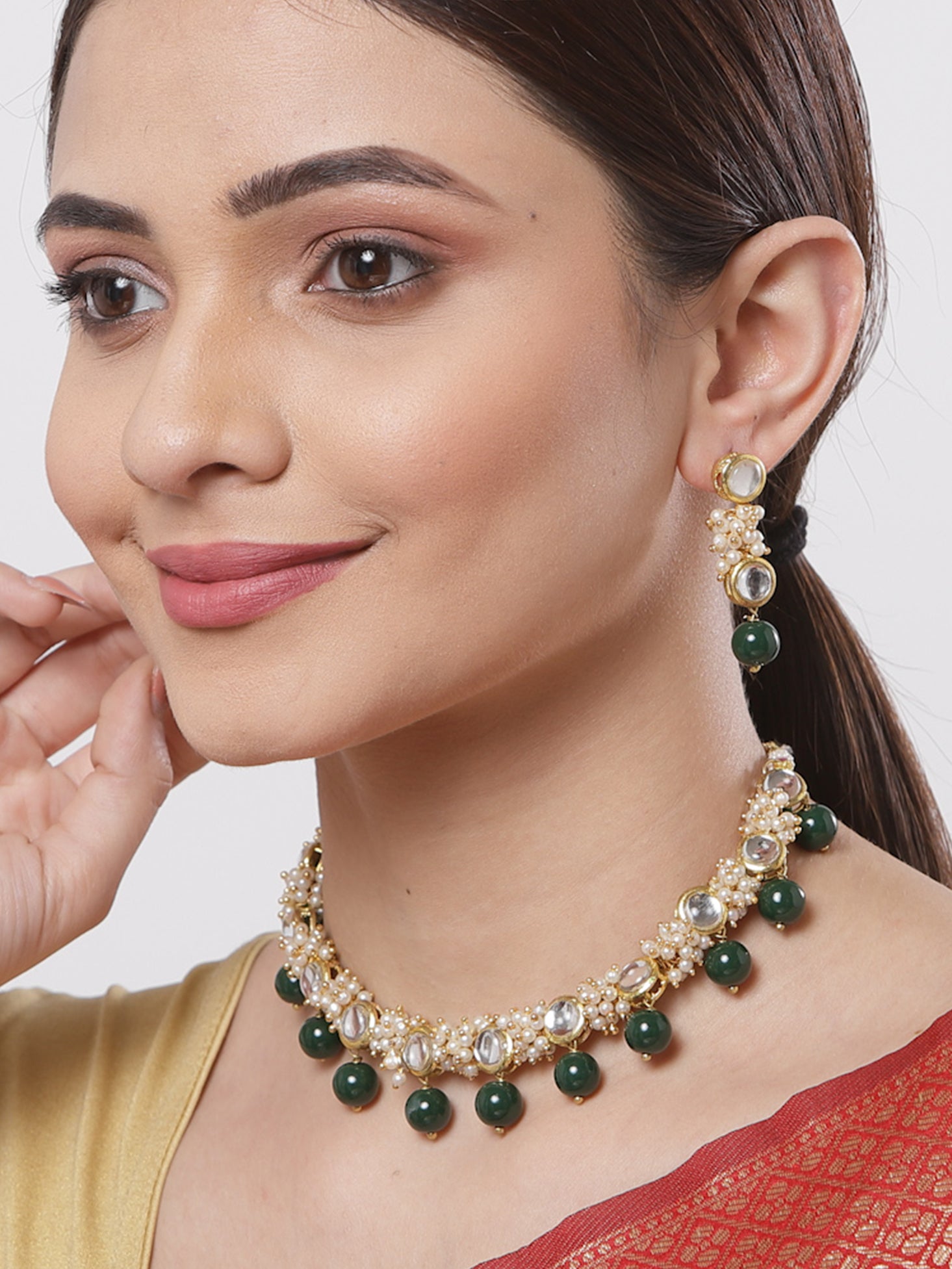 - Gold-Plated Green Beads and Pearl Ball Studded Handcrafted Kundan Choker Necklace Set. It's Five Layer Micro Gold Plated and Embellished with Elegant Kundan for High Durability. Intricate high polish creates glamorous reflections and adds a luxurious look. Perfect for Weddings, Festivals, Traditional Occasions. Best when paired with any Indian outfit.