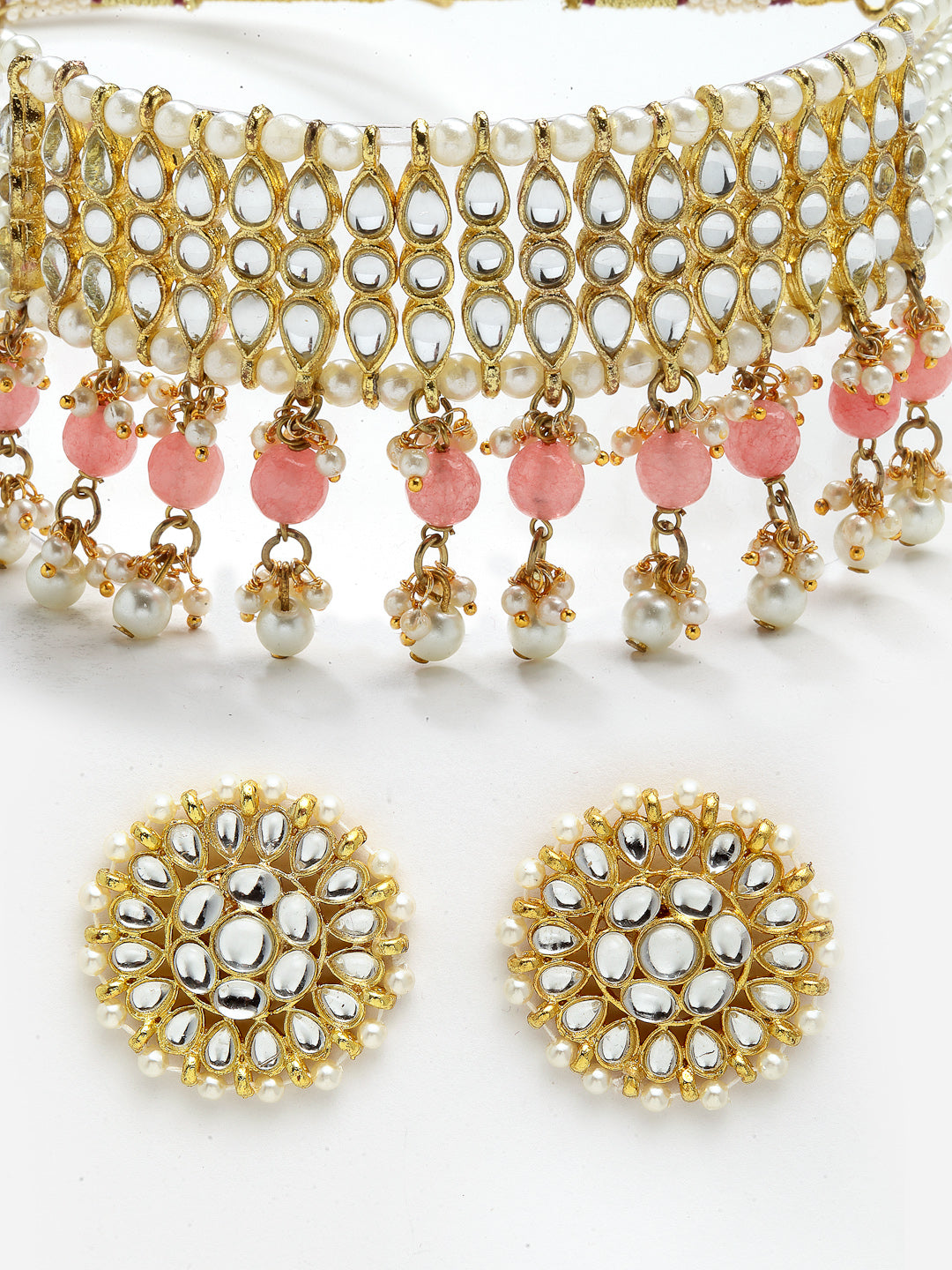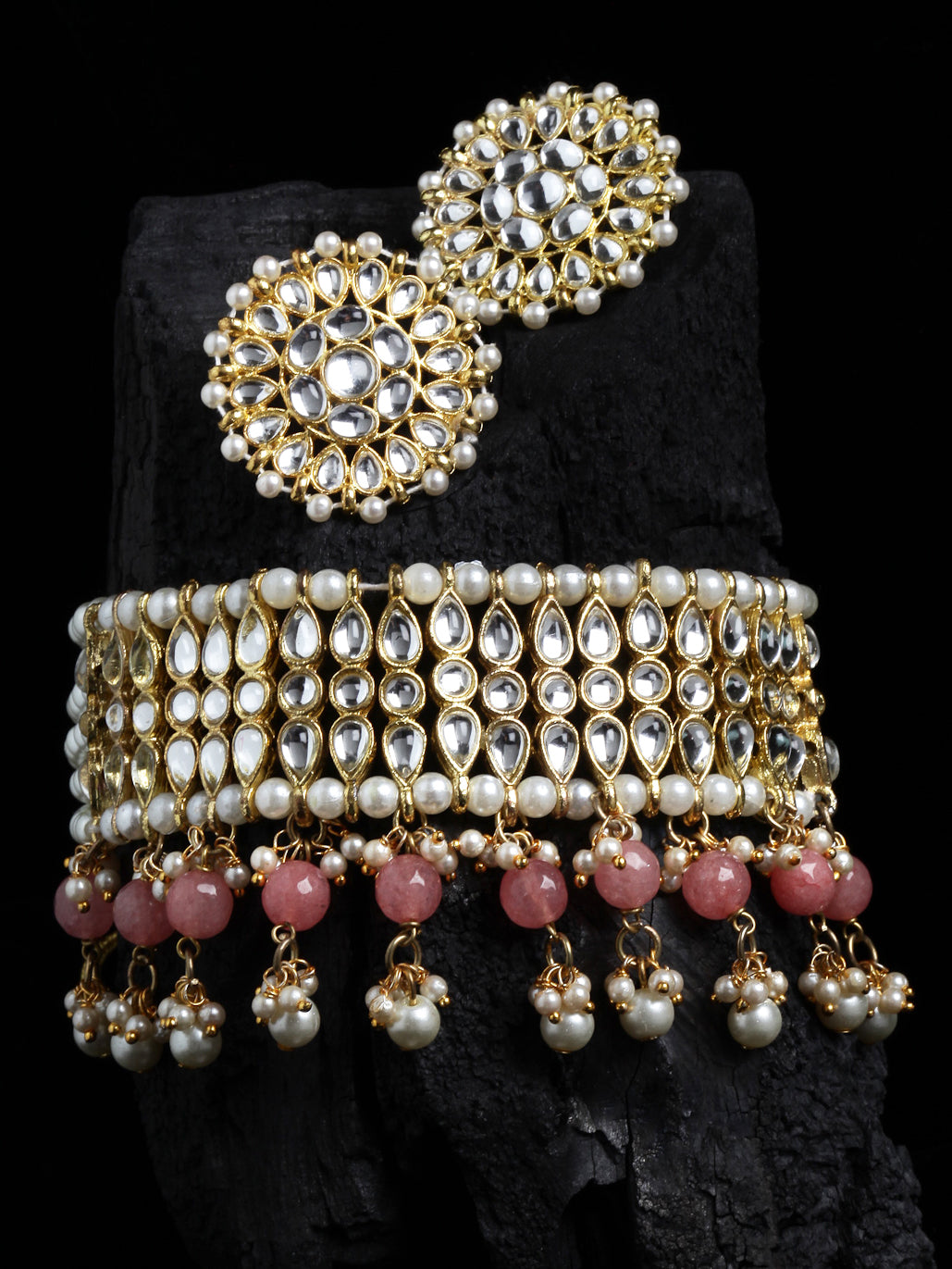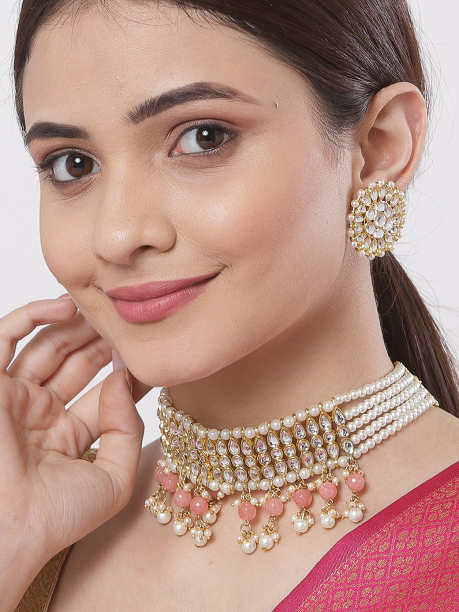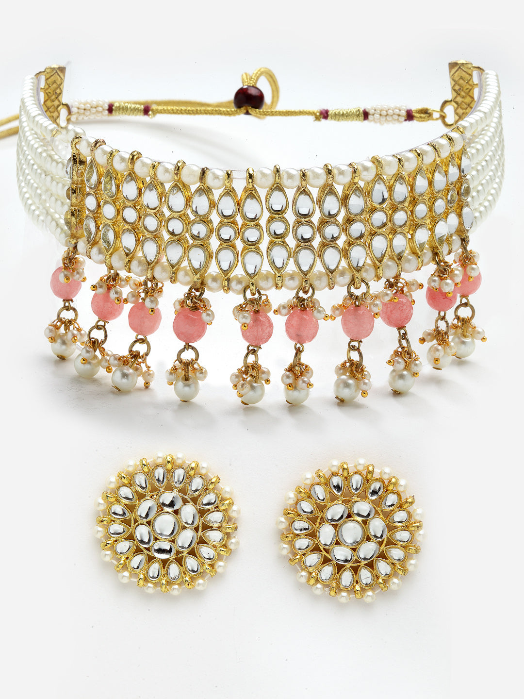 - Peach Gold Plated Choker Tesselled Necklace Set. It's Five Layer Micro Gold Plated and Embellished with Kundan for High Durability. Intricate high polish creates glamorous reflections and adds a luxurious look. Perfect for Weddings, Festivals, Traditional Occasions. Best when paired with any Indian outfit.