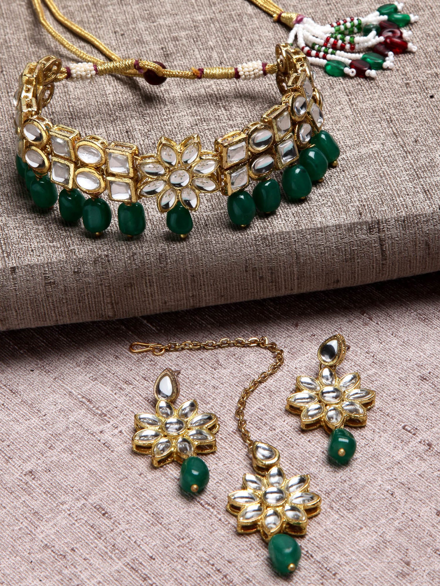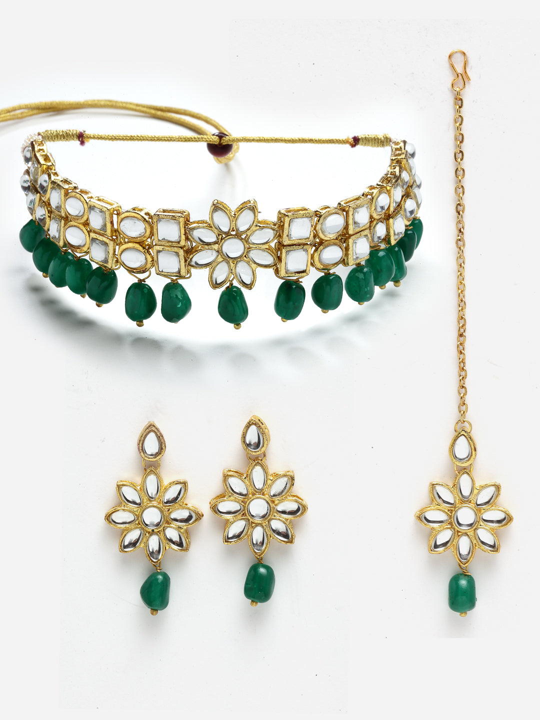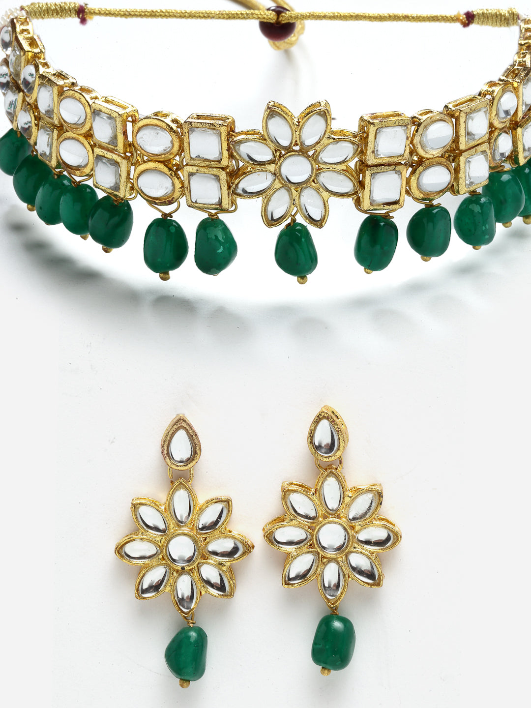 - Floral Design Green Stone and Kundan Studded Choker Jewellery Set. It's Five Layer Micro Gold Plated and Embellished with Kundan for High Durability. Intricate high polish creates glamorous reflections and adds a luxurious look. Perfect for Weddings, Festivals, Traditional Occasions. Best when paired with any Indian outfit.