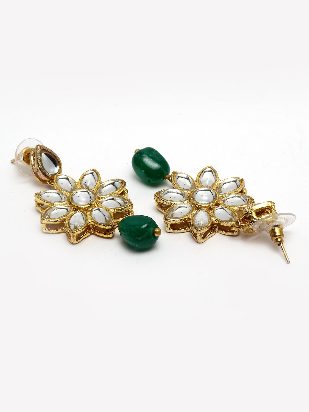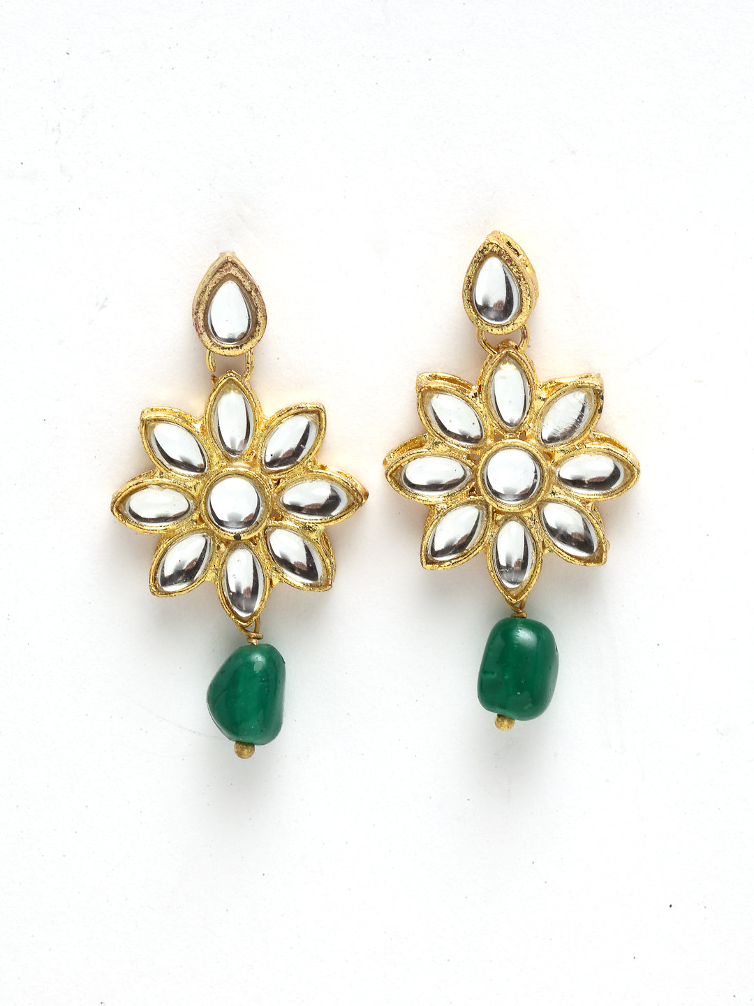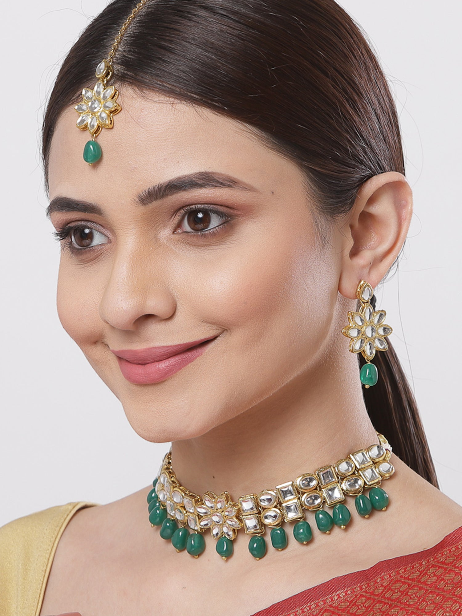 - Floral Design Green Stone and Kundan Studded Choker Jewellery Set. It's Five Layer Micro Gold Plated and Embellished with Kundan for High Durability. Intricate high polish creates glamorous reflections and adds a luxurious look. Perfect for Weddings, Festivals, Traditional Occasions. Best when paired with any Indian outfit.
