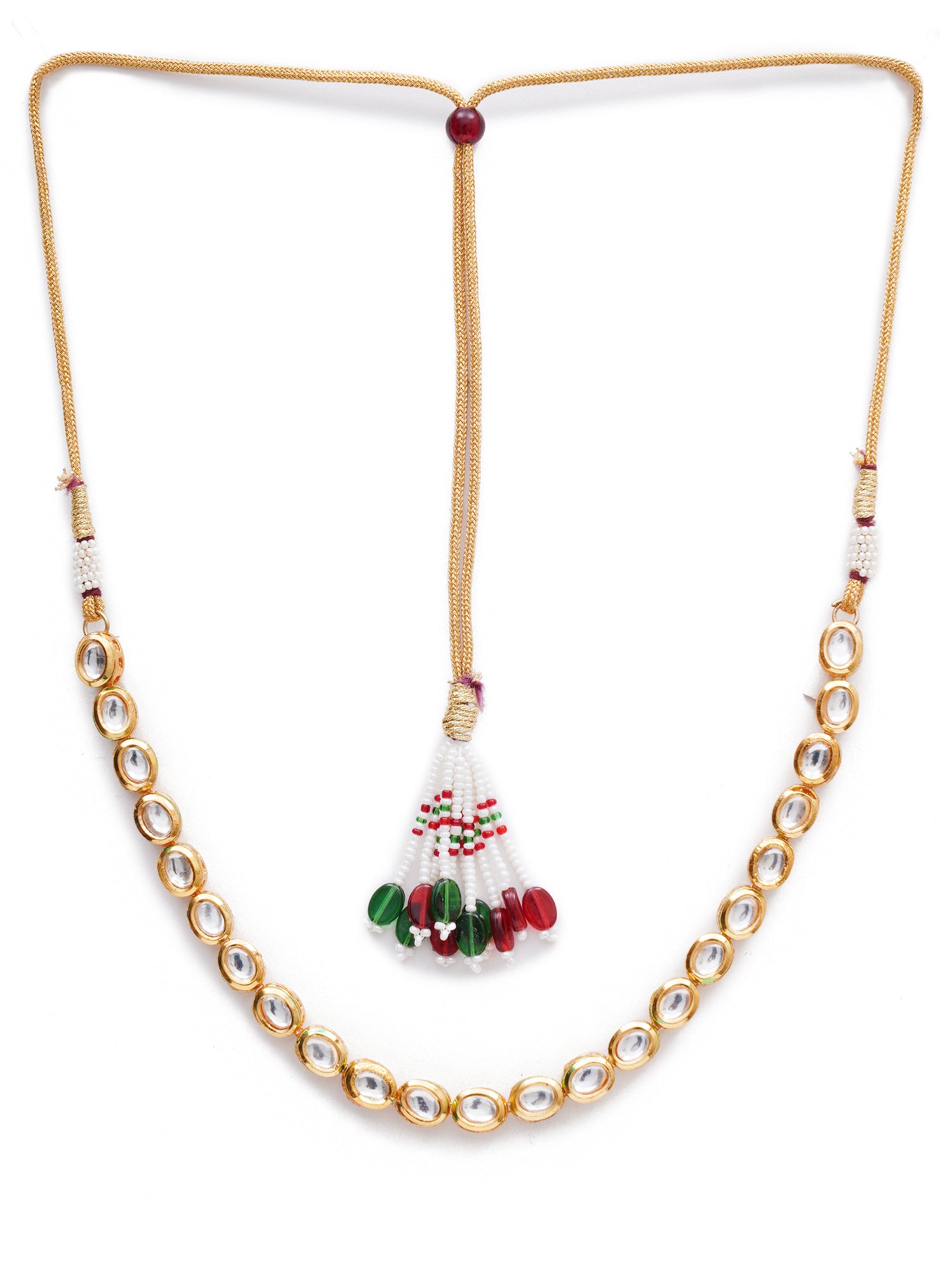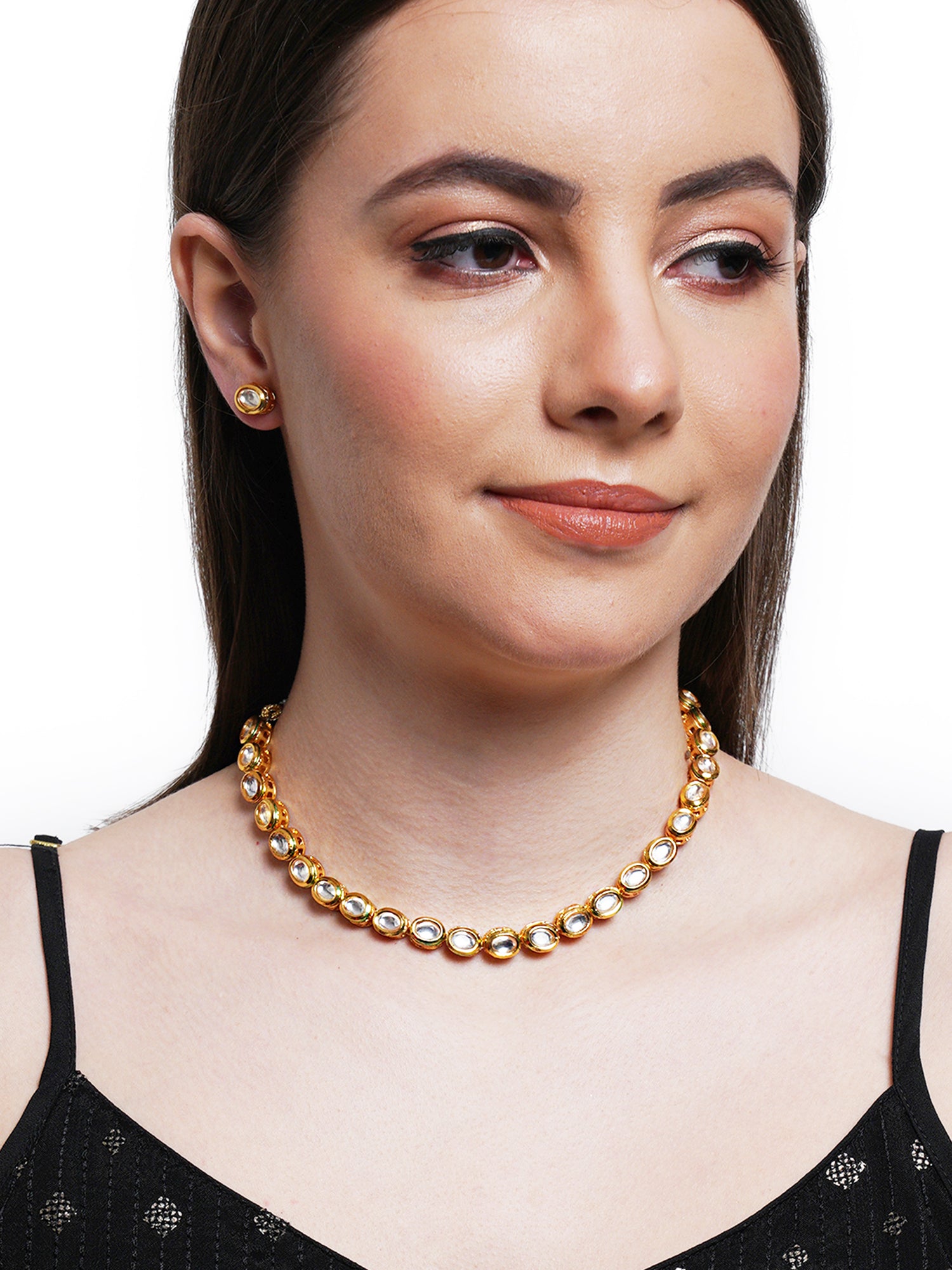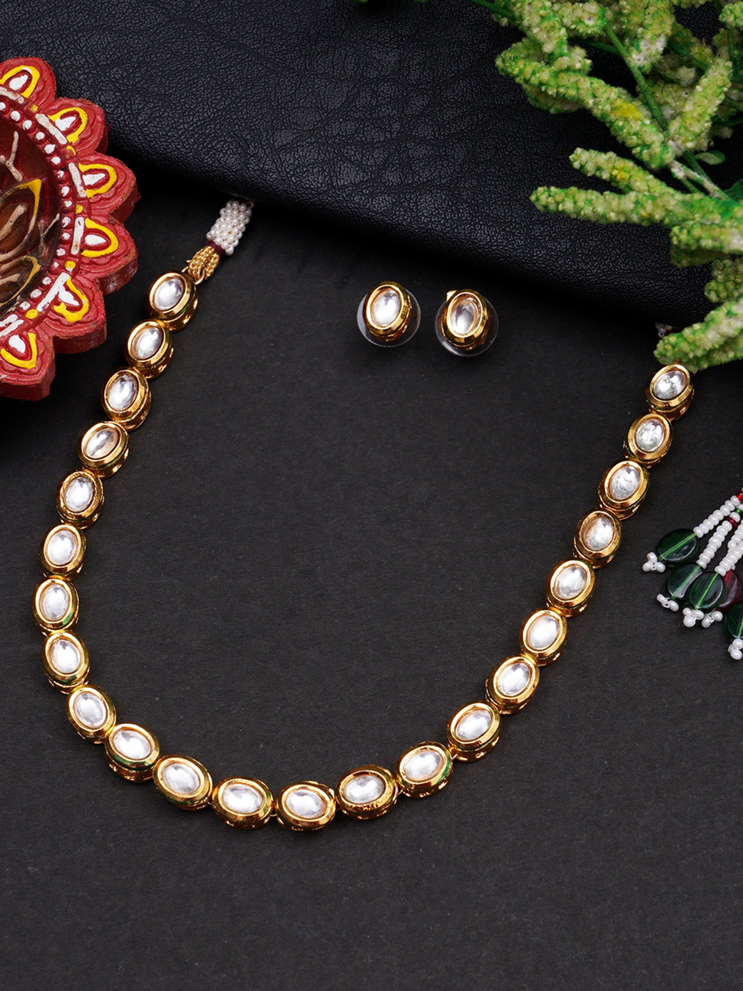 - Traditional Gold Plated Oval Shaped Polki Kundan Necklace Set for Women. It's Five Layer Micro Gold Plated and Embellished with Elegant Kundan for High Durability. Intricate high polish creates glamorous reflections and adds a luxurious look. Perfect for Weddings, Festivals, Traditional Occasions. Best when paired with any Indian outfit.