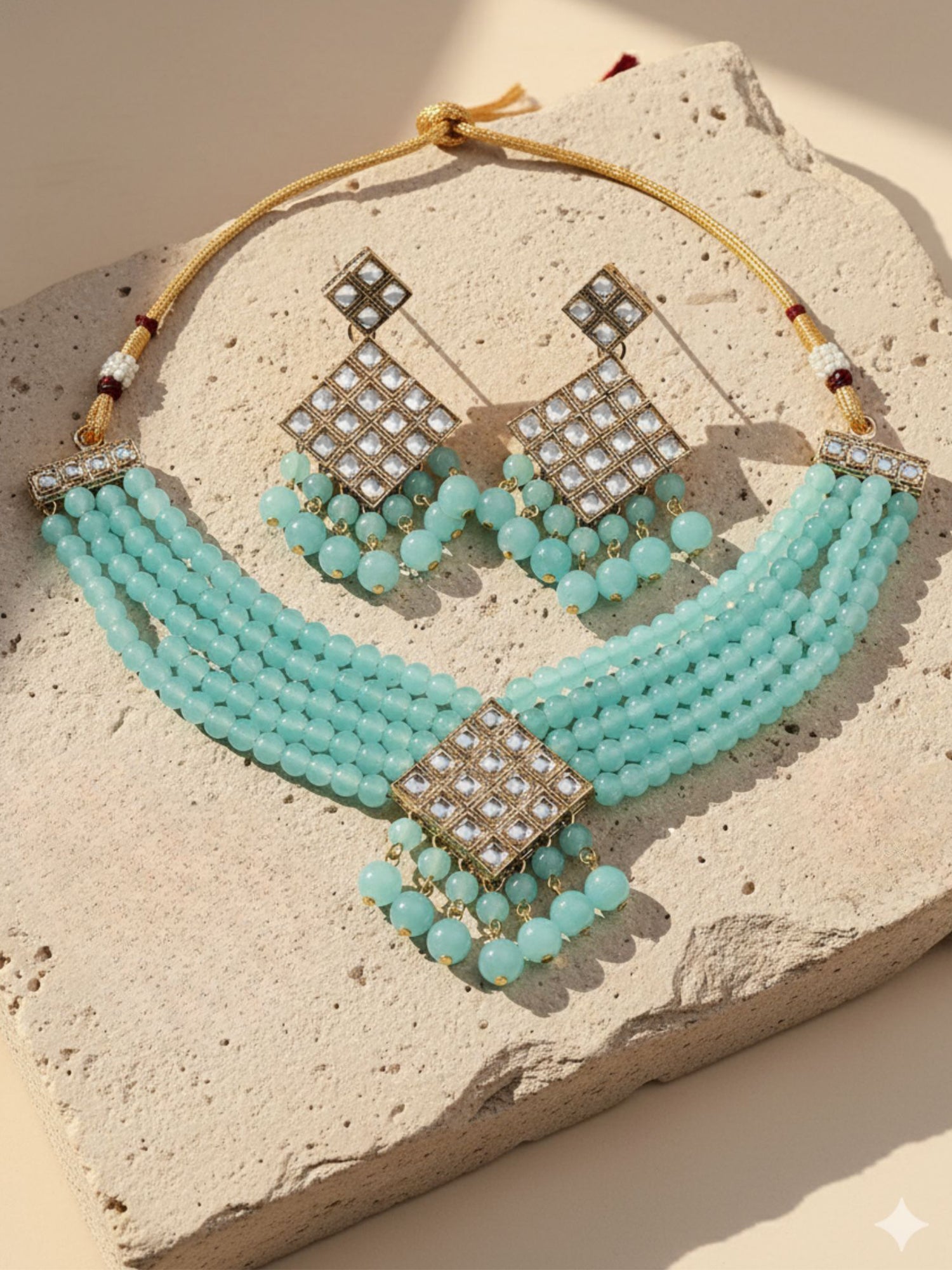 Handcrafted Blue Beads Gold Plated Kundan Choker Necklace Set