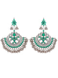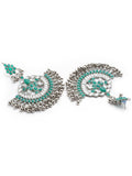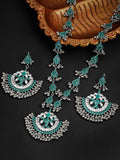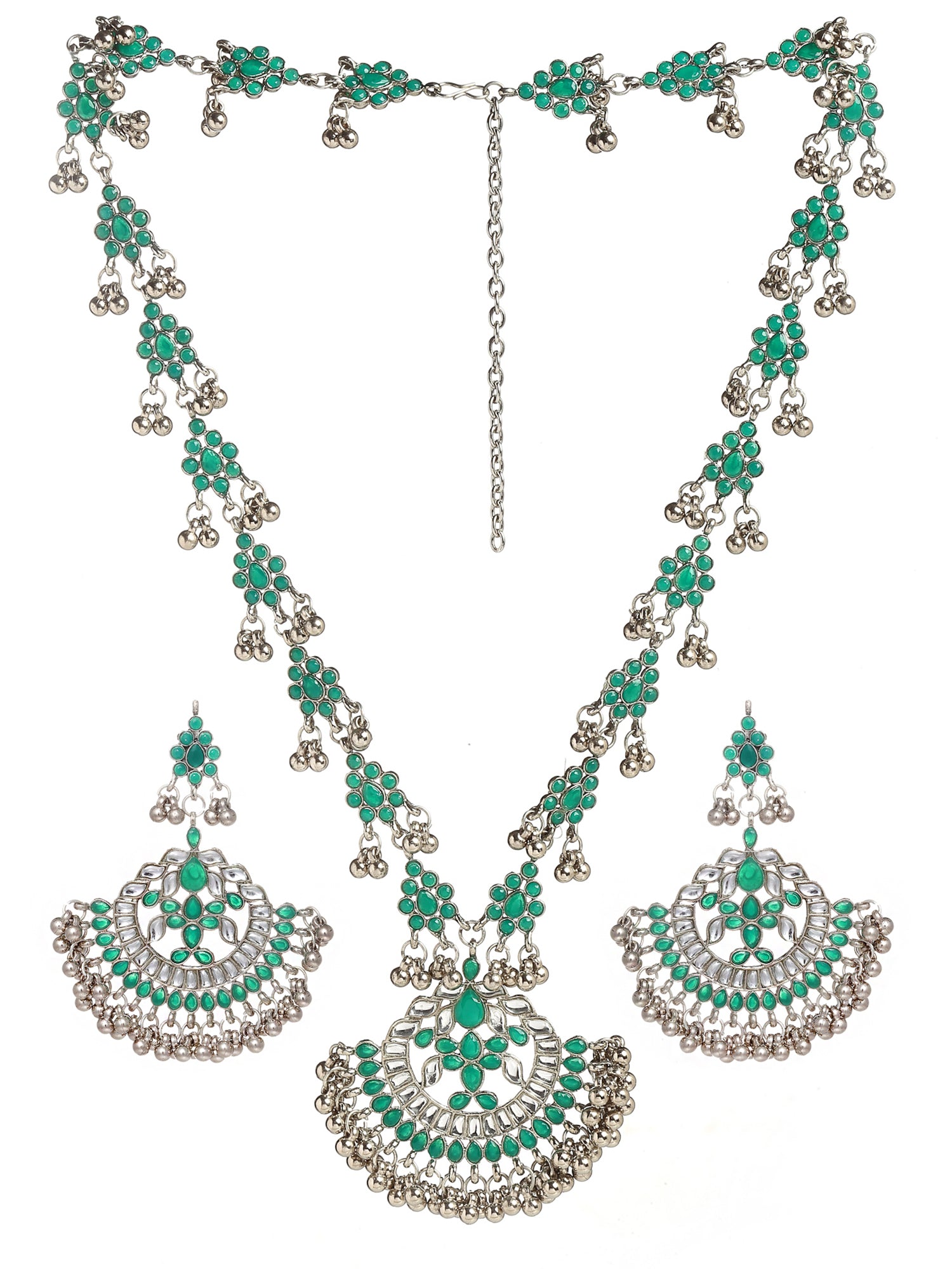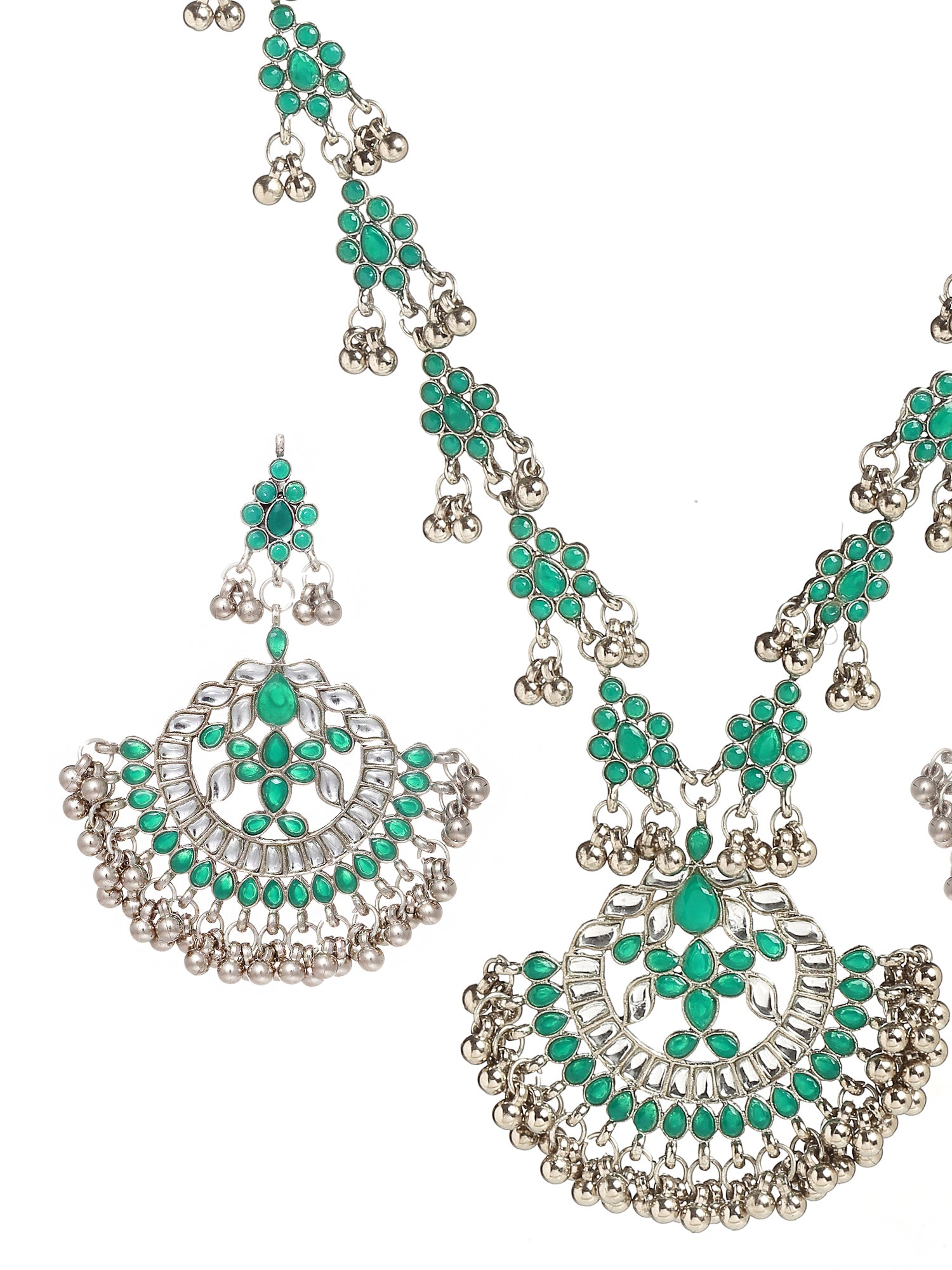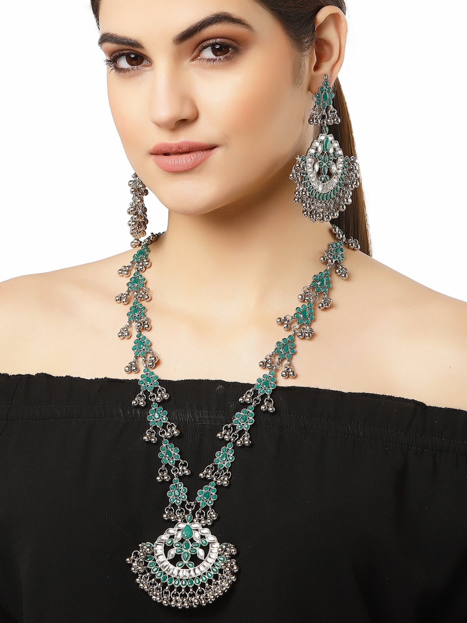 Oxidised Silver Green Kundan Studded Antique Rani Haar Necklace Set