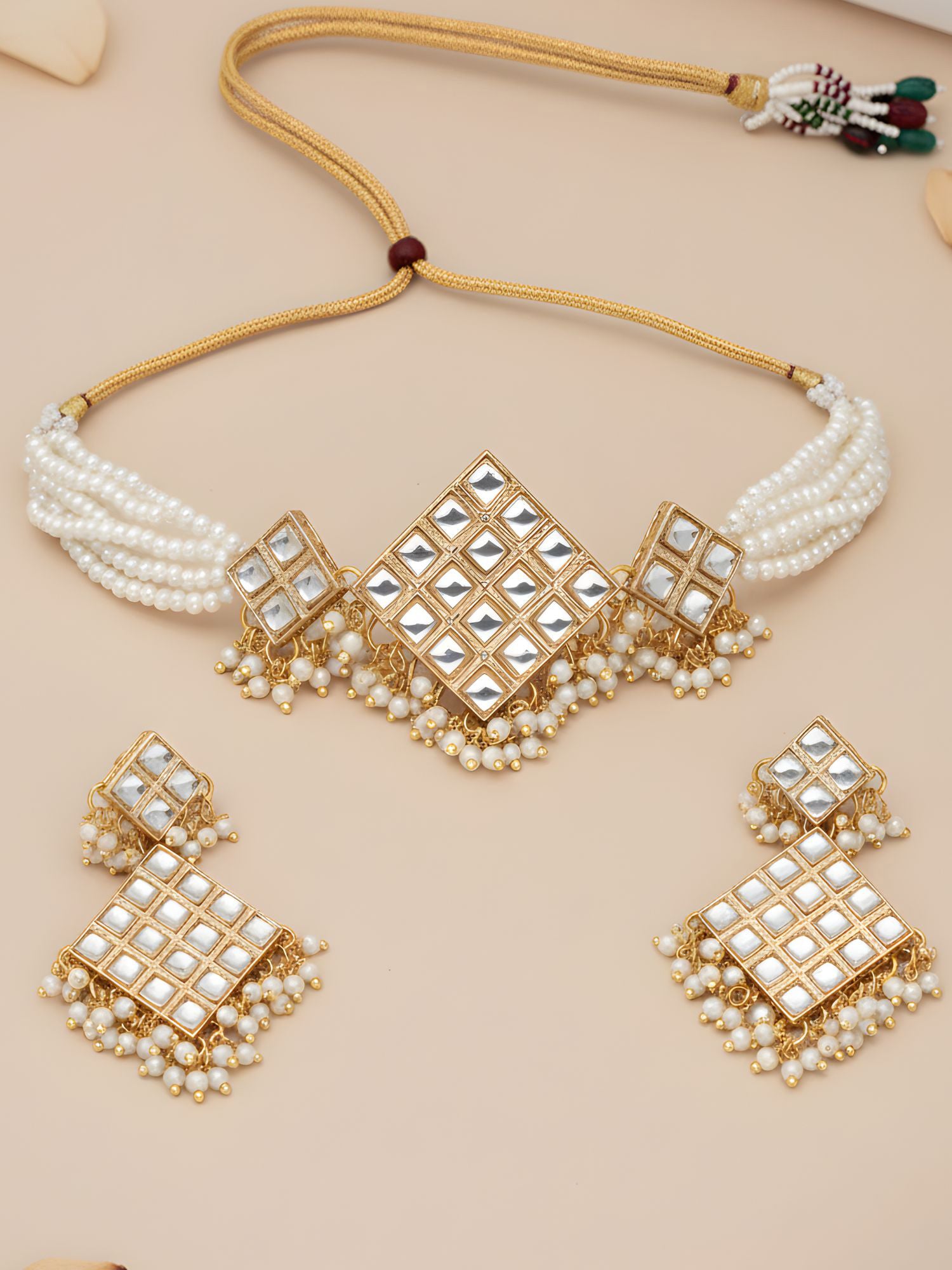 Gold-plated white kundan studded and beaded choker necklace, secured with a drawstring closure