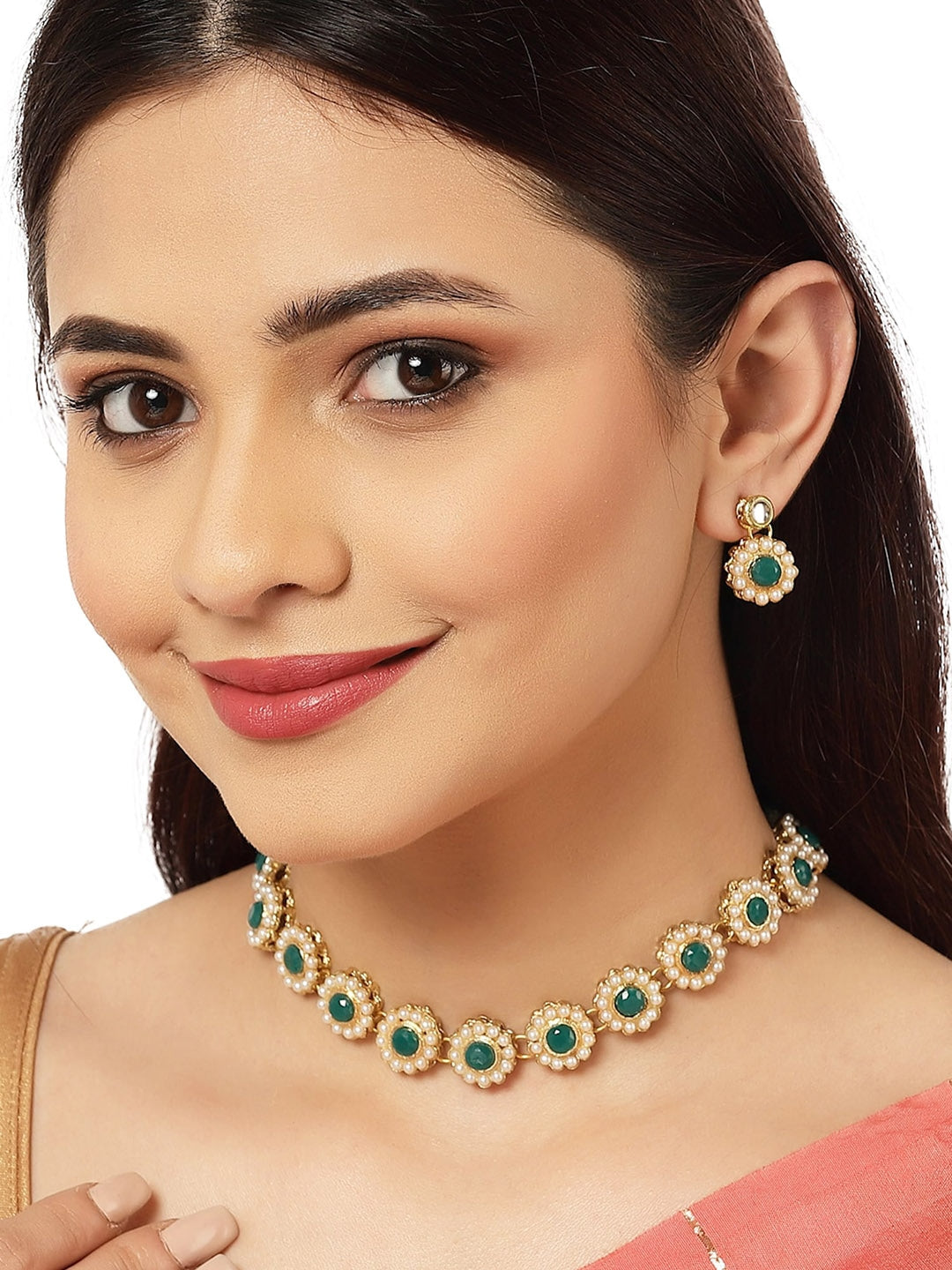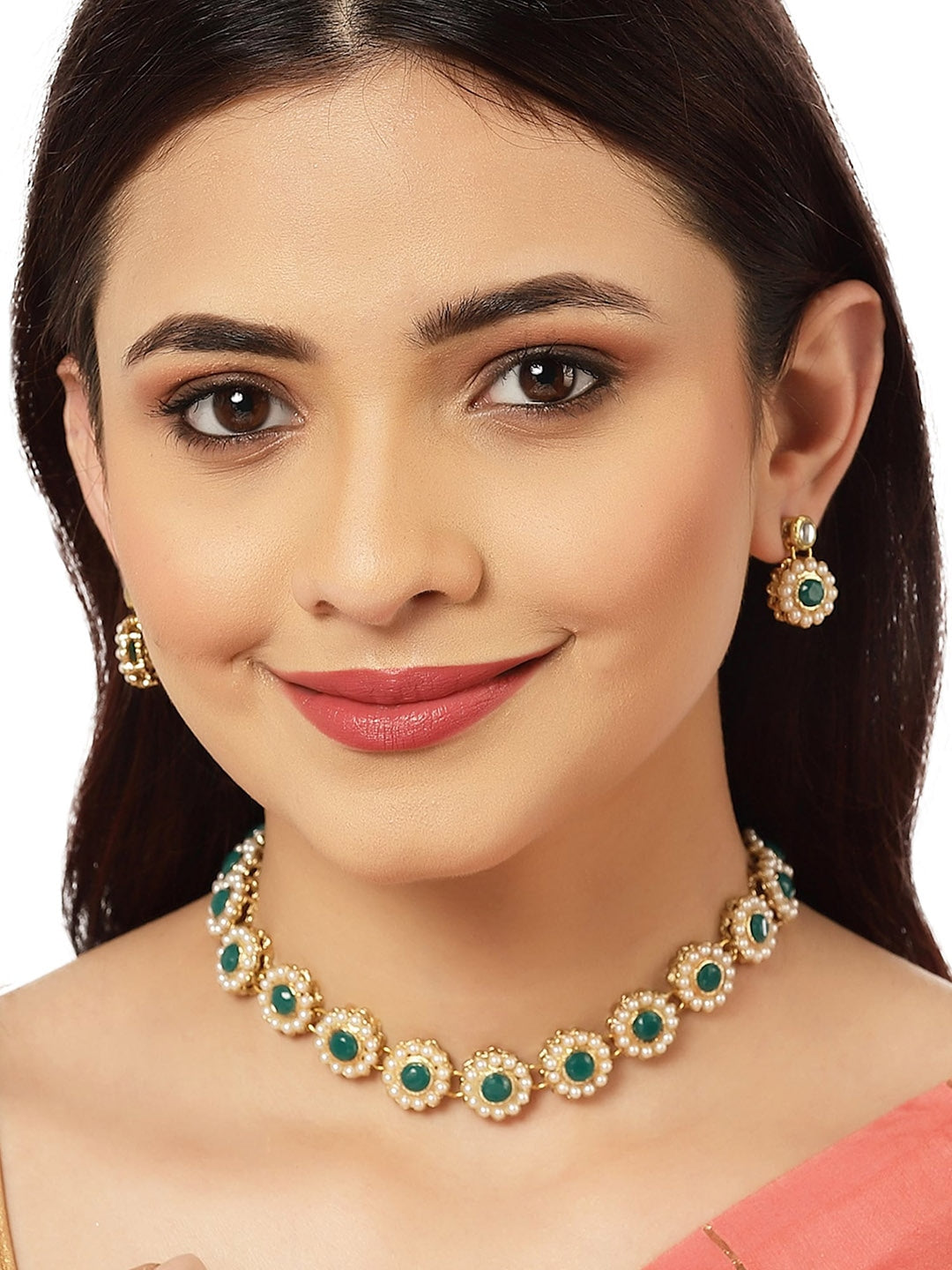Gold-plated chocker necklace has green and white kundan-studded and pearl-beaded details