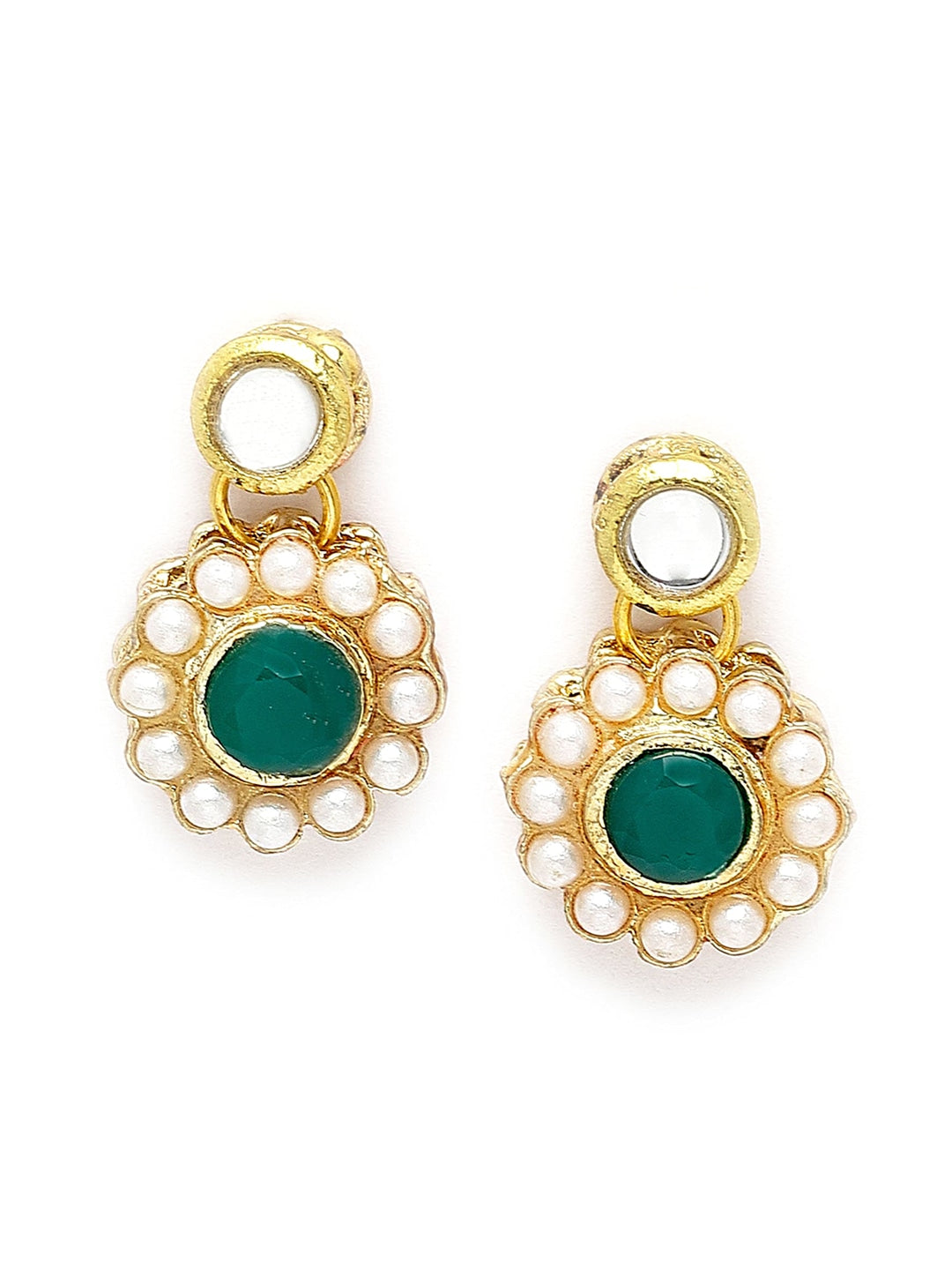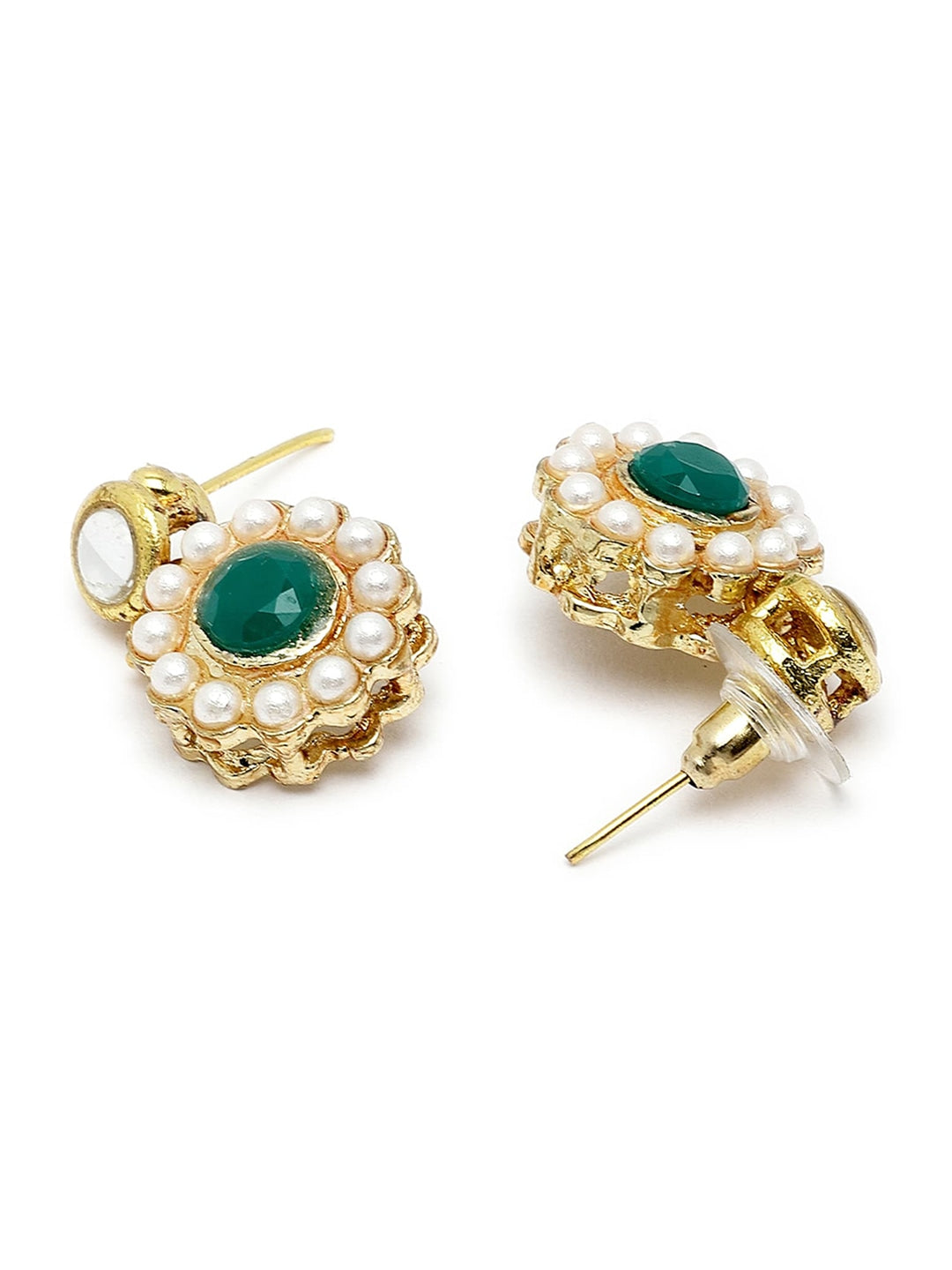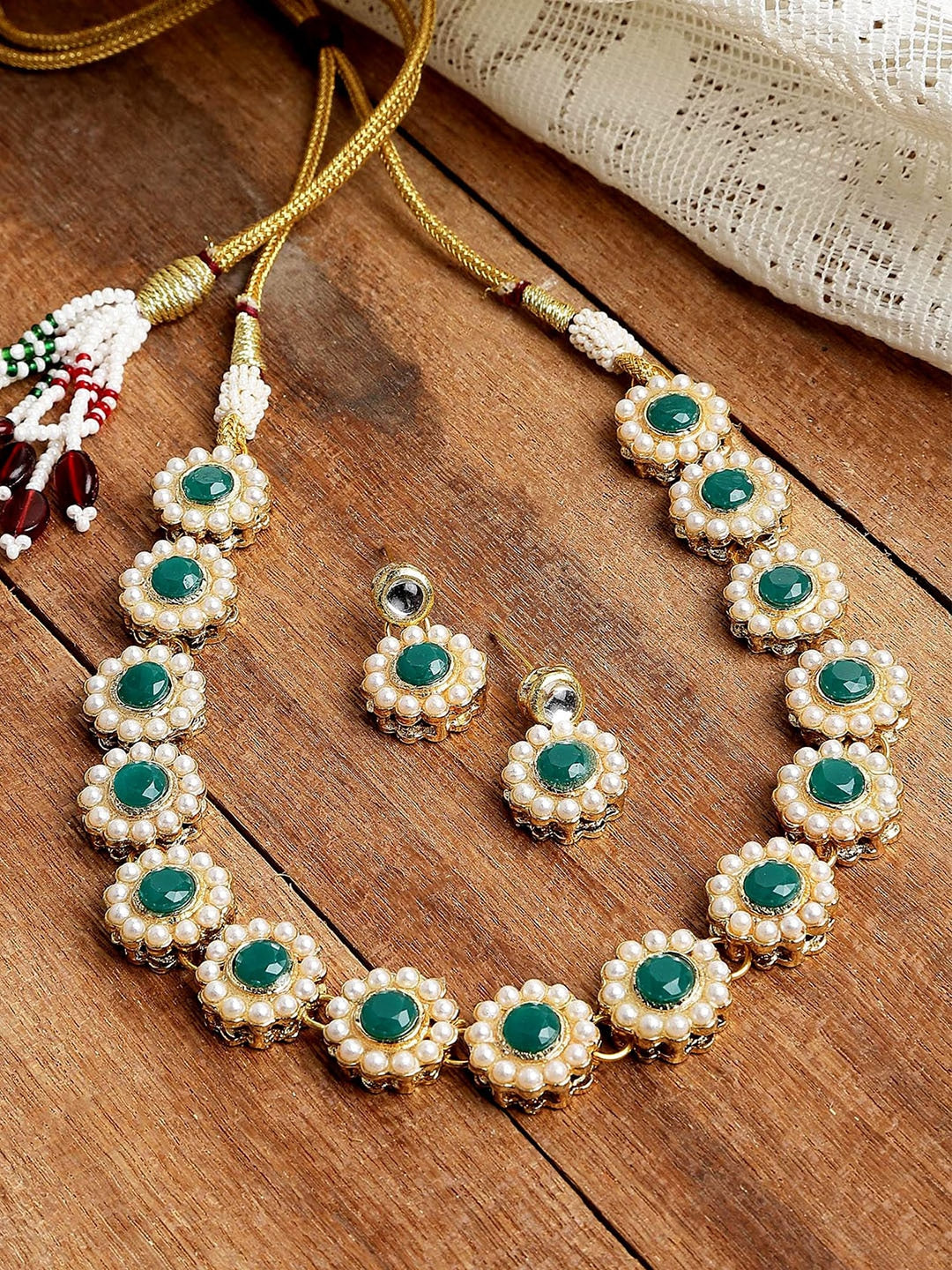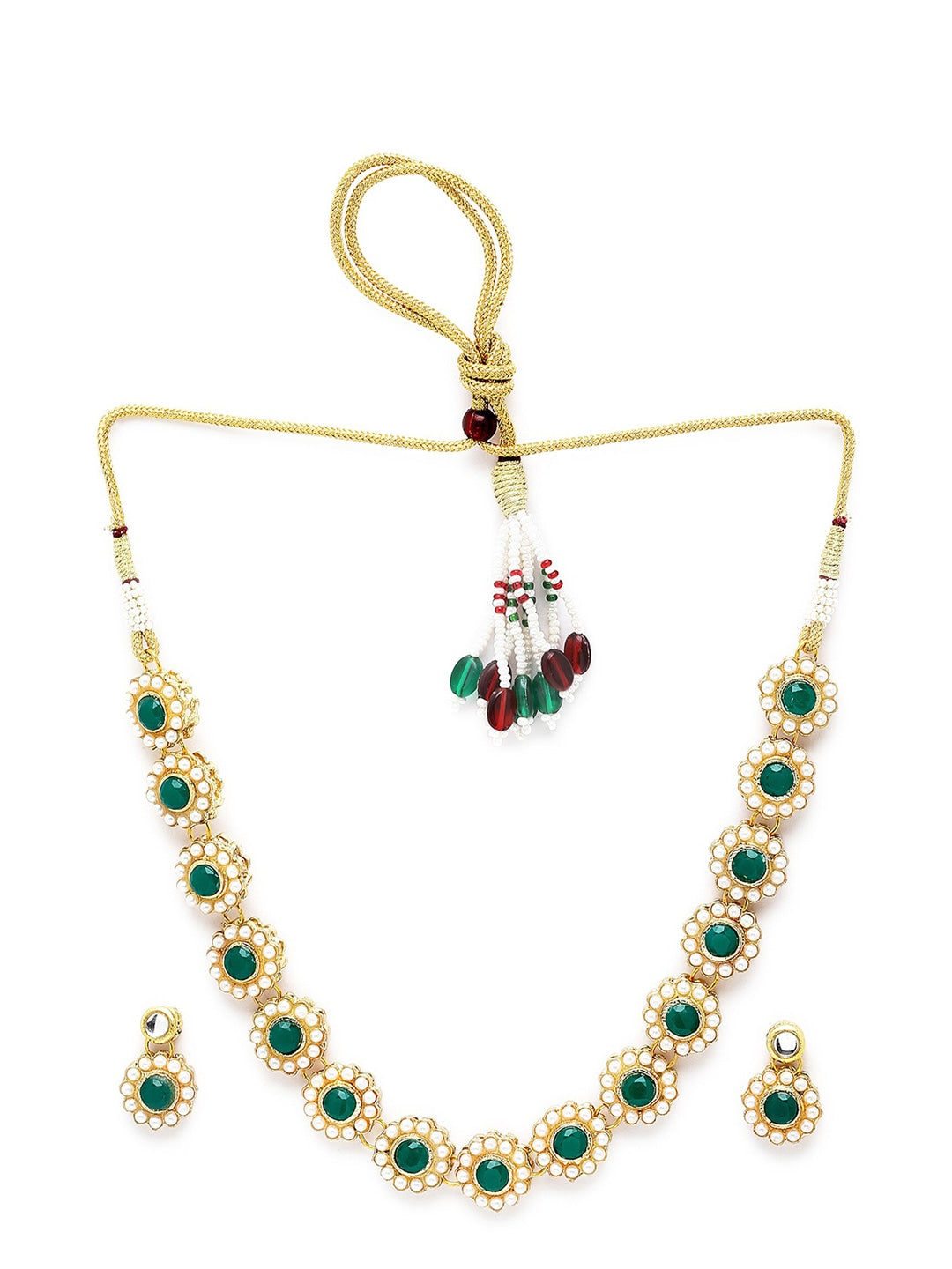 Gold-Plated Green & White Kundan-Studded & Pearl Beaded Handcrafted Jewellery Set