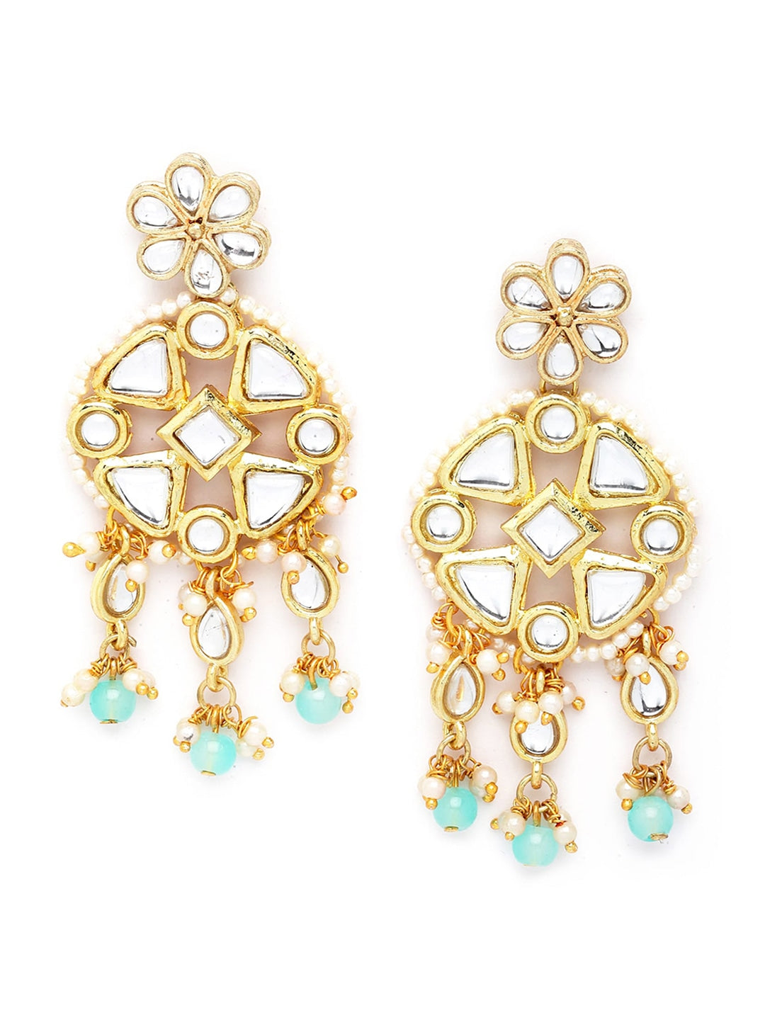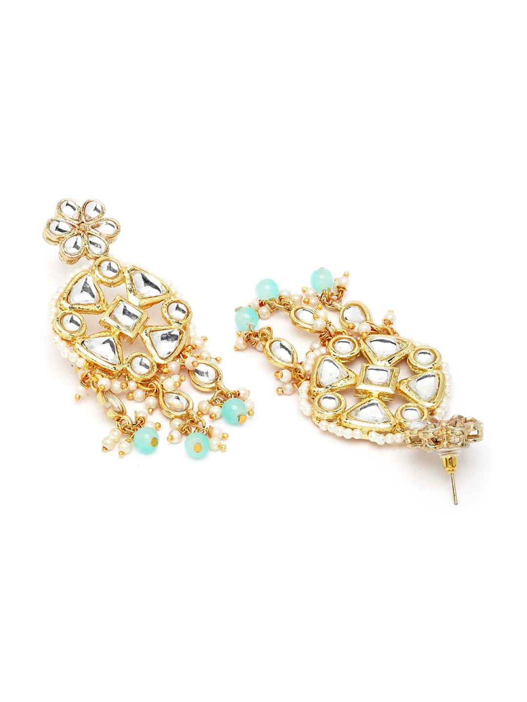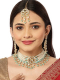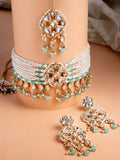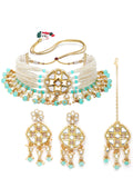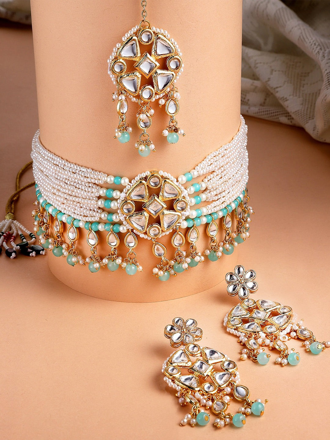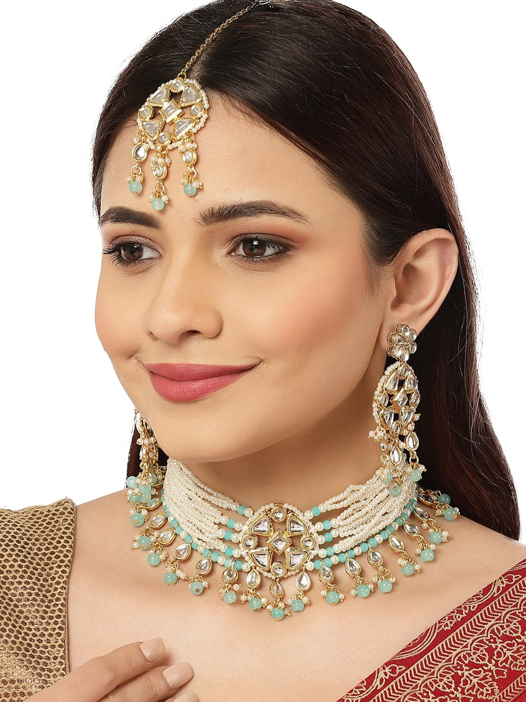 Women Gold Plated Light Blue Beads Studded Kundan Choker Necklace Set