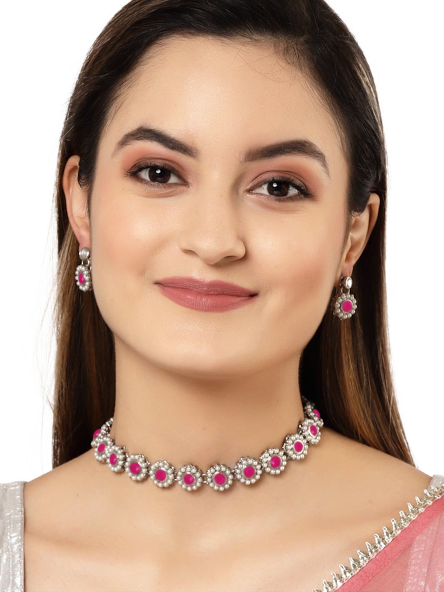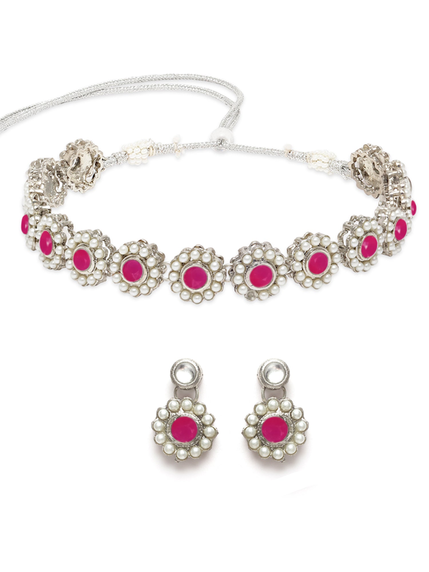 - Karatcart Oxidised Silver Red Kundan and Pearl Choker Necklace Set. It is made with high-quality Kundan Stones which makes them very skin-friendly. Perfect for Weddings, Parties, Festivals, and Traditional Occasions.