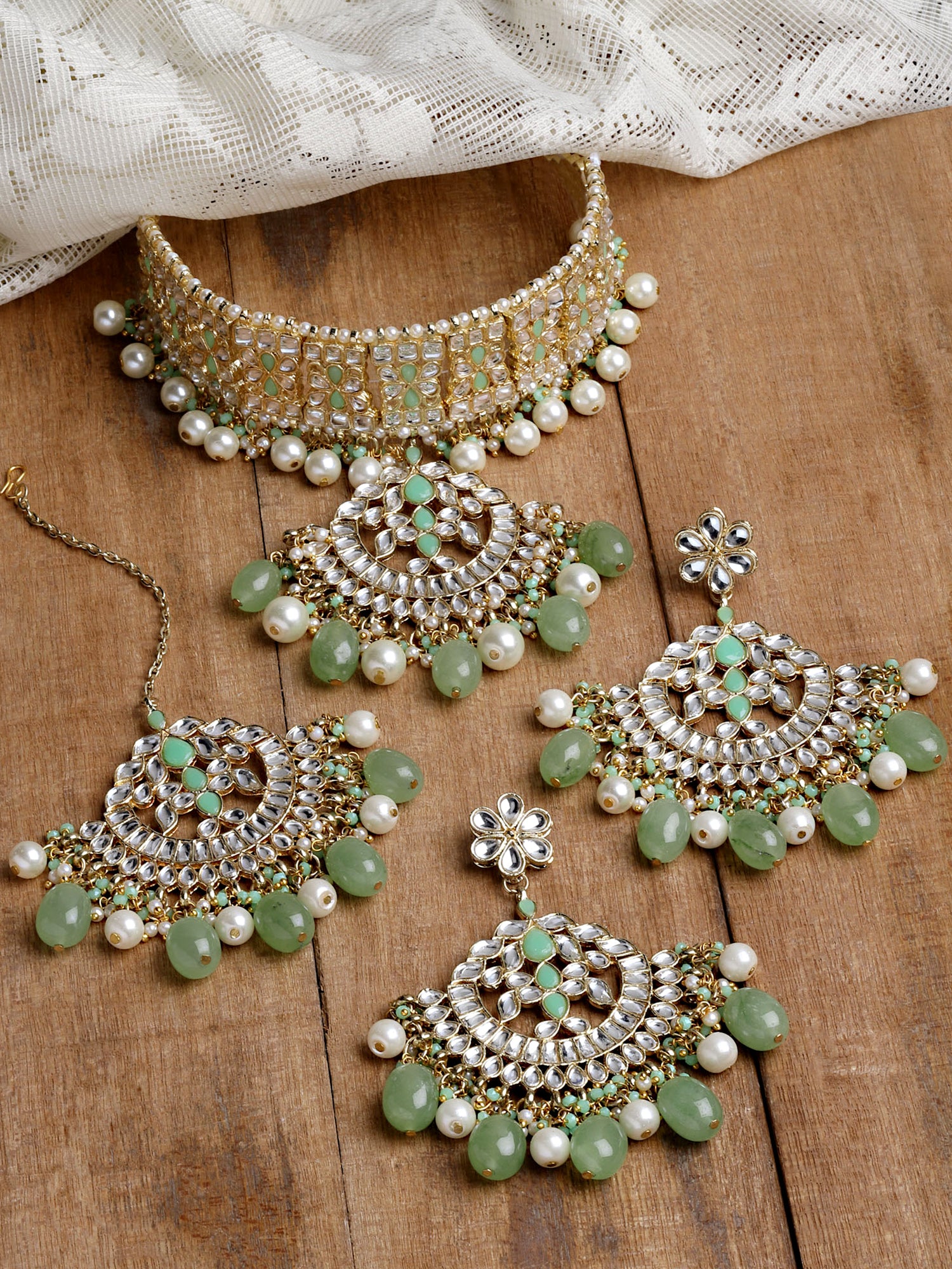 - Karatcart Gold Plated Light Green Tumble and Pearl Studded Choker Necklace Set. It is made with high-quality Kundan Stones which makes them very skin-friendly. Perfect for Weddings, Parties, Festivals, and Traditional Occasions. Gracefully pair Saree, Kurti, or any Indo-western outfit to enhance your look. These are made from toxic-free materials which are Anti-Allergic and Safe for the skin.