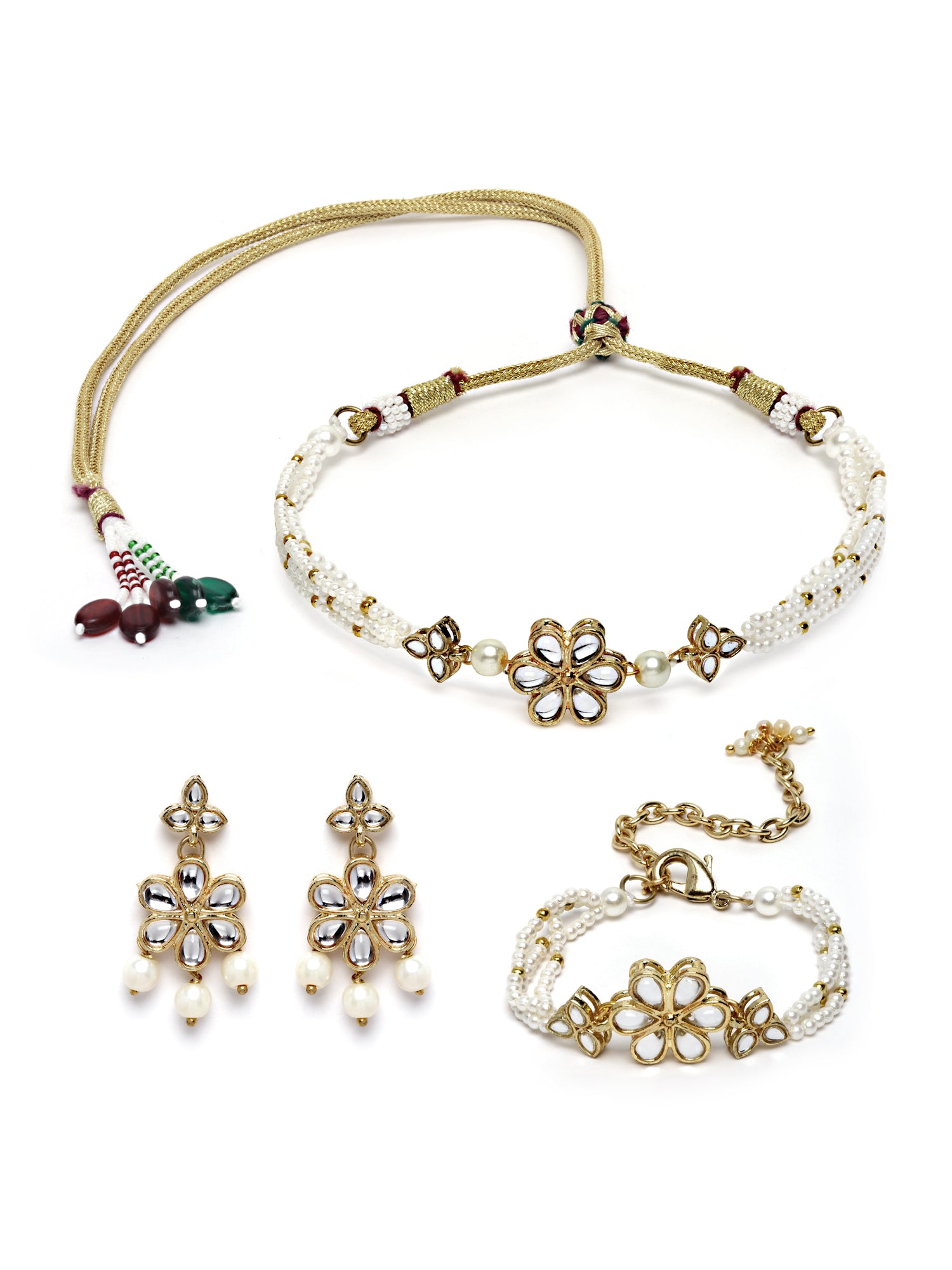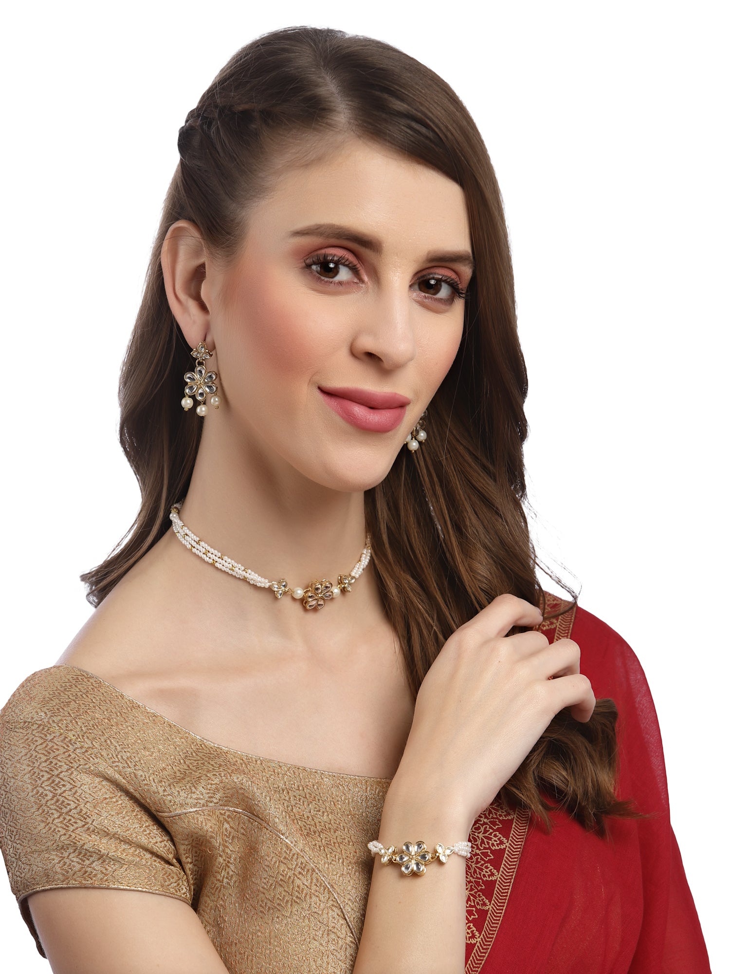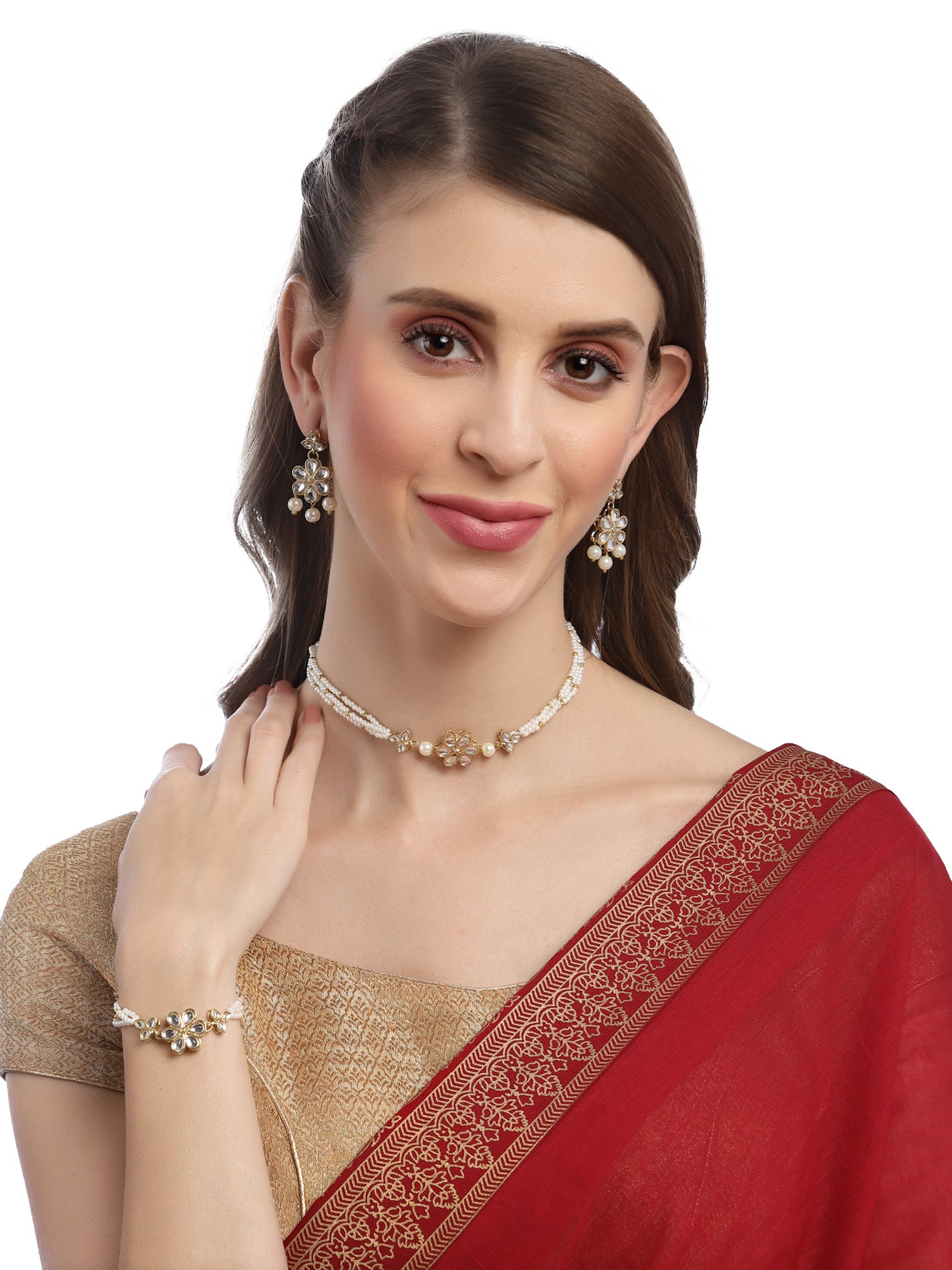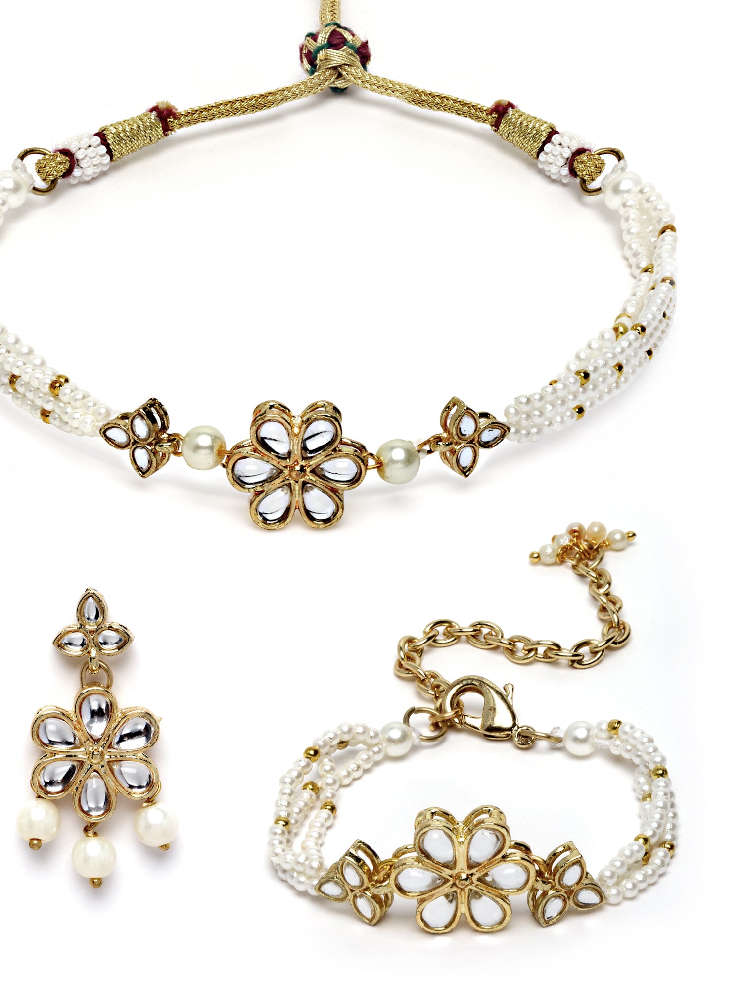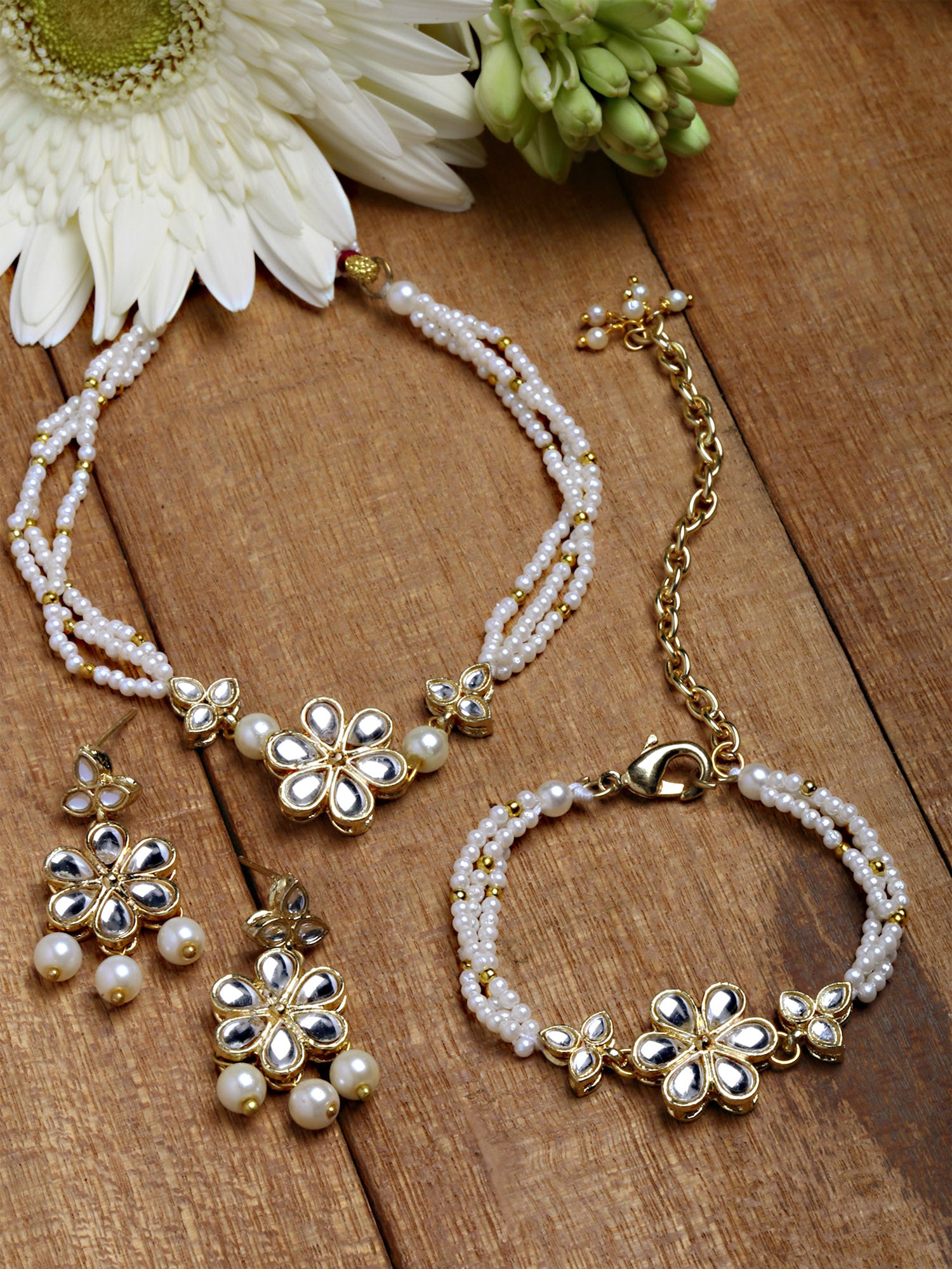 - Karatcart Gold Plated Floral Pearl Beaded Choker Necklace with Earrings and Bracelet. It is made with high-quality Kundan Stones which makes them very skin-friendly. Perfect for Weddings, Parties, Festivals, and Traditional Occasions. Gracefully pair Saree, Kurti, or any Indo-western outfit to enhance your look. These are made from toxic-free materials which are Anti-Allergic and Safe for the skin.