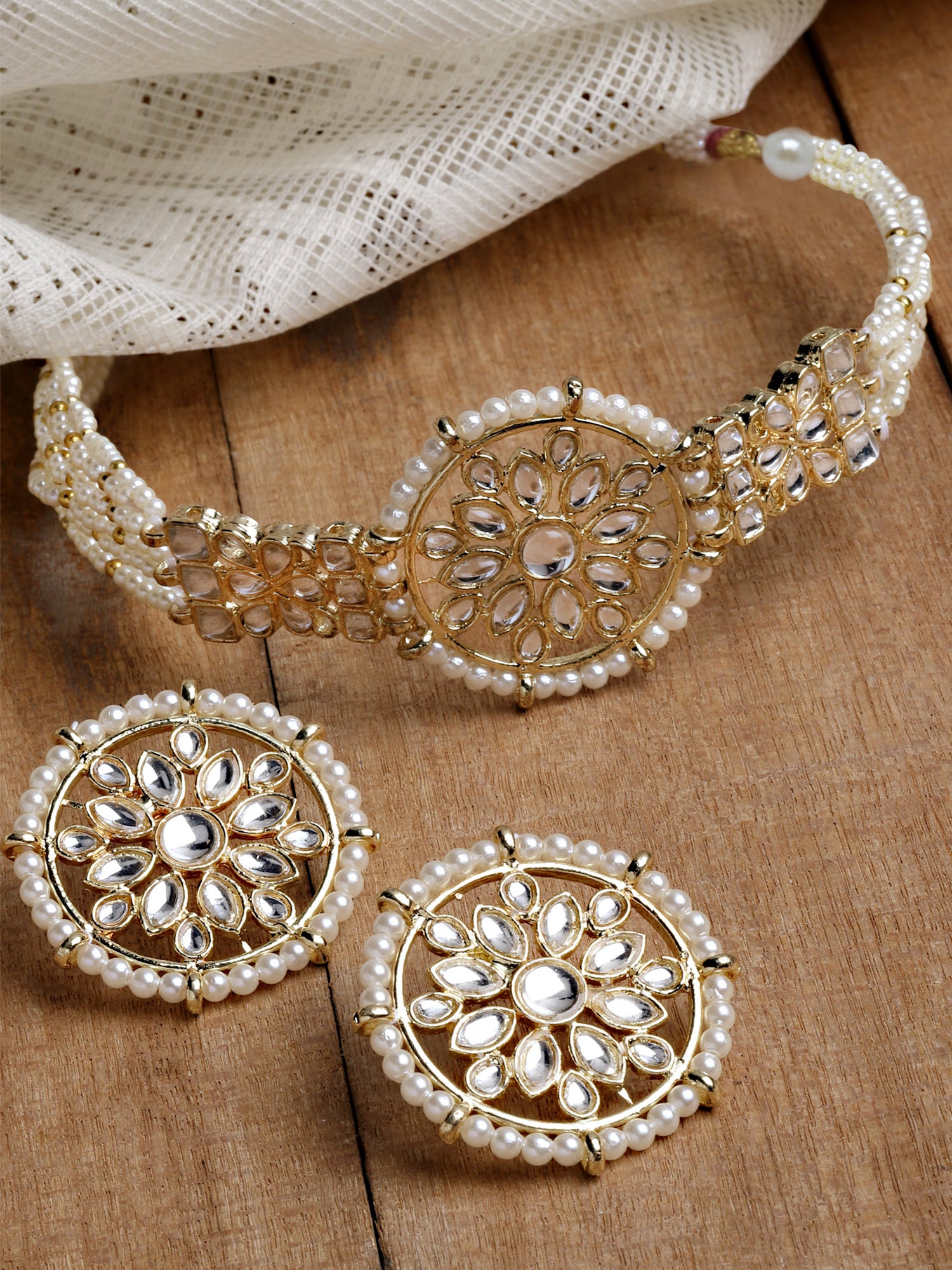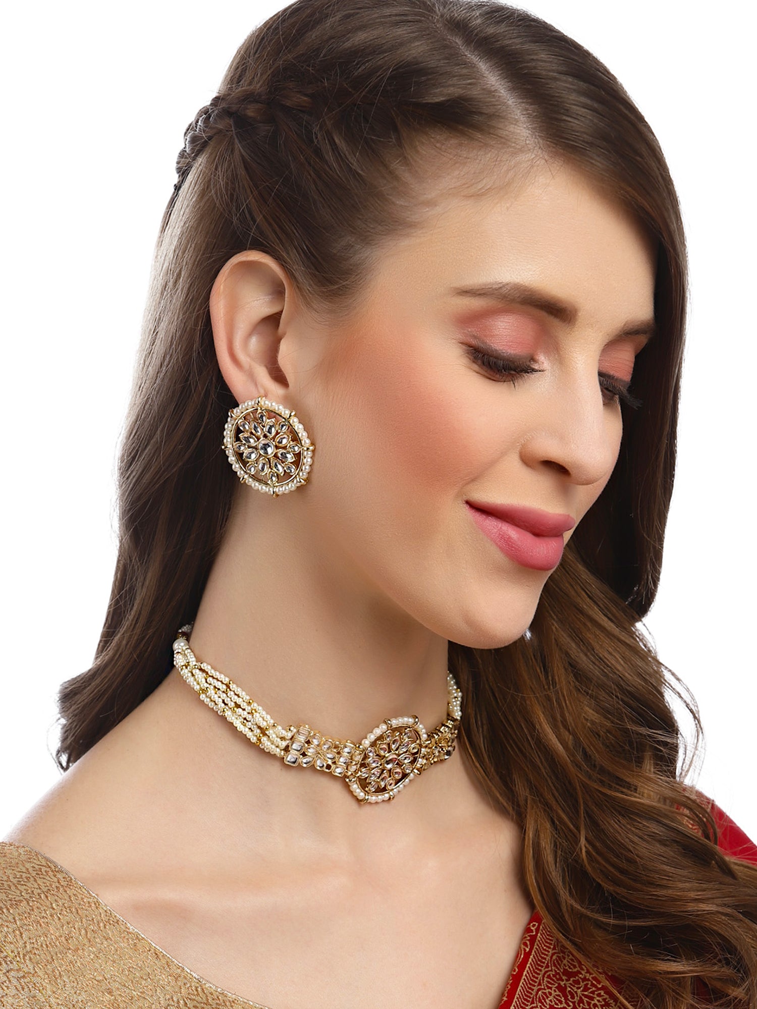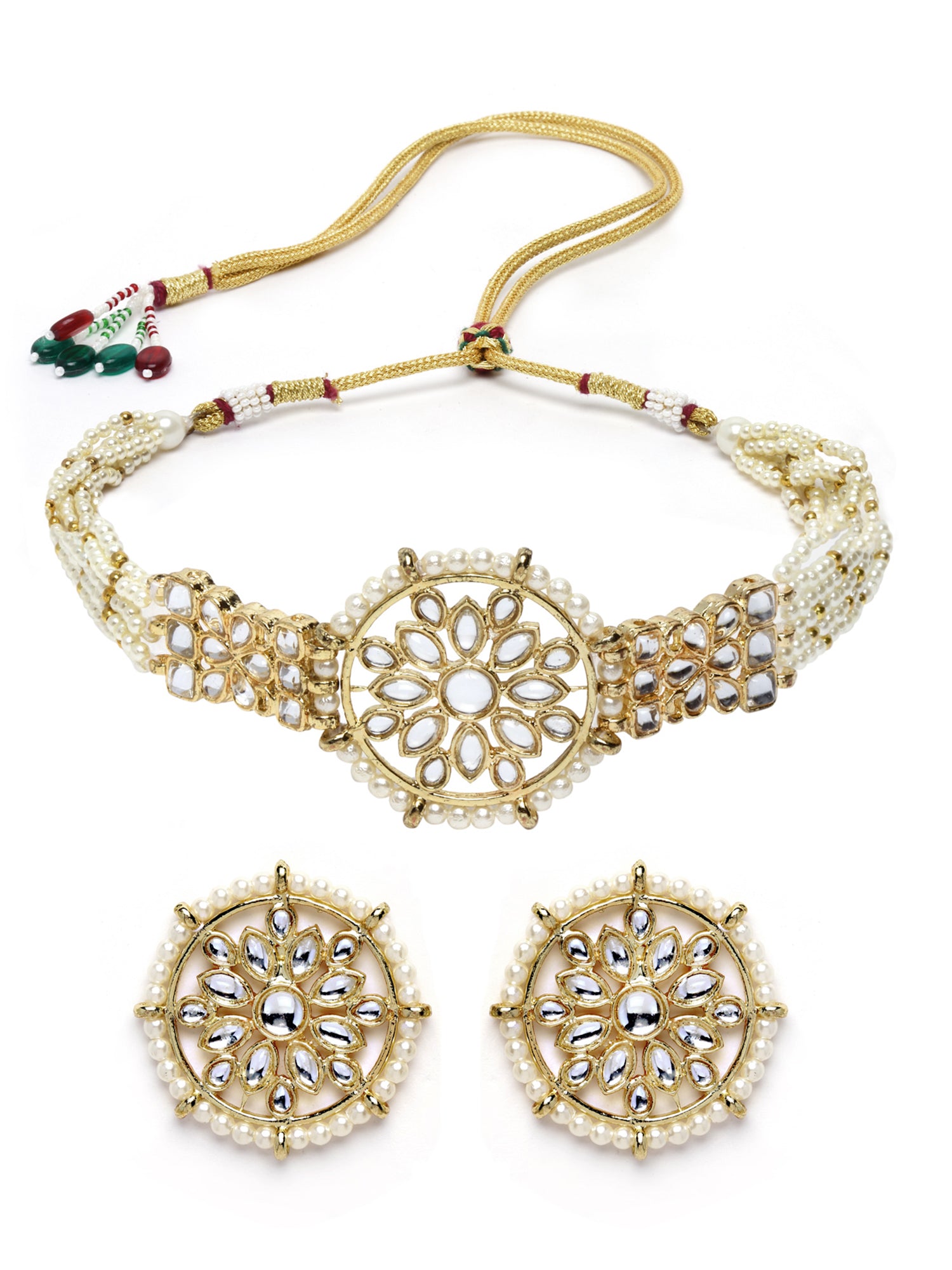 - Karatcart Gold Plated Floral Pearl Beaded Choker Necklace Set . It is made with high-quality Kundan Stones which makes them very skin-friendly. Perfect for Weddings, Parties, Festivals, and Traditional Occasions. Gracefully pair Saree, Kurti, or any Indo-western outfit to enhance your look. These are made from toxic-free materials which are Anti-Allergic and Safe for the skin.