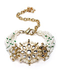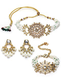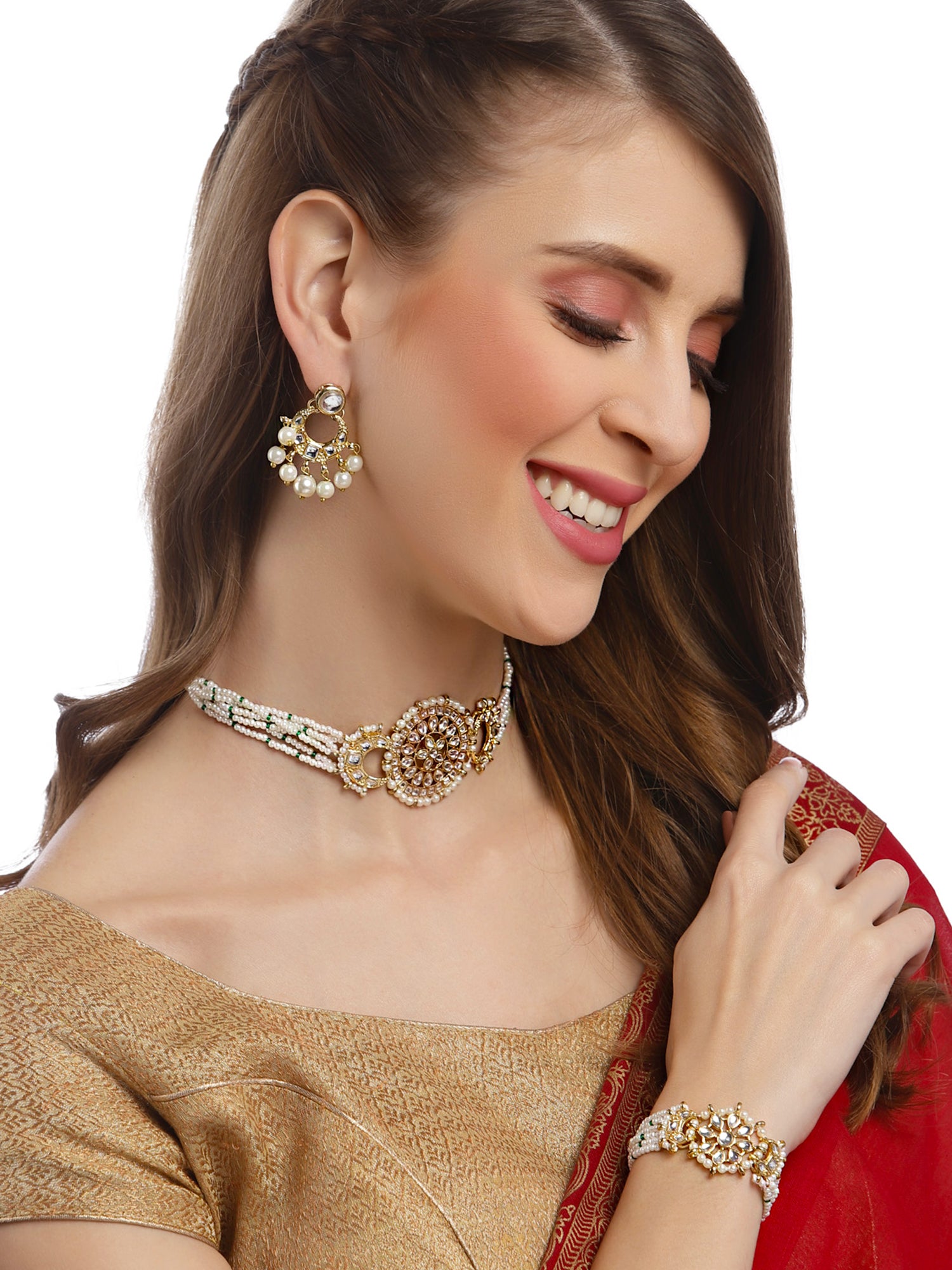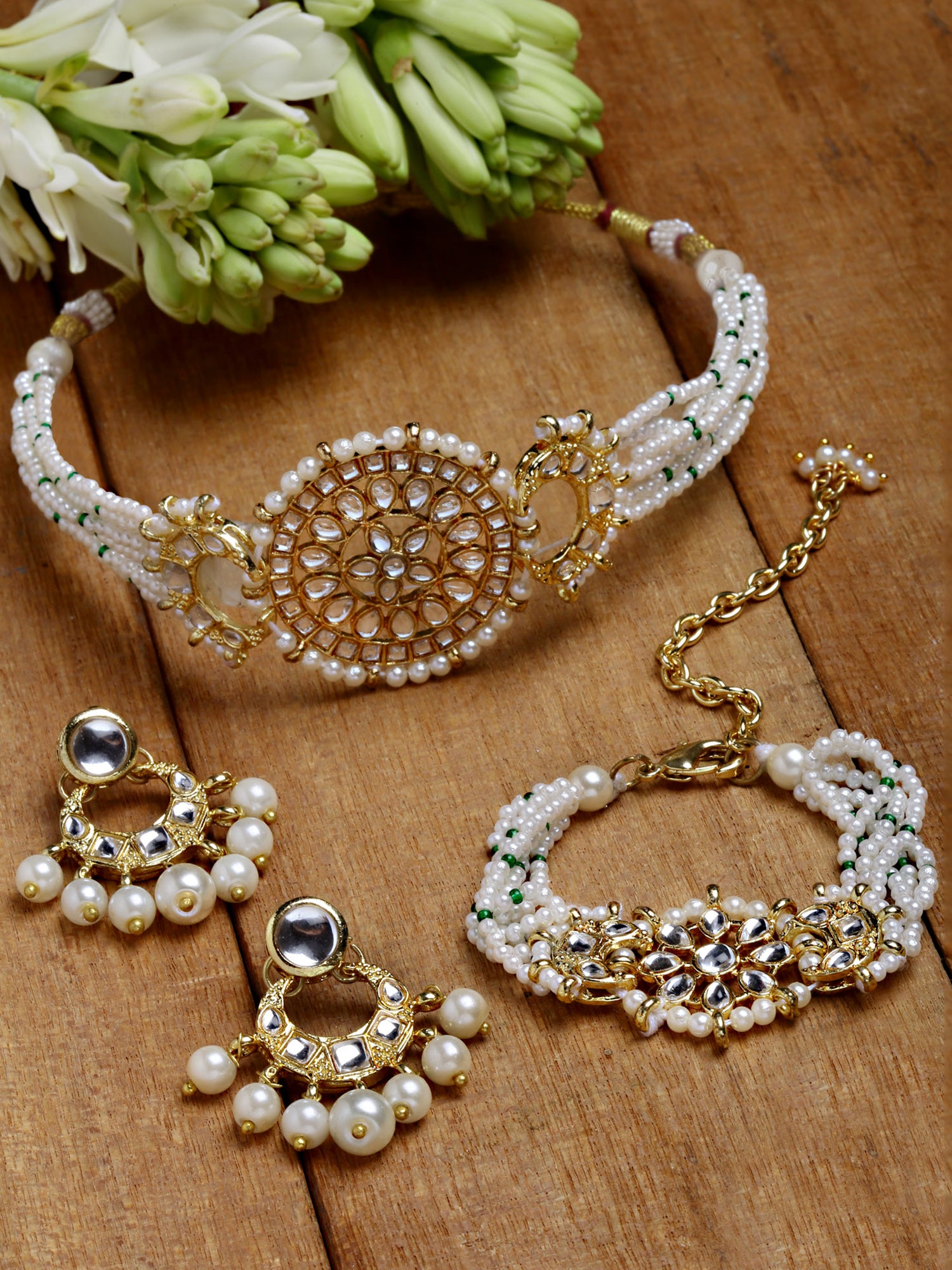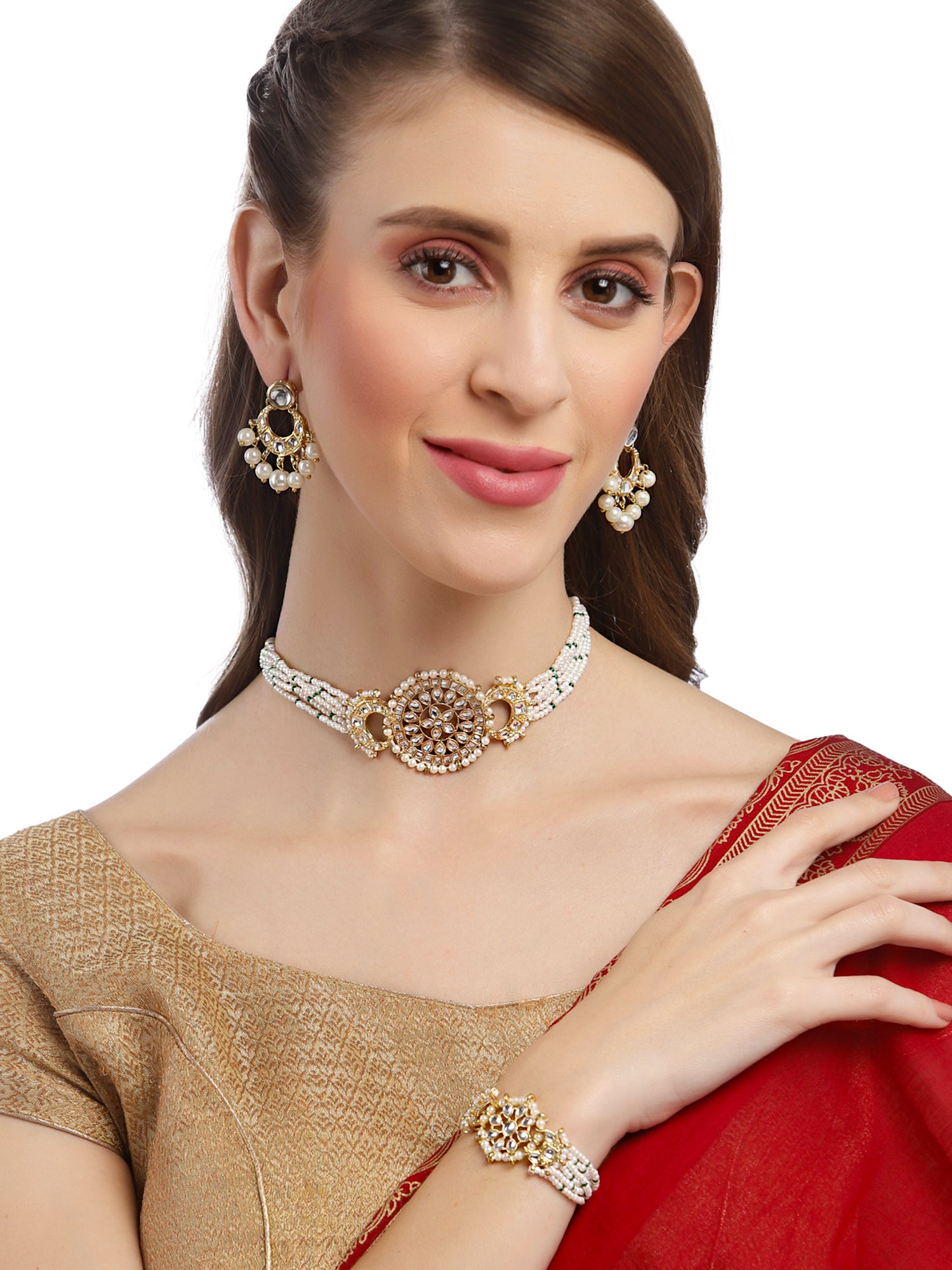 - Karatcart Gold Plated Floral and Moon Shape Pearl Beaded Choker Necklace with Earrings and Bracelet . It is made with high-quality Kundan Stones which makes them very skin-friendly. Perfect for Weddings, Parties, Festivals, and Traditional Occasions. Gracefully pair Saree, Kurti, or any Indo-western outfit to enhance your look. These are made from toxic-free materials which are Anti-Allergic and Safe for the skin.
