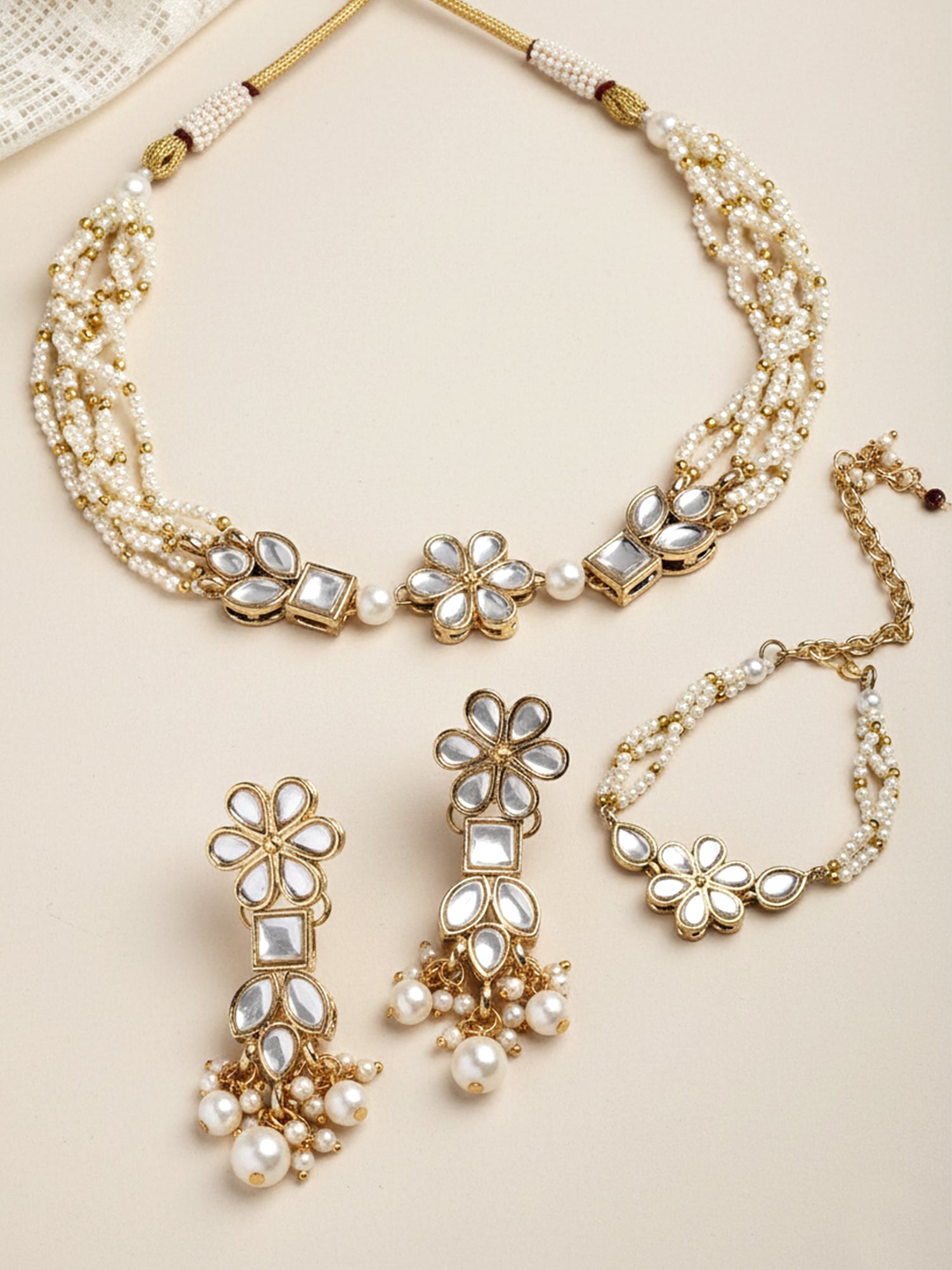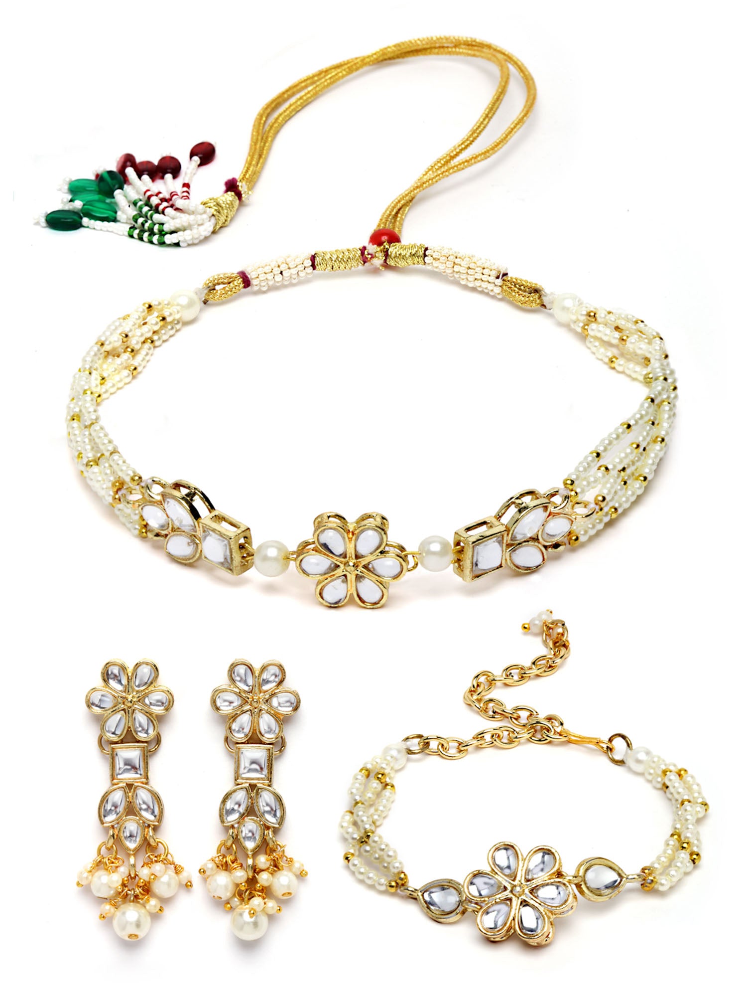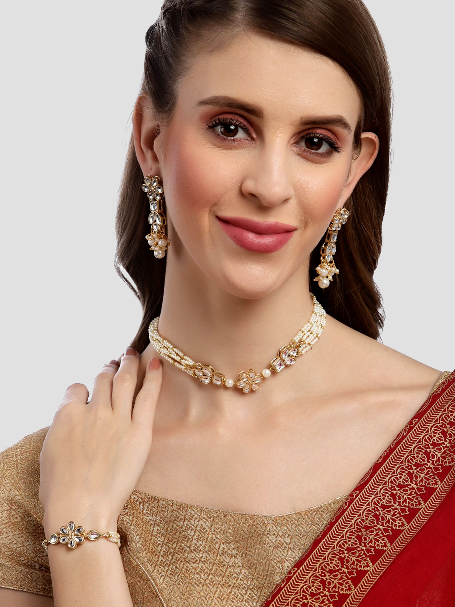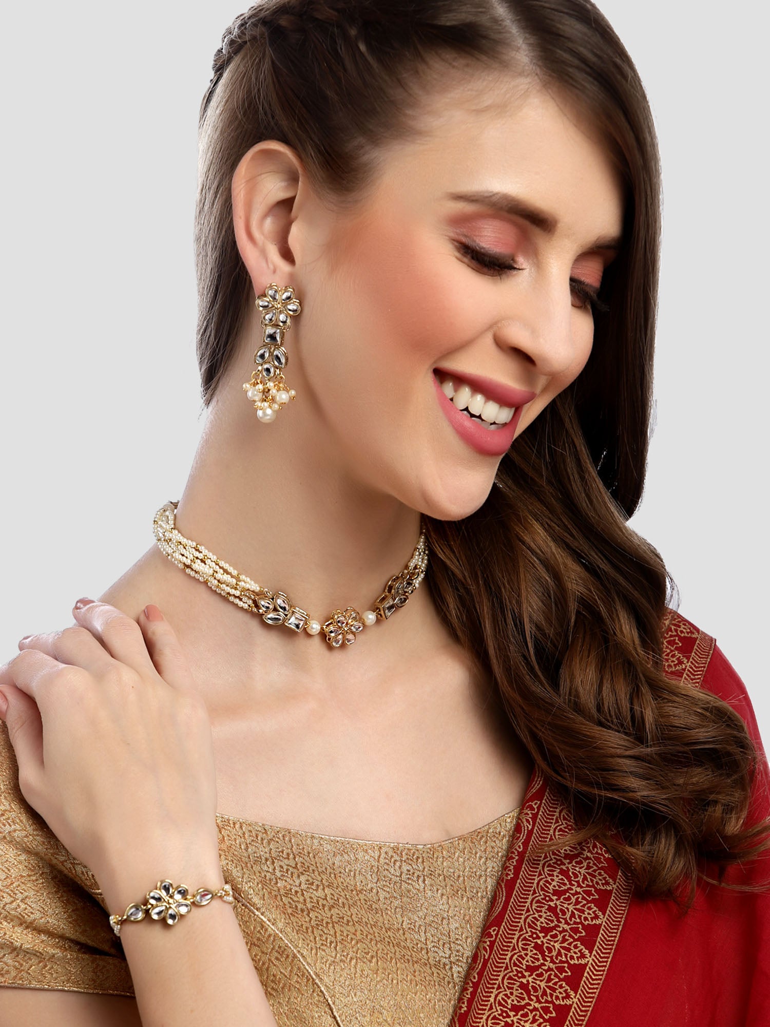 - Karatcart Gold Plated Floral Shape Pearl Beaded Choker Necklace with Earrings and Bracelet for Women. Our products are designed with high-quality Kundan Stones and these products are enhanced with plating that are skin-friendly & with love to reach your heart.