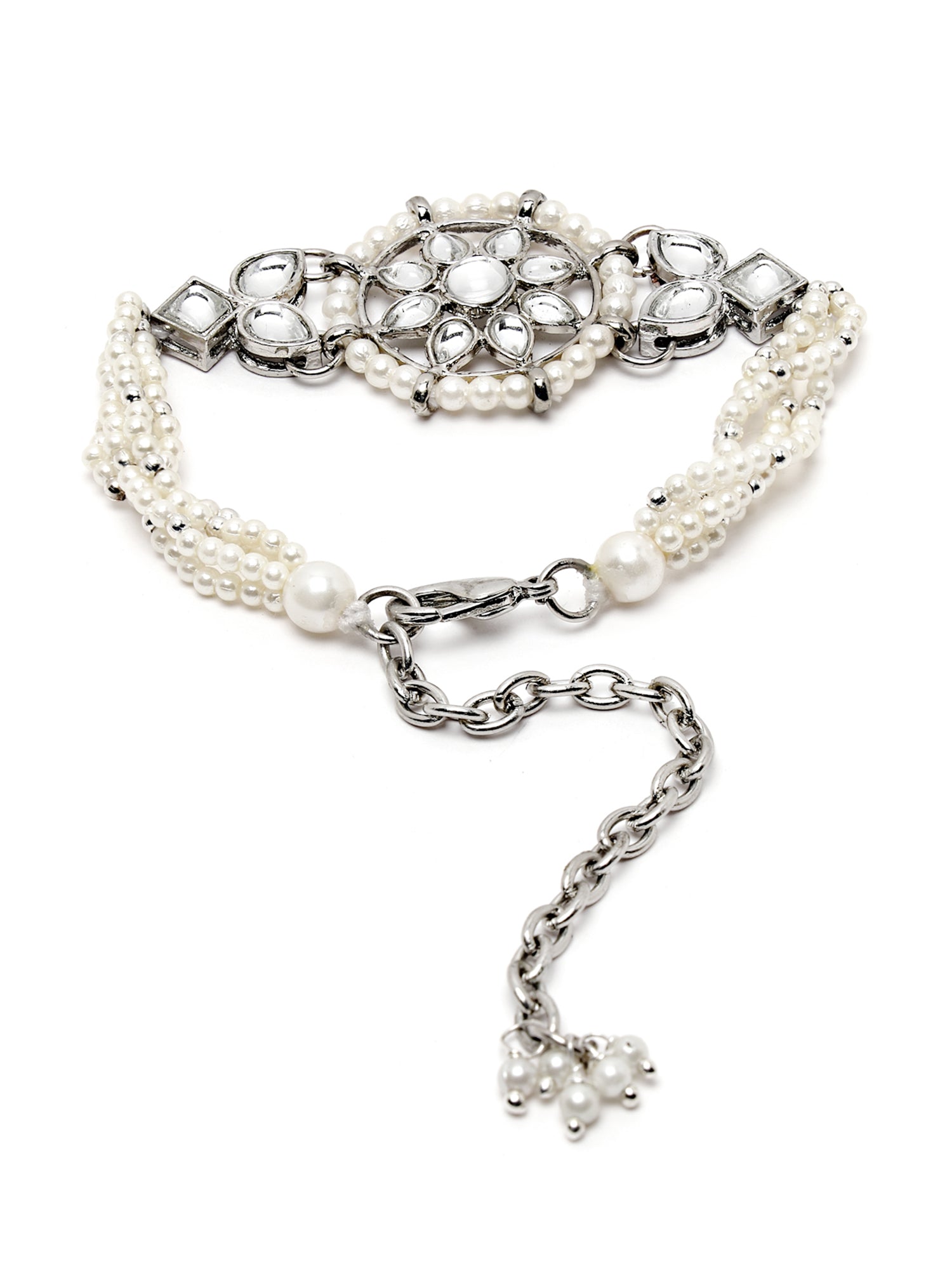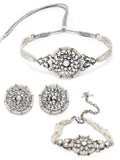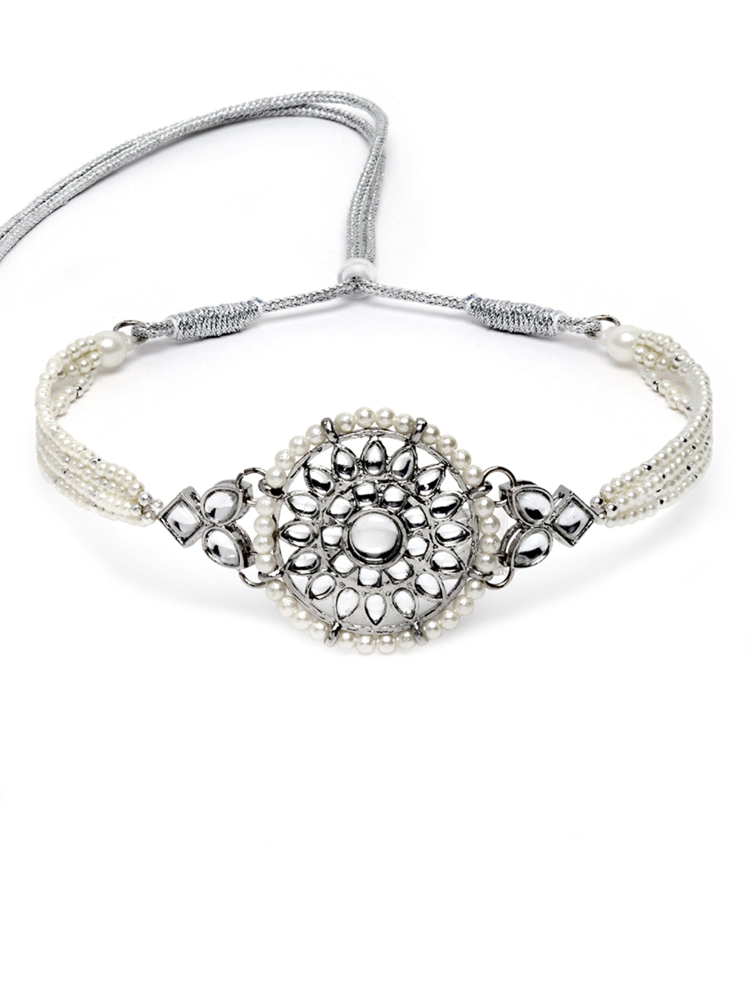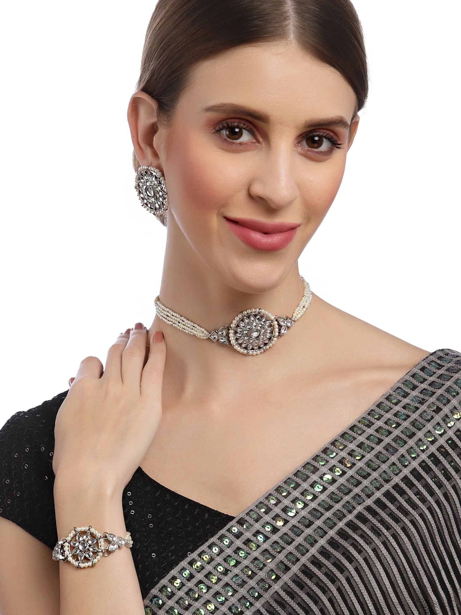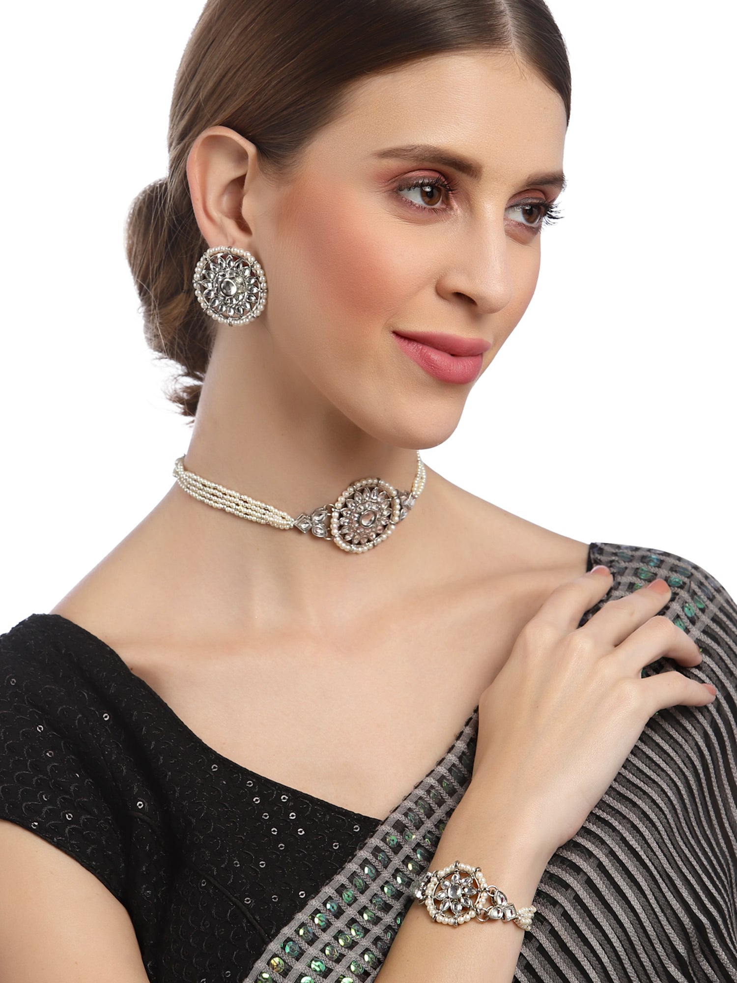 - Karatcart Oxidised Silver Floral Shape Pearl Beaded Choker Necklace with Earrings and Bracelet . It is made with high-quality Kundan Stones which makes them very skin-friendly. Perfect for Weddings, Parties, Festivals, and Traditional Occasions. Gracefully pair Saree, Kurti, or any Indo-western outfit to enhance your look. These are made from toxic-free materials which are Anti-Allergic and Safe for the skin.