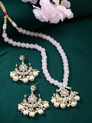 Karatcart Gold Plated Pearl and Light Pink Beads Studded Kundan Necklace Set for Women