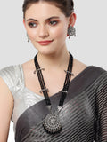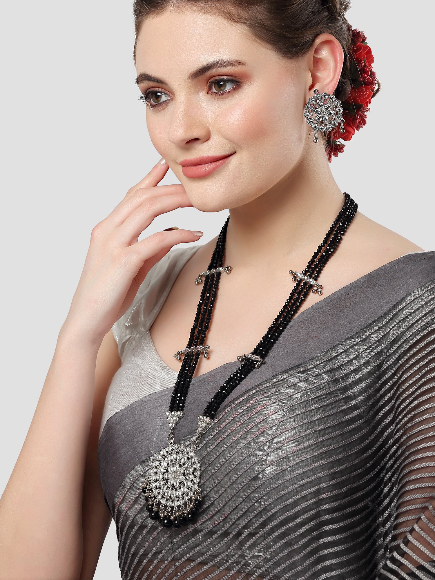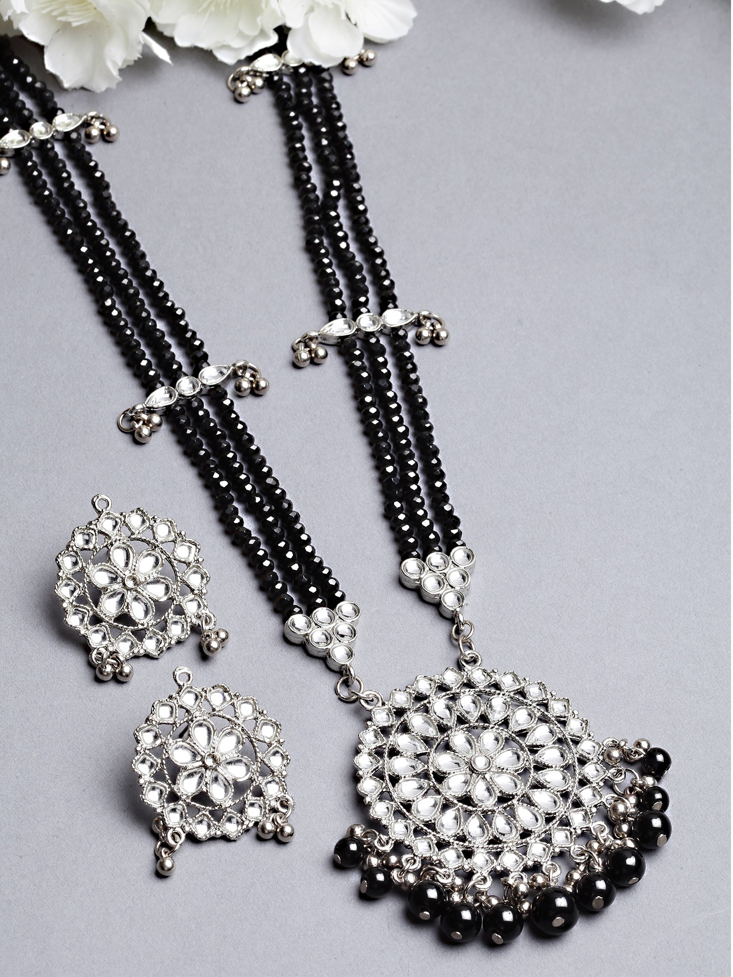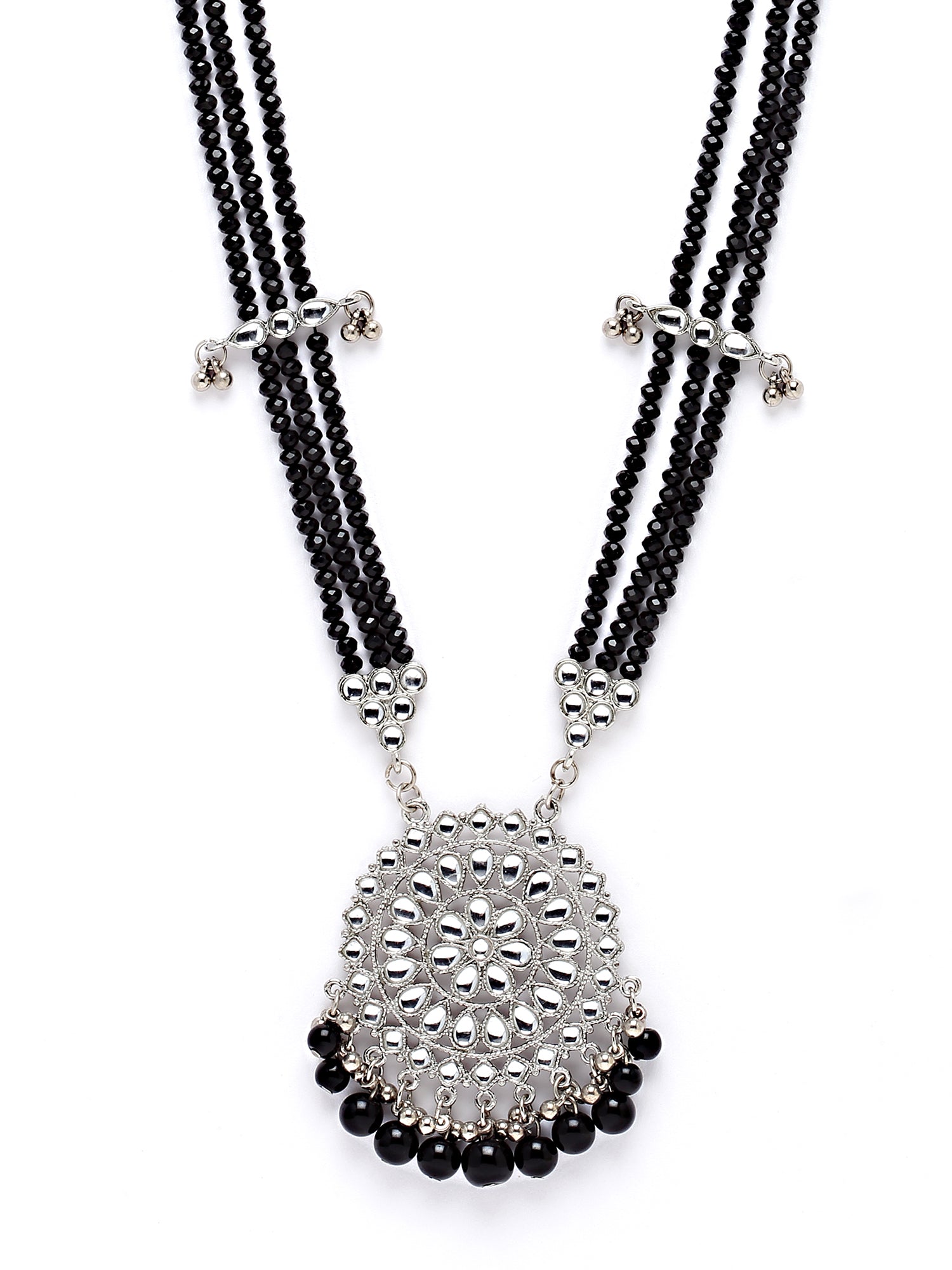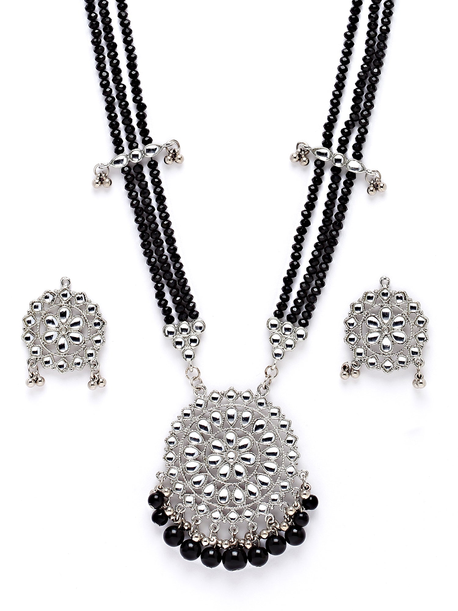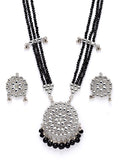 Karatcart Silver Plated Black Beads and Crystal Studded Kundan Rani-Haar Necklace Set for Women